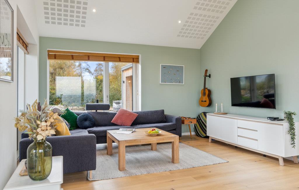 Modernes Ferienhaus mit Fjordpanorama, Strandnähe und vielfältigen Freizeitangeboten für die ganze Familie.