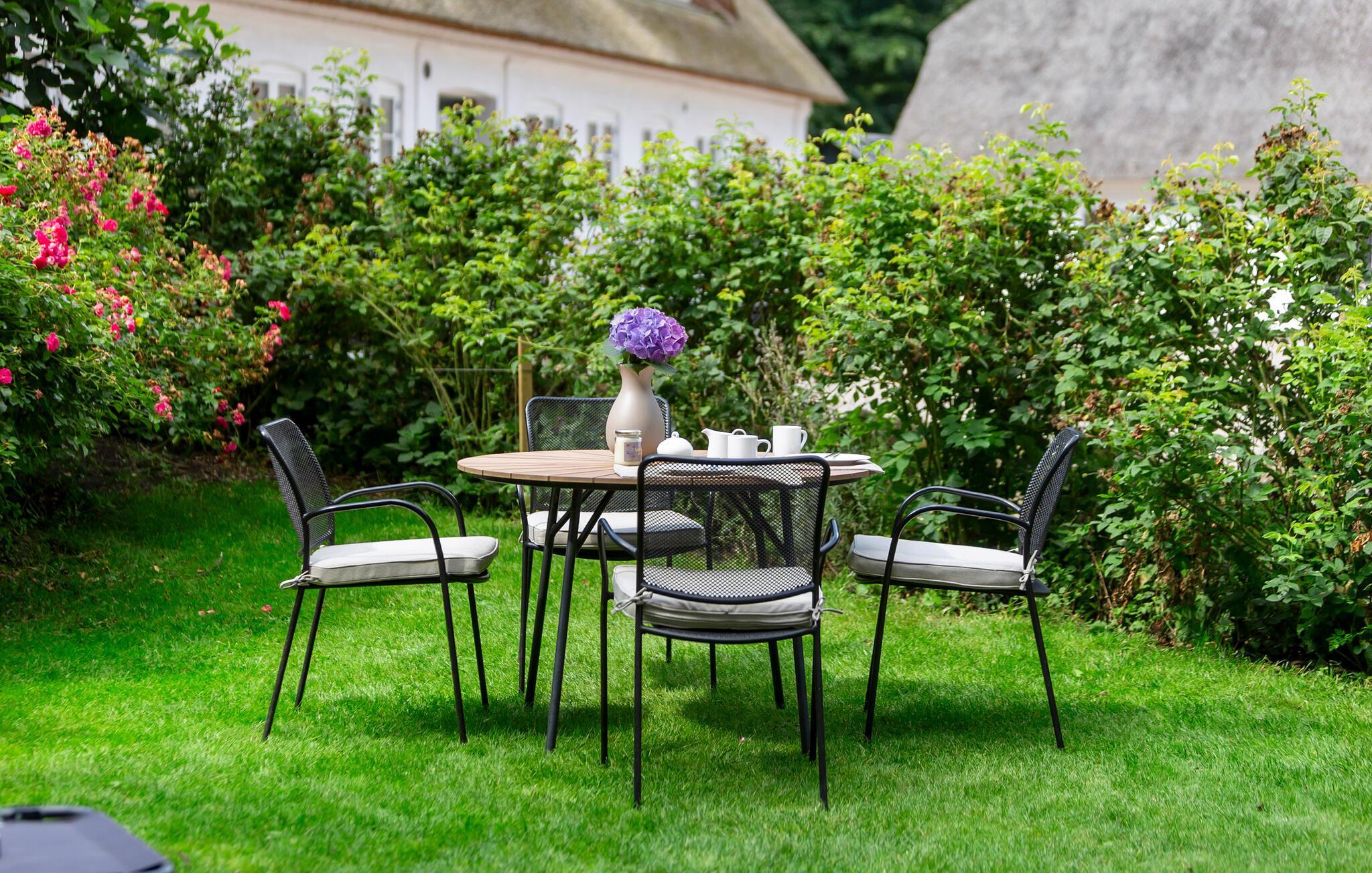 Gehen Sie hinaus in den geschützten Garten, der von Büschen und Pflanzen gesäumt ist. Ruhen Sie sich auf der Sonnenliege aus, nehmen Sie Platz am Gartentisch auf dem Rasen oder genießen Sie einen Kaffee auf der Bank vor dem Haus. Der gepflegte Außenbereich ist ideal für sonnige Stunden mit einem Buch oder einem Glas Wein.