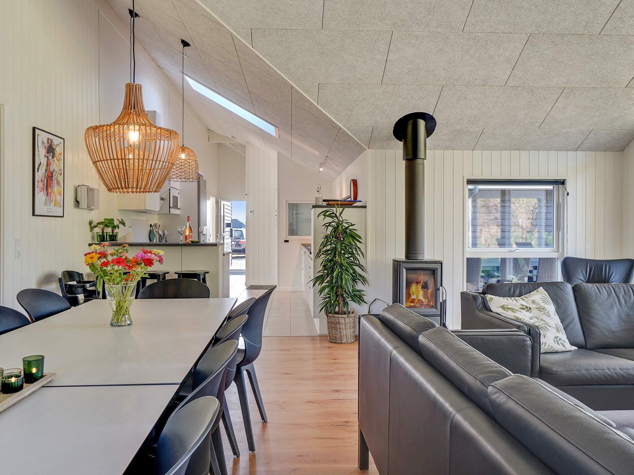 Der große Wohnbereich bietet viel Platz für gemeinsame Aktivitäten und gemütliche Stunden am Esstisch oder vor dem Holzofen. Im offenen Anschluss an den Wohnbereich findet man die gut ausgestattete Küche mit u.a. zwei Backöfen, von der aus man am Geschehen im Wohnbereich teilnehmen kann.