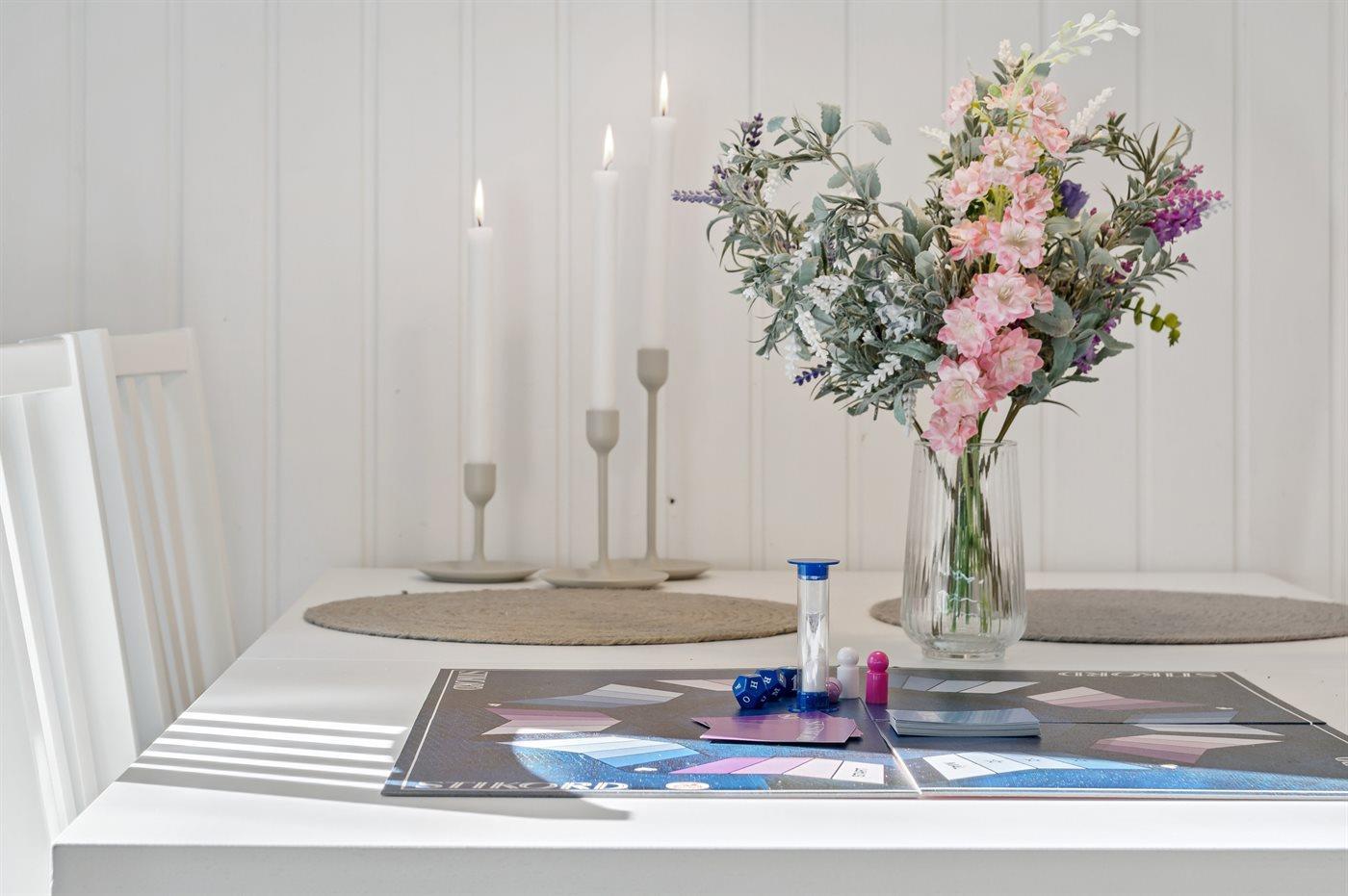 Das Haus ist mit einem hellen Wohnzimmer, das in offener Verbindung zur Küche liegt, zwei Schlafzimmern und einem Badezimmer mit Dusche eingerichtet. Vom Haus aus hast du direkten Zugang zu einer überdachten Terrasse und dem Garten.