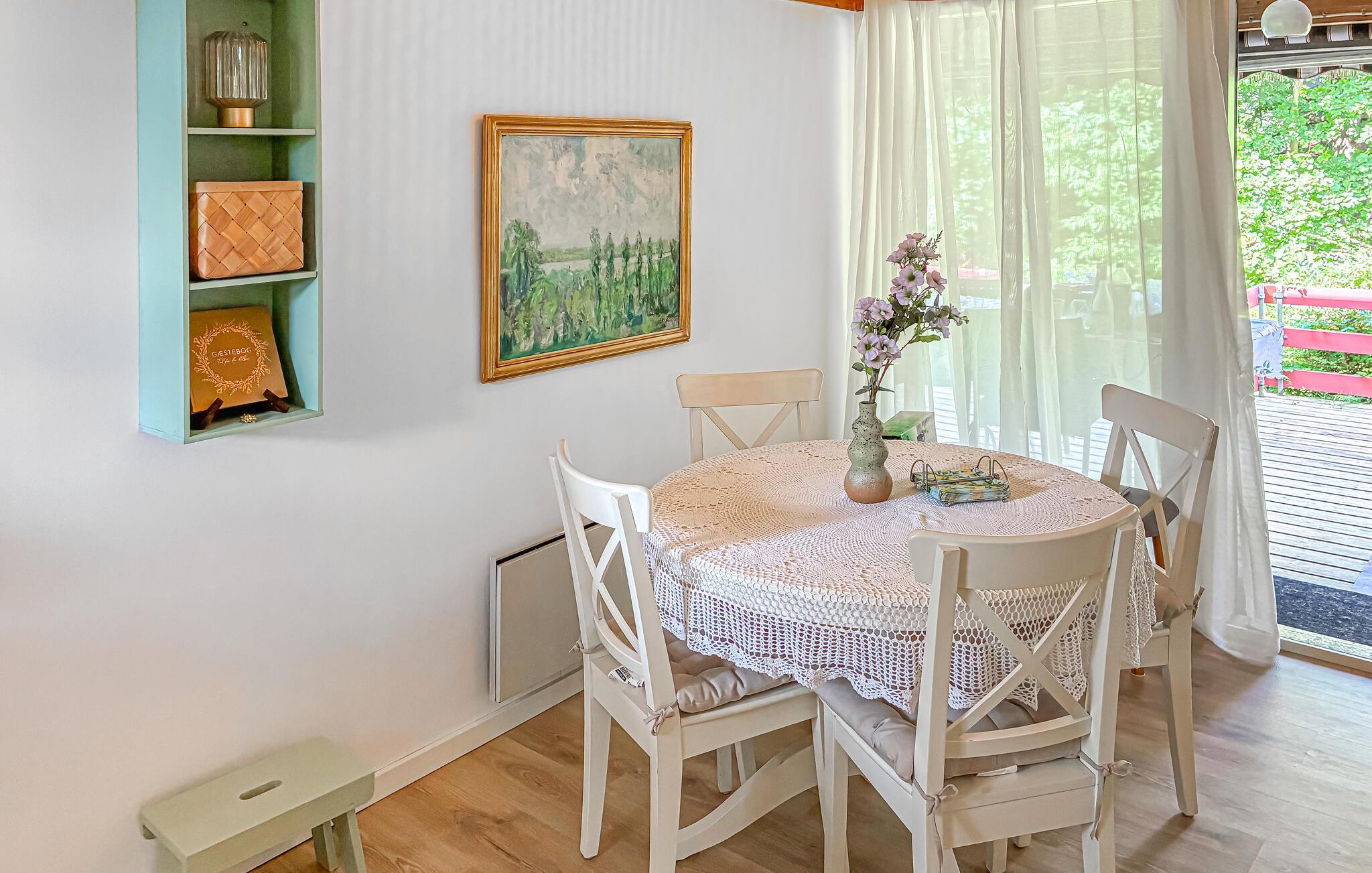 Genießen Sie eine Auszeit in diesem einfachen Ferienhaus, das Ihnen die Möglichkeit bietet, in ruhiger Umgebung Zeit miteinander zu verbringen. Im Wohnbereich empfangen Sie eine Sofaecke, ein Fernseher und eine kleine Auswahl an Sitzmöbeln, die zu gemütlichen Abenden einladen. Nutzen Sie die praktische Küche, um Ihre Urlaubsmahlzeiten zuzubereiten, und genießen Sie diese am Esstisch im Wohnraum.