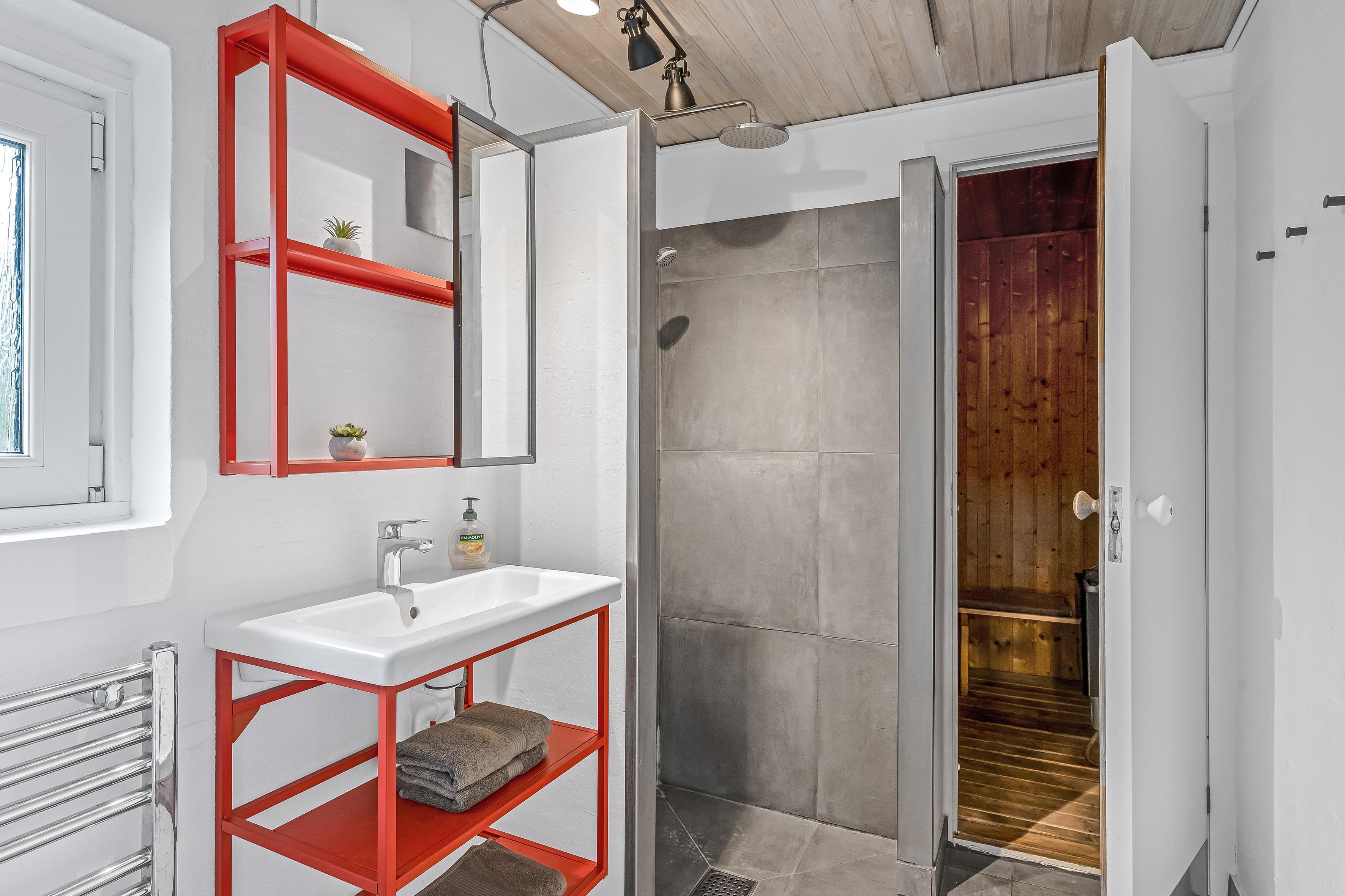 Das Herzstück des Hauses ist der offene Wohn- und Essbereich, in dem Küche, Essbereich und Wohnzimmer miteinander verschmelzen. Hier können Sie gemeinsam Zeit verbringen, während einige das moderne Küchenequipment nutzen, während andere sich vor dem Kaminofen entspannen. Eine energieeffiziente Wärmepumpe sorgt für ein angenehmes Raumklima. Es gibt außerdem zwei Badezimmer mit Fußbodenheizung.