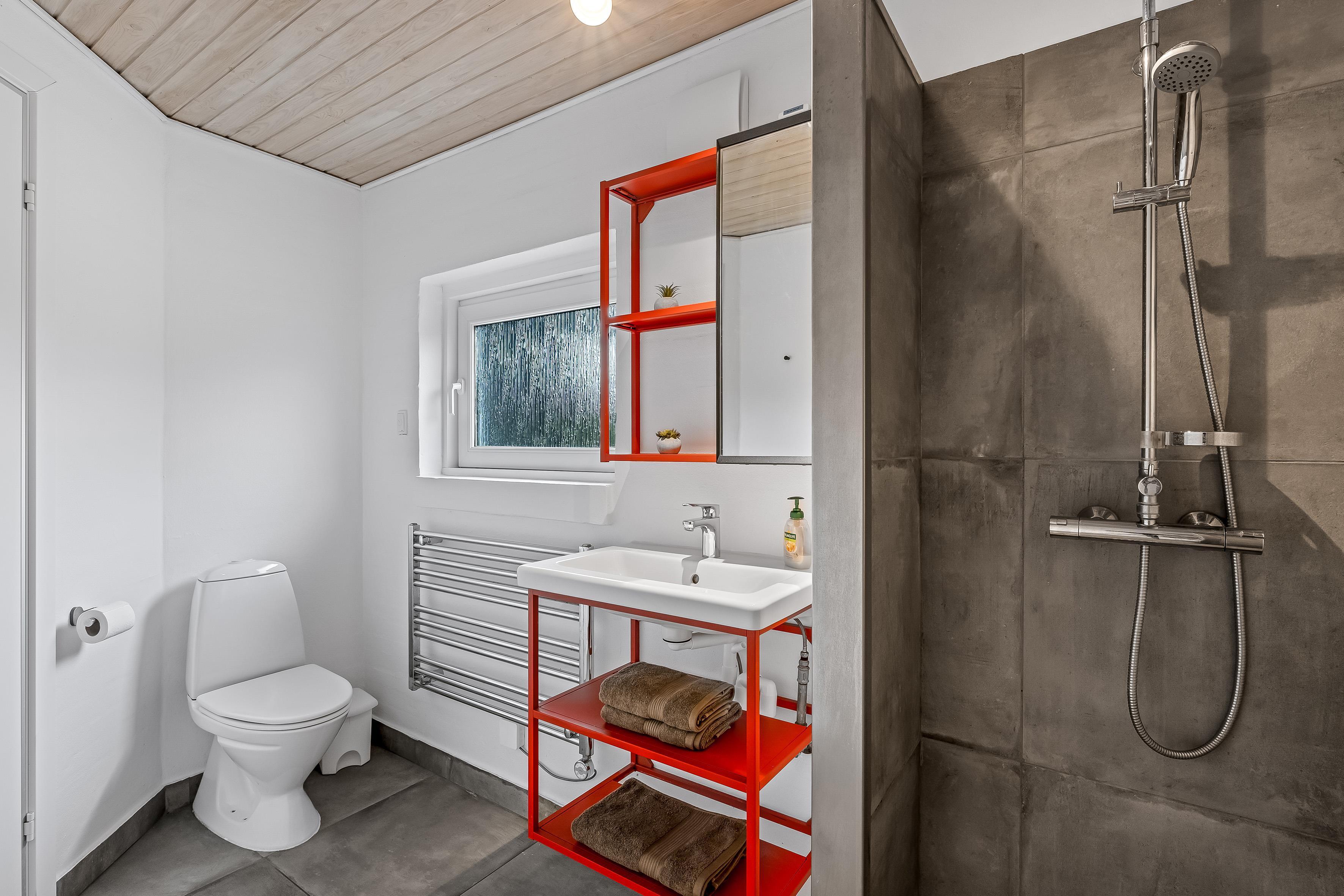 Badezimmer mit Toilette, Dusche und Waschbecken