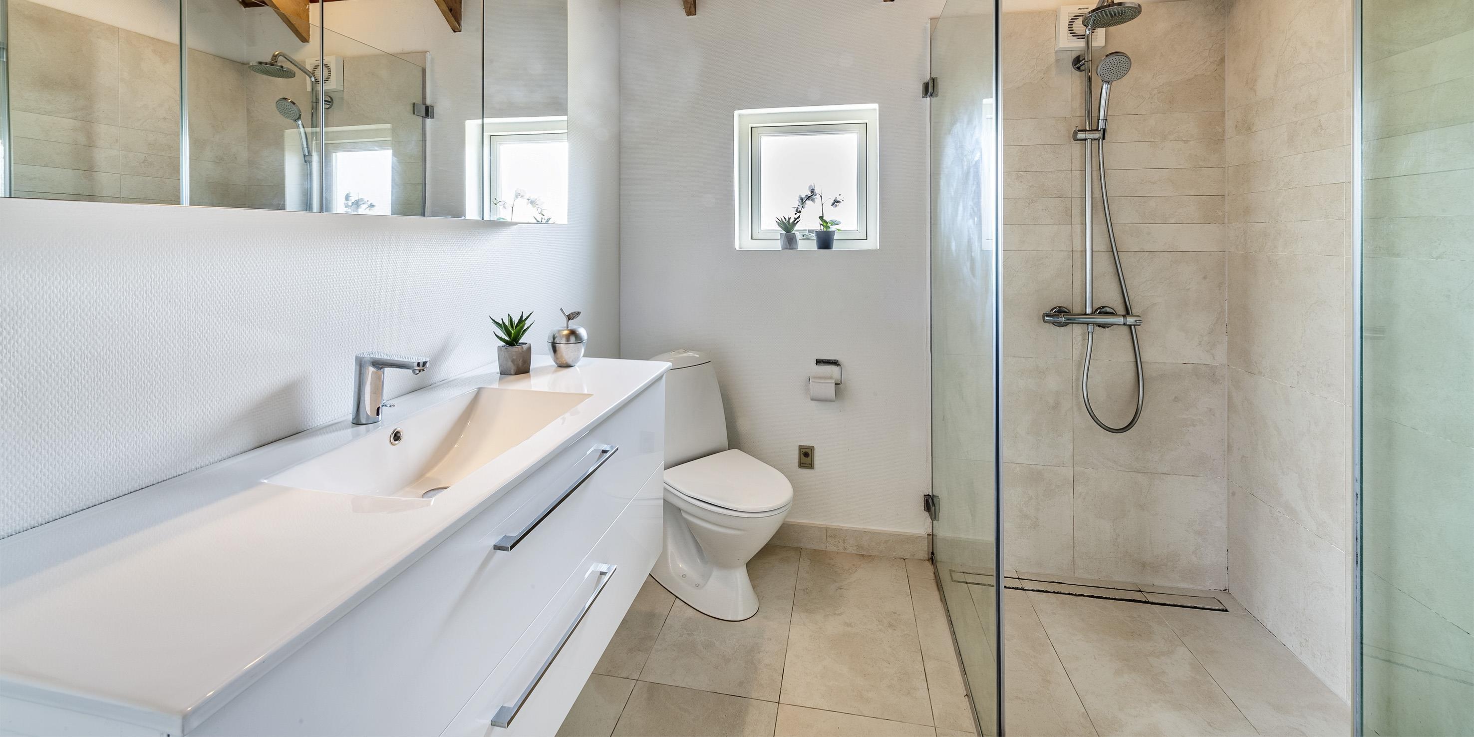 Badezimmer mit Toilette, Dusche und Waschbecken