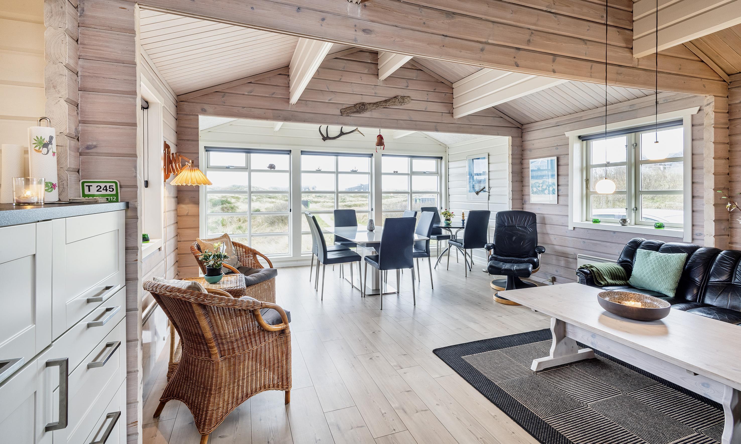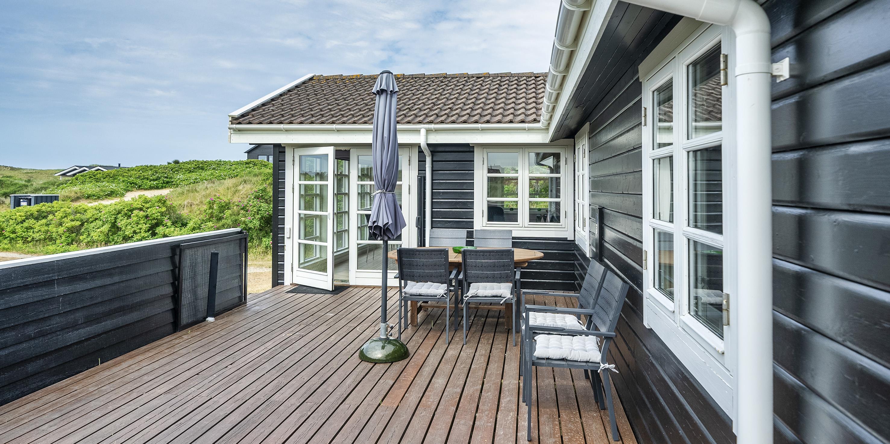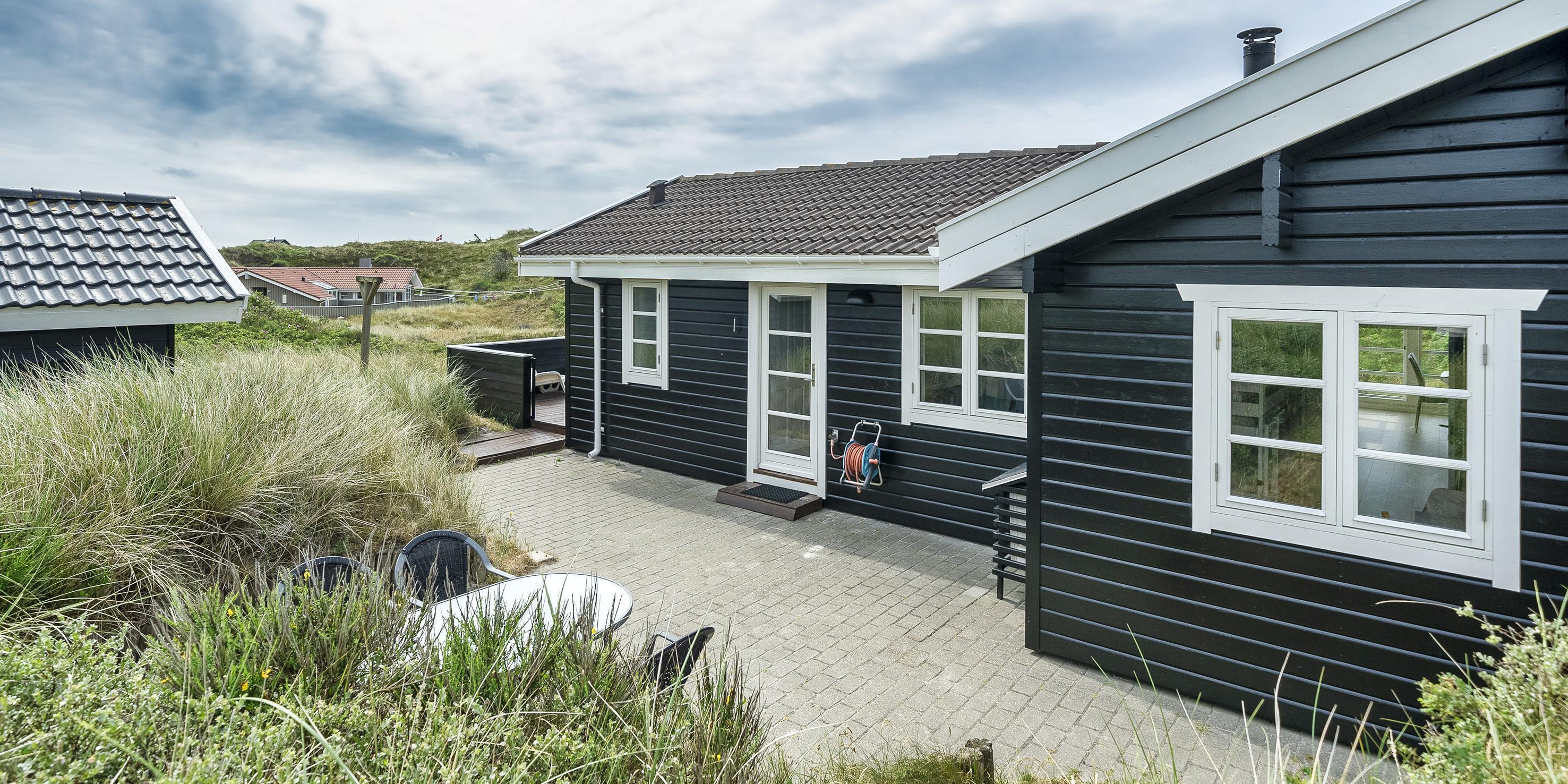 Charmant eingerichtetes Ferienhaus auf einem wunderschönen Dünengrundstück gelegen. Das Feierhaus ist für 6 Personen ausgestattet und weniger als 100 Meter vom Strand entfernt. Im Wohnbereich ist eine gemütliche große Leder-Rundsitzecke aufgestellt und ein Kamin. Es befindet sich eine Warmepumpe im Ferienhaus. Mit dieser Warmepumpe haben sie die Möglichkeit die Stromkosten zu senken, denn die Warmepumpe ist energiesparend. Ein Fernsehgerät ist in einem separaten Zimmer aufgestellt. Die deutschen Programme empfangen Sie über eine Parabolantenne. Der Essbereich befindet sich vor einer großen Fensterfront. Von hier haben Sie auch einen tollen Ausblick auf die Dünen. Im gesamten Wohn-, Ess- und Küchenbereich ist ein schicker Holzfußboden verlegt. In einer Ecke im Wohnbereich ist eine kleine Leseecke mit zwei Rattansesseln eingerichtet. Die Küche ist modern und hat einen Herd mit Cerankochfeld, ein Backofen, eine Geschirrspülmaschine und eine Kühl- und Gefrierkombination. Mikrowelle im Abstellraum. Das Badezimmer ist mit einem WC, einem Handwaschbecken und einer Dusche ausgestattet. Eine Handtuchhaltereizung ist ebenfalls installiert. Insgesamt befinden sich drei Schlafzimmer im Ferienhaus: DB + 2B + 2B. Eine hat ein Doppelbett, eines hat zwei Einzelbetten und eines hat Etagenbetten. Eine Waschmaschine steht den Gästen auch zur Verfügung. Das Ferienhaus verfügt über einen Internetanschluss (W-Lan). Ein großzügiger Terrassenbereich steht Ihnen für Ihr Sonnenbad oder Ihre Kaffeetafel zur Verfügung. Schaukel. Hinterm Haus steht eine kleine Sitzgruppe vor einer Düne zum ausruhen bereit. Es ist max. ein Haustier erlaubt. Freie Das Ferienhaus ist 1983 erbaut worden. Gratis Eintritt für das Badeland in Varde in 2025. Das Rauchen ist nicht gestattet. Renoviert 2010.