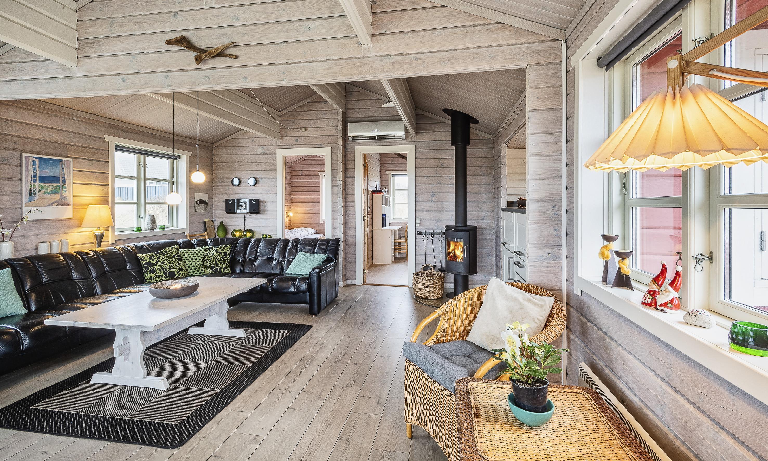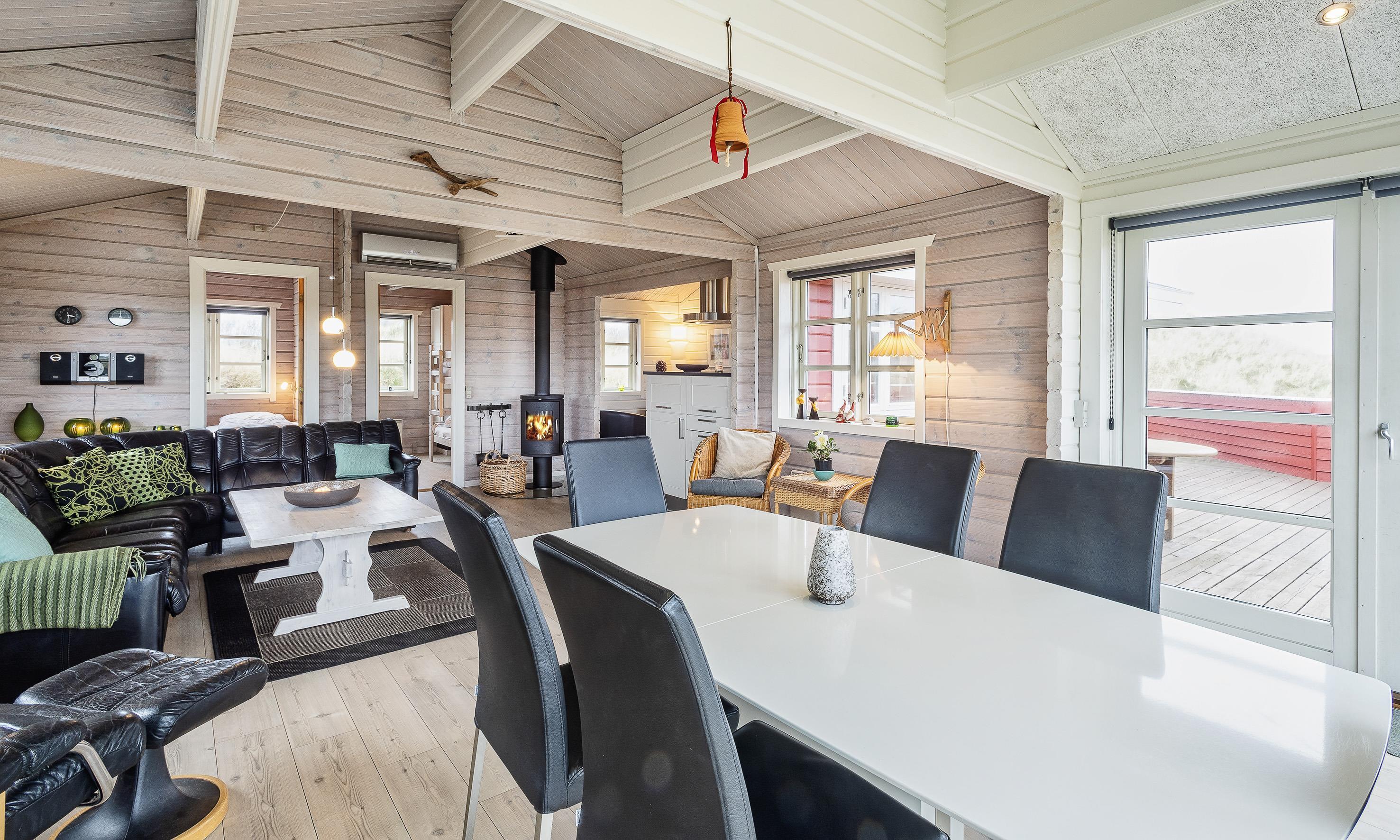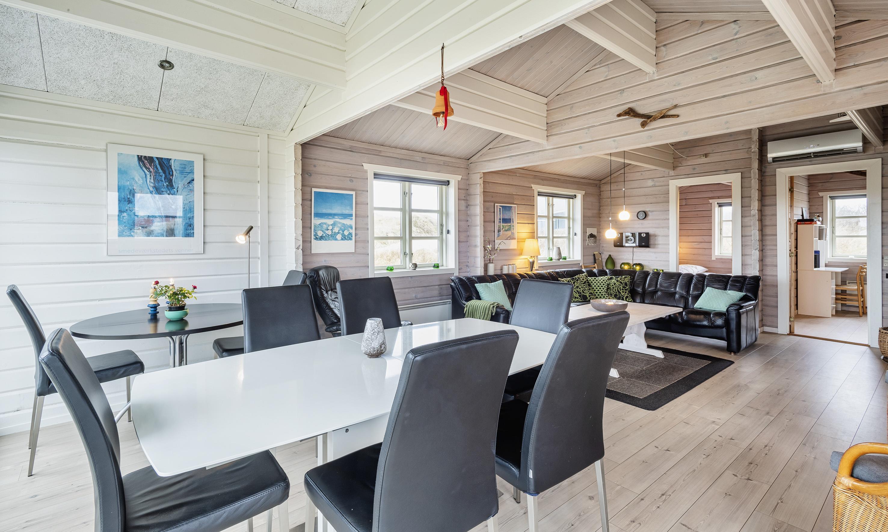 Charmant eingerichtetes Ferienhaus auf einem wunderschönen Dünengrundstück gelegen. Das Feierhaus ist für 6 Personen ausgestattet und weniger als 100 Meter vom Strand entfernt. Im Wohnbereich ist eine gemütliche große Leder-Rundsitzecke aufgestellt und ein Kamin. Es befindet sich eine Warmepumpe im Ferienhaus. Mit dieser Warmepumpe haben sie die Möglichkeit die Stromkosten zu senken, denn die Warmepumpe ist energiesparend. Ein Fernsehgerät ist in einem separaten Zimmer aufgestellt. Die deutschen Programme empfangen Sie über eine Parabolantenne. Der Essbereich befindet sich vor einer großen Fensterfront. Von hier haben Sie auch einen tollen Ausblick auf die Dünen. Im gesamten Wohn-, Ess- und Küchenbereich ist ein schicker Holzfußboden verlegt. In einer Ecke im Wohnbereich ist eine kleine Leseecke mit zwei Rattansesseln eingerichtet. Die Küche ist modern und hat einen Herd mit Cerankochfeld, ein Backofen, eine Geschirrspülmaschine und eine Kühl- und Gefrierkombination. Mikrowelle im Abstellraum. Das Badezimmer ist mit einem WC, einem Handwaschbecken und einer Dusche ausgestattet. Eine Handtuchhaltereizung ist ebenfalls installiert. Insgesamt befinden sich drei Schlafzimmer im Ferienhaus: DB + 2B + 2B. Eine hat ein Doppelbett, eines hat zwei Einzelbetten und eines hat Etagenbetten. Eine Waschmaschine steht den Gästen auch zur Verfügung. Das Ferienhaus verfügt über einen Internetanschluss (W-Lan). Ein großzügiger Terrassenbereich steht Ihnen für Ihr Sonnenbad oder Ihre Kaffeetafel zur Verfügung. Schaukel. Hinterm Haus steht eine kleine Sitzgruppe vor einer Düne zum ausruhen bereit. Es ist max. ein Haustier erlaubt. Freie Das Ferienhaus ist 1983 erbaut worden. Gratis Eintritt für das Badeland in Varde in 2025. Das Rauchen ist nicht gestattet. Renoviert 2010.