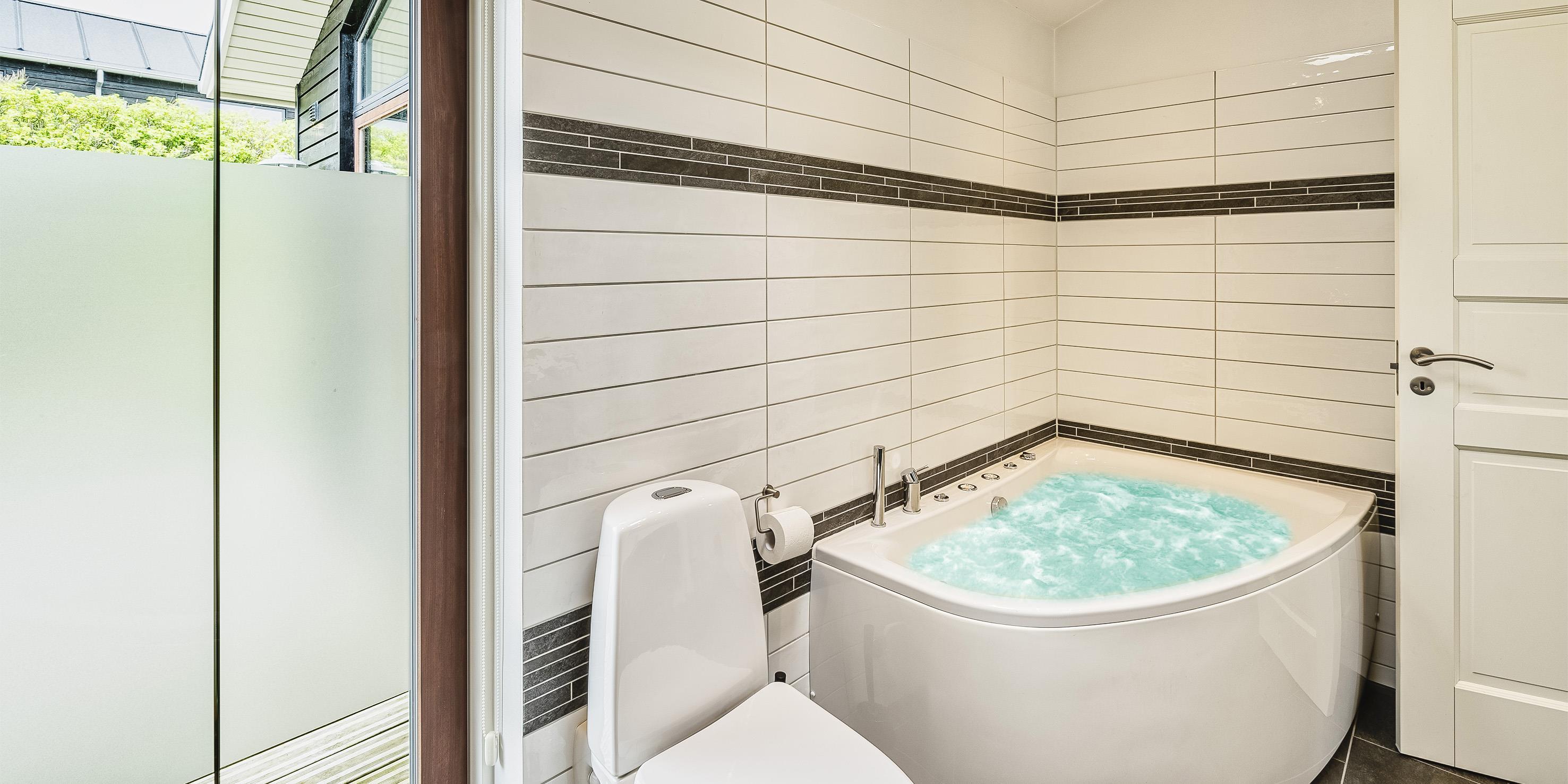 Badezimmer mit Toilette, Dusche und Waschbecken