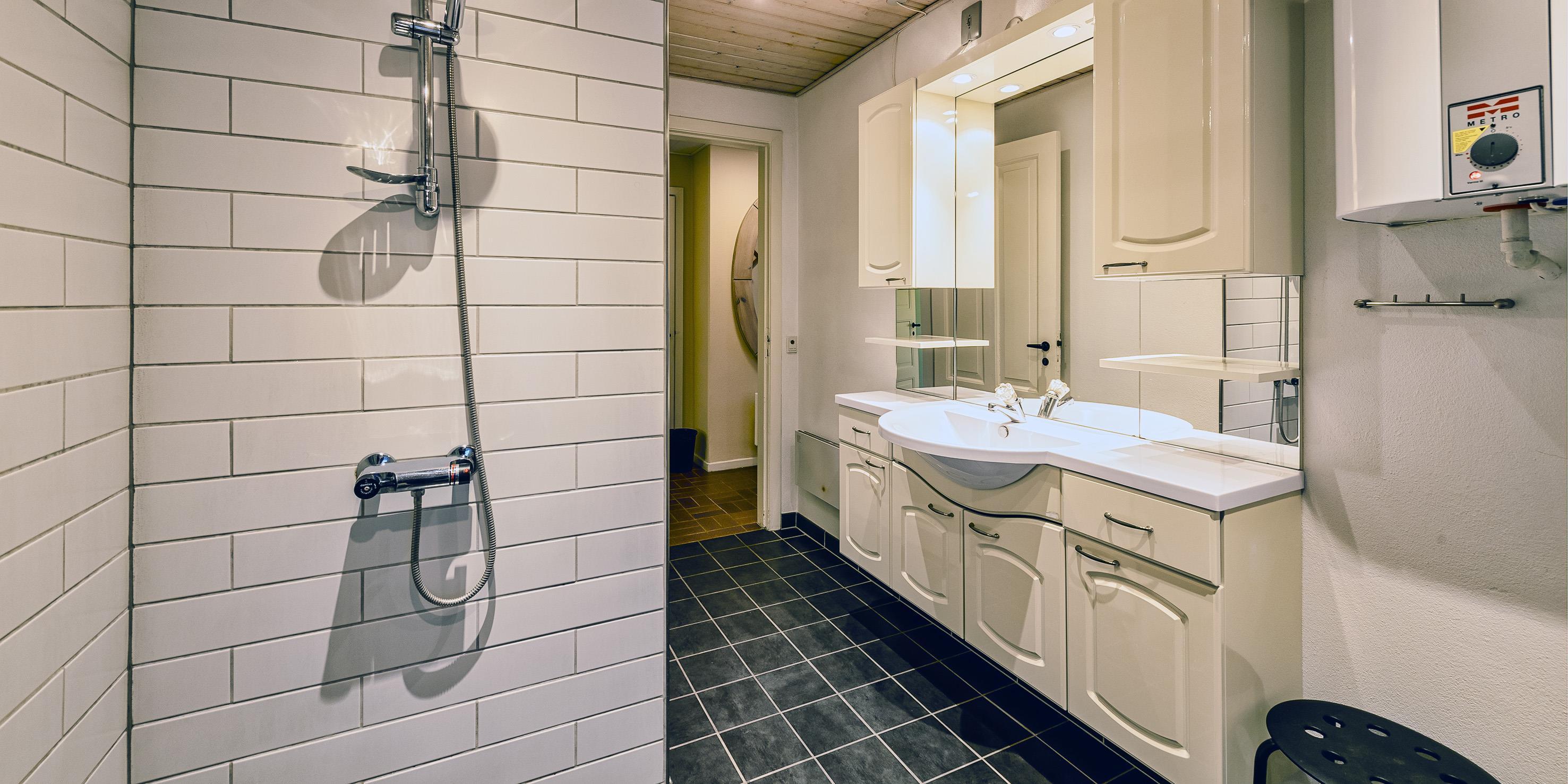 Badezimmer mit Toilette, Dusche und Waschbecken