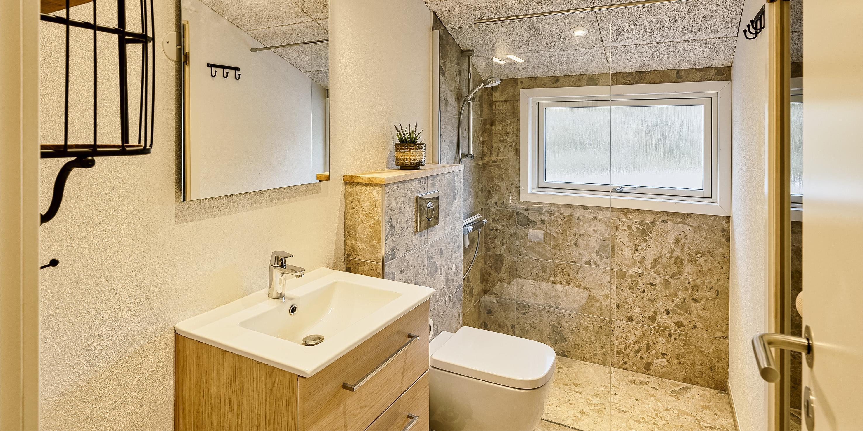 Badezimmer mit Toilette, Dusche und Waschbecken