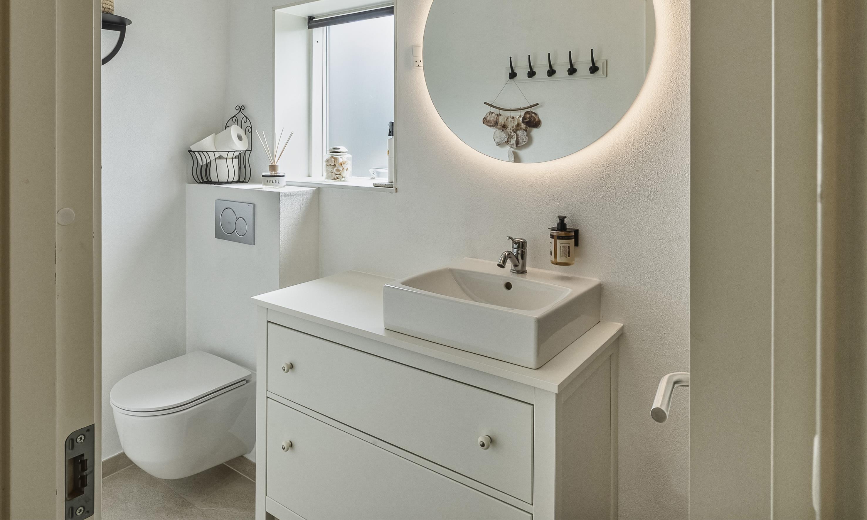 Badezimmer mit Toilette, Dusche und Waschbecken