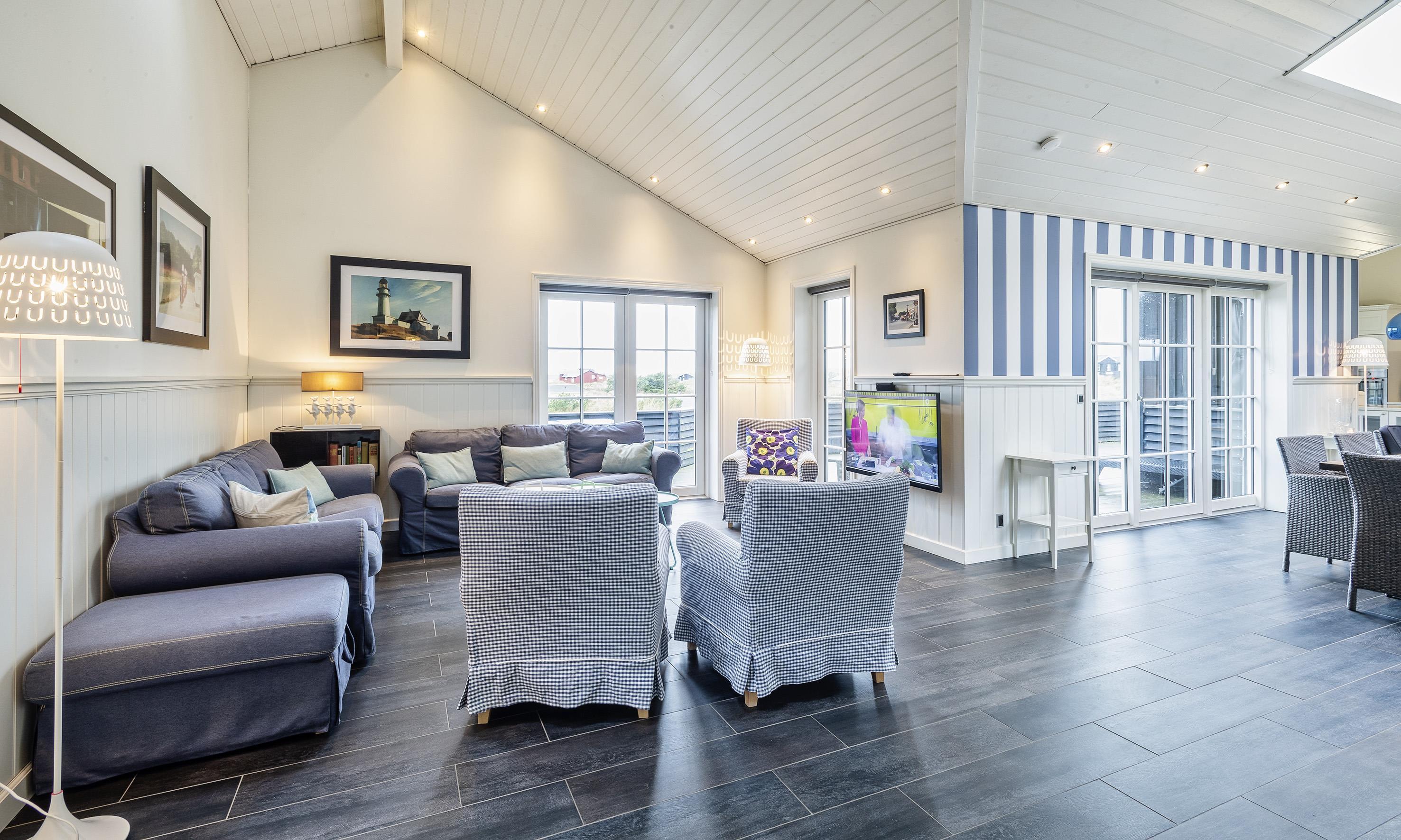 Der Wohn- und Essbereich bietet viel Platz für die 8 Personen und ist hell und freundlich ausgestattet. Im gemütlichem Wohnbereich kann man das Knistern des Holzes im Kamin beobachten. Der Kamin gibt eine wohlige Wärme ab. Das ganze Ferienhaus verfügt über Fußbodenheizung. Deutsches Fernsehprogramm ist über eine Parabol-Antenne zu empfangen, ebenso können dänische Programme empfangen werden. Der Essbereich ist mit einem Oberlicht versehen und daher licht durchflutet. Die offene Wohnküche verfügt über einen Herd mit Cerankochfeld und einem Backofen in Arbeitshöhe, einer Kühl- u. Gefrierkombination. Es befinden sich 2 Badezimmer im Ferienhaus. Beide sind mit einem Handwaschbecken, einer Dusche und einem WC ausgestattet. In einem der Badezimmer ist eine Sauna und ein Whirlpool vorhanden. 4 große Schlafzimmer: DB + DB + DB + DB.