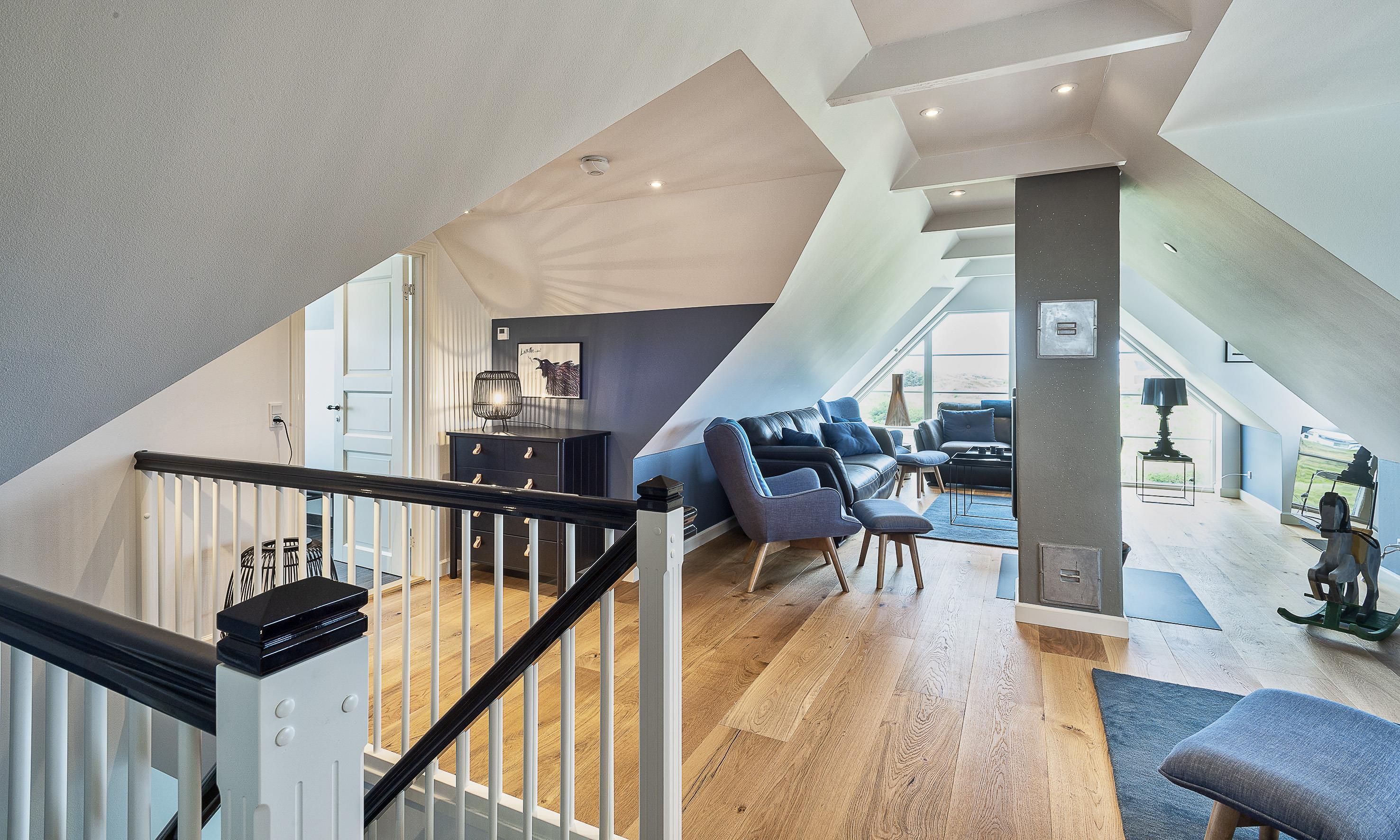 Geschmackvolles, reetgedecktes Ferienhaus über drei Etagen. Es ist für 8 Personen ausgestattet. Das Ferienhaus befindet sich auf einem ca. 3200 qm grossem Dünengrundstück. Über eine lange Treppe gelangen Sie zu diesen Ferienhaus. Der Strand ist ca. 200 vom Haus entfernt. Im Erdgeschoss befinden sich der Eingangsbereich und ein grosszügiger Küchenbereich mit Zugang zum Wintergarten. Hier in dem Wintergarten befindet sich ein Kaminofen, der eine gemütliche Wärme ausstrahlt. Im ganzen Ferienhaus ist eine Fussbodenheizung verlegt. Diese wird mit einer Luft/Warme Anlage betrieben, dadurch ist es im Verbrauch sehr energiesparend. Der Küchenbereich ist mit einem Herd mit Cerankochfeld, einem Backofen in arbeitshöhe, einer Geschirrspülmaschine und einer Kühl- und Gefrierkombination ausgestattet. 4 Schlafzimmer: DB + DB + DB + DB.Desweiteren gibt es auf dieser Ebene ein Badezimmer und drei Schlafzimmer mit je einem Doppelbett (2 mal 90 x 200 Betten). Das Badezimmer verfügt über ein Handwaschbecken, einem WC und einer Dusche. Über eine schöne Holztreppe gelangen Sie dann ins Obergeschoss und befinden sich dann gleich in den schönen Wohnbereich, der Ihnen einen tollen Panoramablick durch die grosse Fensterfront bietet. Sie können hier diesen tollen Ausblick richtig geniessen. Dazu den zweiten Kamin angeheizt, können Sie richtig entspannen. Das ist Erholung pur. Das Fernsehprogramm empfangen Sie über eine Parabolantenne (es gibt allerdings keine dänischen Programme). Desweiteren finden Sie hier im Obergeschoss ein grosses Schlafzimmer mit einem Doppelbett (2 mal 105x200 cm Betten). Ein zweites Badezimmer mit einem Handwaschbecken, einem WC und einer Dusche steht den Gästen auf dieser Etage ebenfalls zur Verfügung. Über diese schöne Holztreppe gelangen Sie dann auch in das Kellergeschoss. Ein grosser Vorraum bietet viel Platz für alles mögliche. Hier befindet sich das grosse Masterbadezimmer. Es ist mit einem Whirlpool, einem Handwaschbecken und einer Dusche ausgestattet. Von diesem Badezimmer geht dann separat die Sauna ab und auch ein weiteres WC mit einem Handwaschbecken. Der Hauswirtschaftsraum befindet sich auch hier im Kellergeschoss. Hier ist die kombinierte Waschmaschine mit Trockner untergebracht. Das Ferienhaus verfügt über einen Internetanschluss (W-Lan). Es sind max. drei Haustiere erlaubt. Der grosszügige Terrassenbereich führt fast rund ums Haus. Zusätzlich befindet sich ein Anschluss am Ferienhaus für El-Fahrzeuge. Das Ferienhaus verfügt über ein Gas Weber Grill. Die Benutzung pro Mal beträgt 30,- Dkr. Bitte beachten Sie: der Grill muss nach jedem Gebrauch wieder gereinigt zurück gestellt werden. Rauchen ist nicht erlaubt. Das Ferienhaus ist 2019 erbaut.