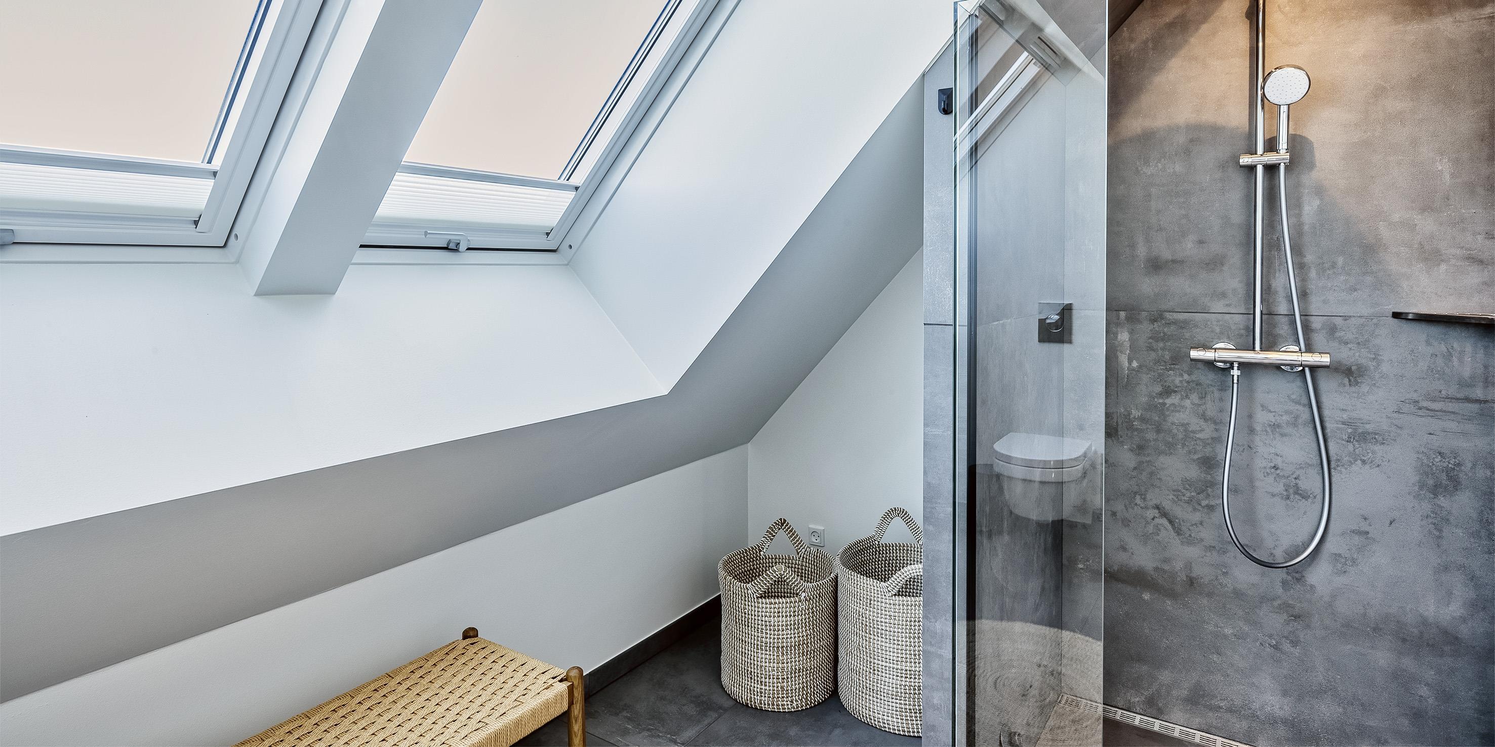 Badezimmer mit Toilette, Dusche und Waschbecken