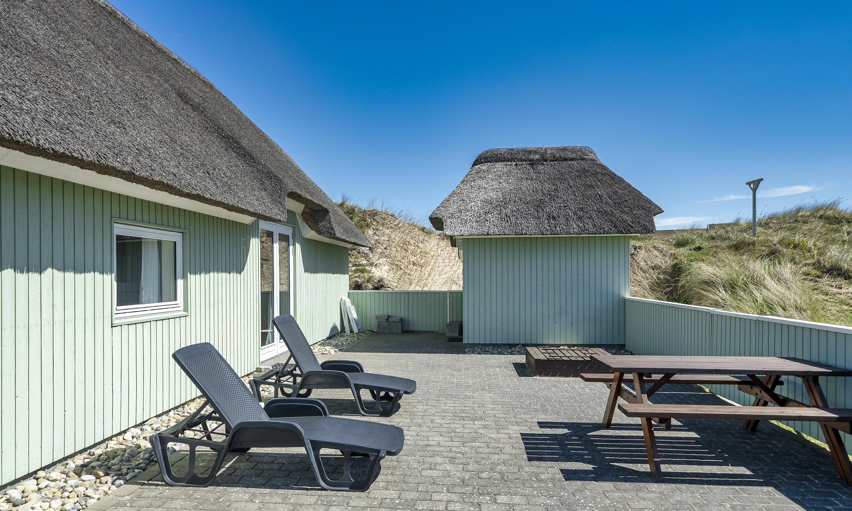 Reetgedeckte Ferienhaus in Mitten der Dünenkette in einer Senke und ist für 6-8 Personen ausgestattet und nur 200 Meter vom Strand entfernt mit einem Wildbad und einer Außendusche.