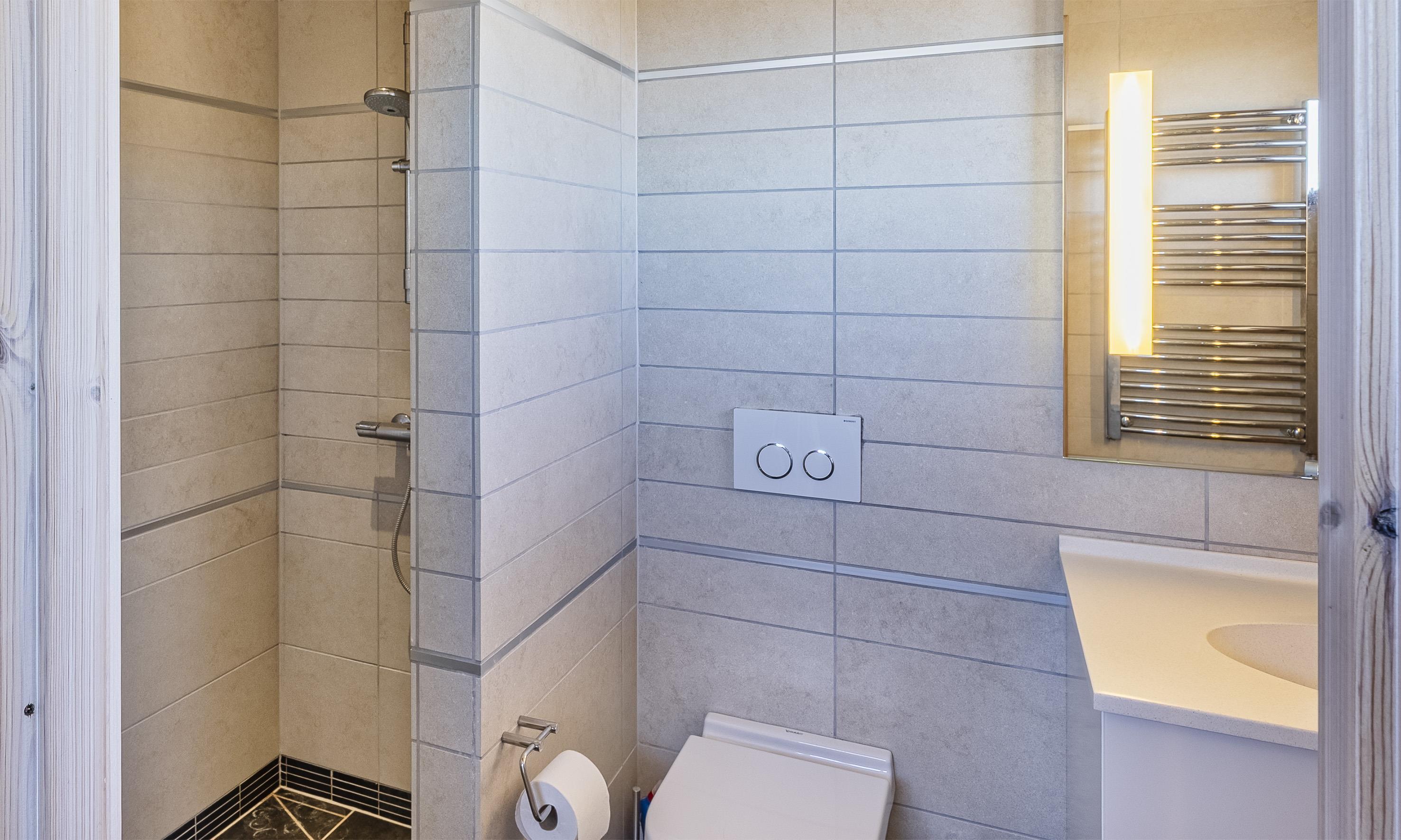 Badezimmer mit Toilette, Dusche und Waschbecken