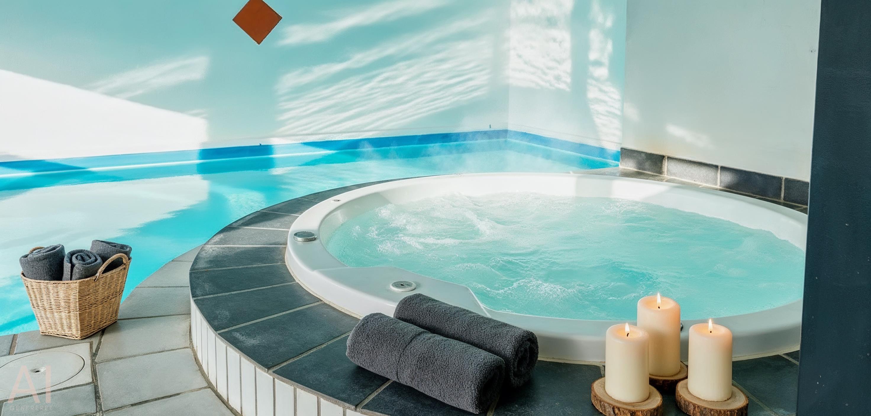 Großes lichtdurchflutetesPoolhaus in bevorzugter Wohnlage. Das Poolhaus bietet Platz für 12 Personen. Das Poolhaus liegt etwas höher und bietet daher einen Rundumblick über das Ferienhausgebiet. Der Strand ist nur ca. 700 Meter vom Haus entfernt.