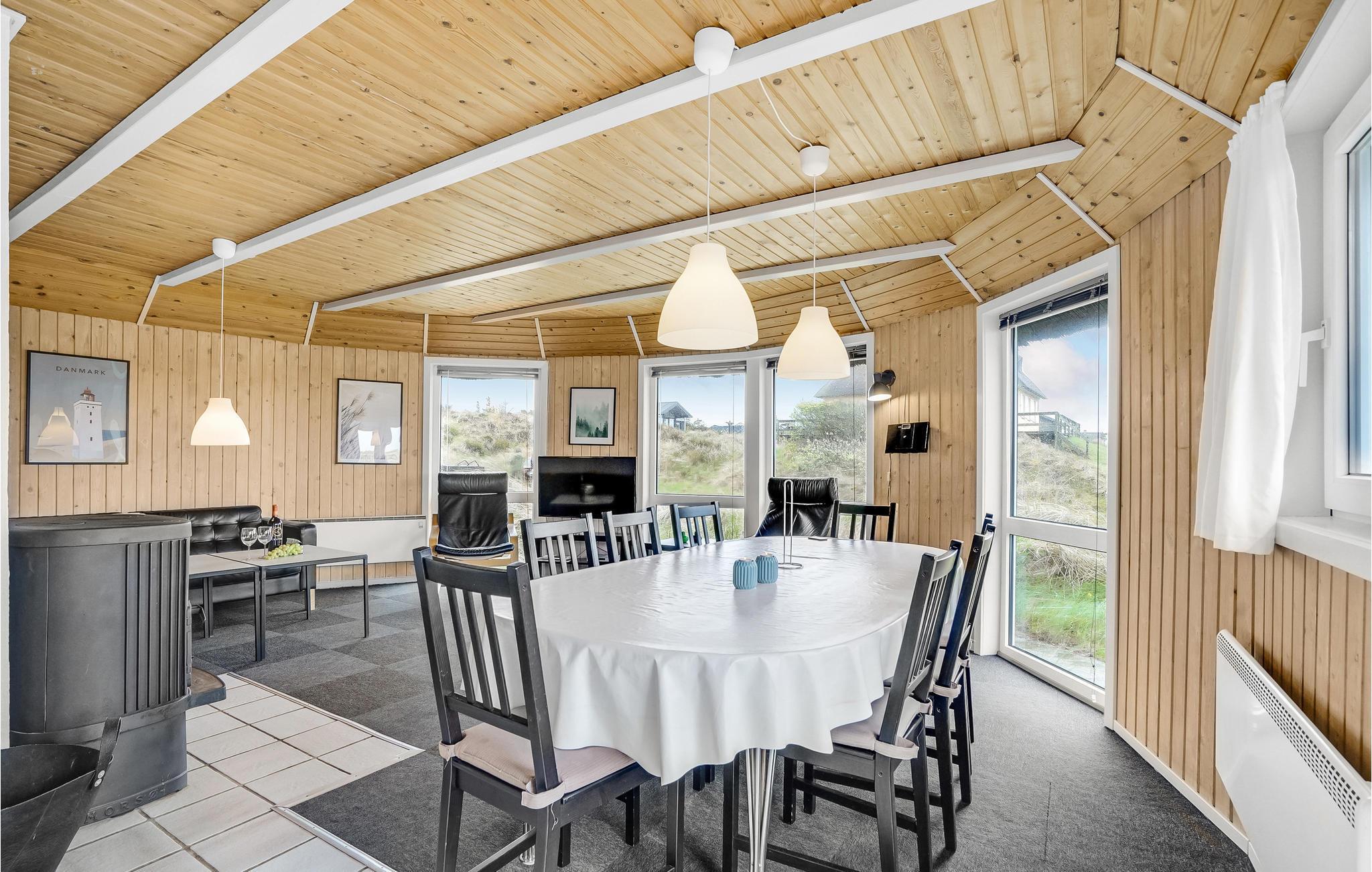Prachtvolles Ferienhaus auf hügeligem Grundstück in der äußersten Dünenreihe an der Nordsee. Eine große Familie oder auch 2 Familien finden hier eine ausreichende Ausstattung. Ein kunstvoll dekorierter Poolbereich heißt Sie mit einem großen Swimmingpool, Whirlpool und Sauna willkommen. Das Haus ist geschmackvoll eingerichtet, besonders im Wohnraum, der zur Küche hin offen ist und mit einem Kaminofen ausgestattet ist. Machen Sie es sich vor dem Kaminofen gemütlich und genießen Sie dabei die schöne Aussicht auf die Dünen und die Nordsee. Die Dünenterrasse ist ungestört, trinken Sie dort in aller Ruhe Ihren Kaffee, während Sie darauf warten, dass der Grill warm wird. Vejers können Sie gut zu Fuß erreichen, dort finden Sie eine Bonbonfabrik, eine Kerzenzieherei, ein Restaurant und einen guten Bäcker. Auf einem Teil des Vejers Strands ist das Autofahren erlaubt.
