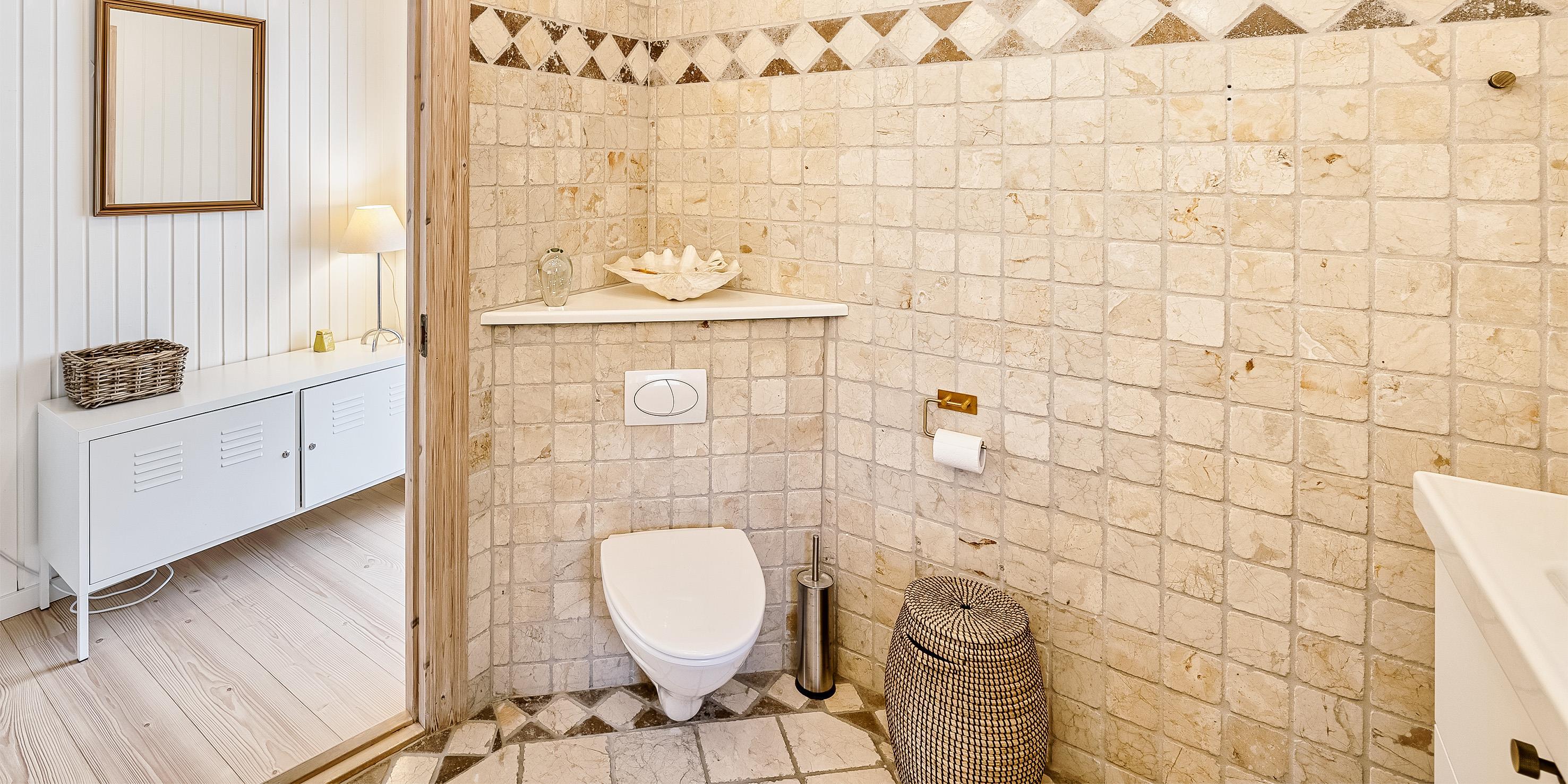Badezimmer mit Toilette, Dusche und Waschbecken