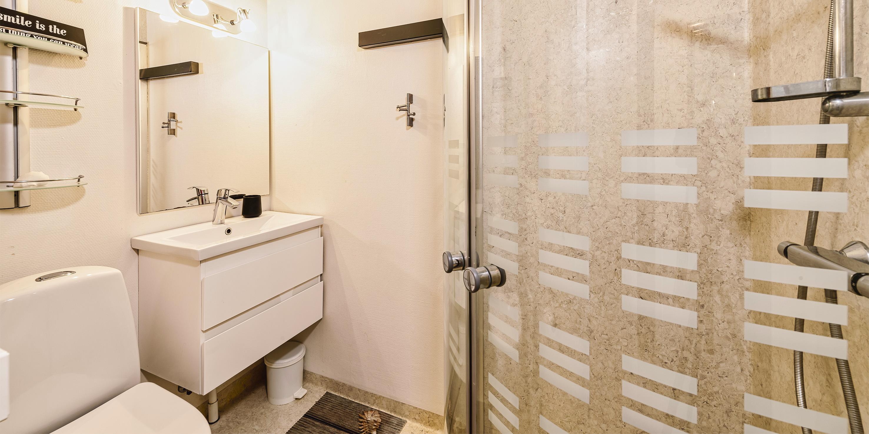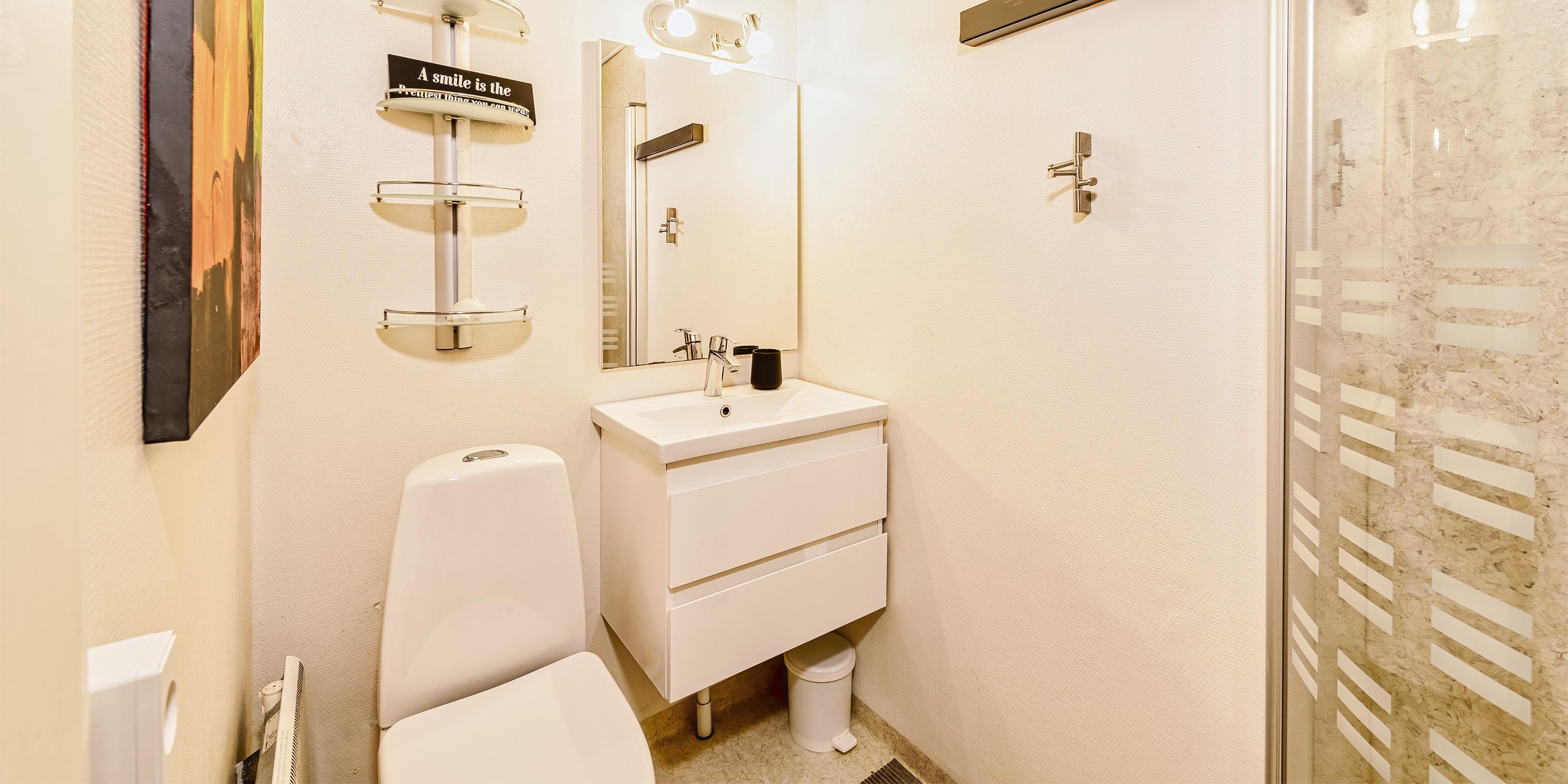 Badezimmer mit Toilette, Dusche und Waschbecken