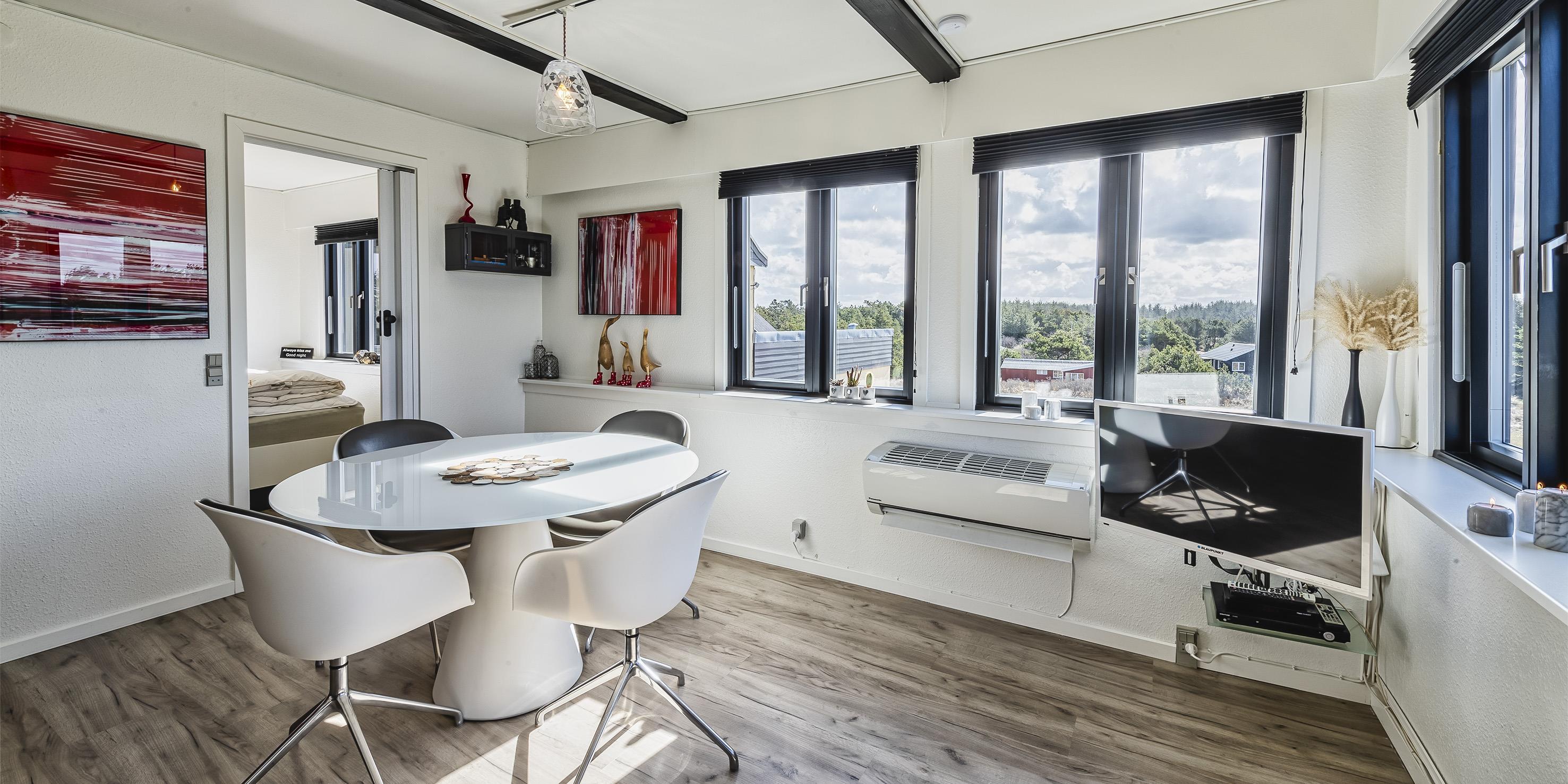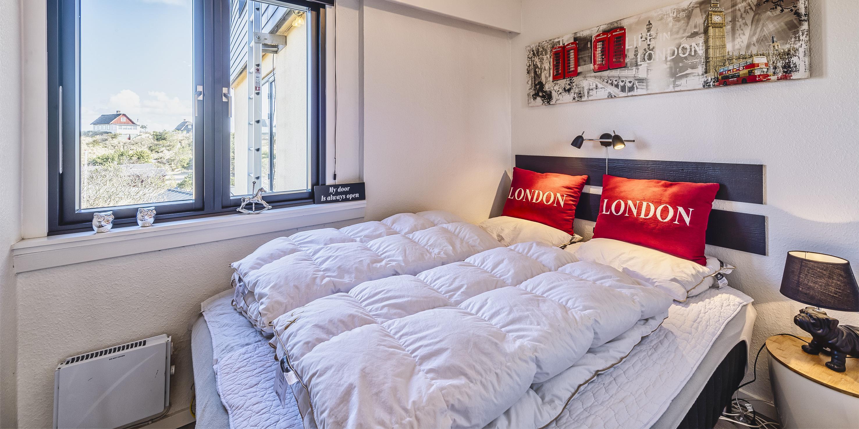 Diese geschmackvoll und neu renovierte Ferienwohnung befindet sich in der 1. Etage eines Mehrfamilienhauses in Südwestlage und ist für 4 Personen ausgestattet. Auf der Rückseite des Hauses befindet sich eine Metalltreppe mit grösseren Löchern, die dann zur Wohnung führt. Der Strand ist nur 200 Meter entfernt und in ein paar Minuten fussläufig zu erreichen. Das Wohnzimmer ist hell und freundlich und der urige Esstisch mit seinen 4 gemütlichen Barhockern ist im amereikanischen Stil gehalten. Er kann auch noch ausgezogen werden und bietet daher mehr Platz zum essen an. Das Sofa kann zu einer Liegefläche ausgezogen werden und dann können sie gemütlich im Liegen auch fern sehen. Das deutsche Fernsehprogramm empfangen Sie über eine Parabolantenne, auch die üblichen dänischen Programme können sie empfangen. Im Küchenbereich befindet sich ein Herd mit Cerankochfeld, ein Backofen, einer Geschirrspülmaschine, einer Mikrowelle und einer Standkühl- und Gefrierkombination auch im amerikanischen Stil und in einem tollen Rot gehalten. Der Kühlschrank ist der Blickfang in der küche. Desweiteren befindet sich eine Klimaanlage in der Ferienwohnung, die ein schnelles und sparsames Aufheizen ermöglicht. Die auf den Bildern gezeigten Heizkörper im Wohn- und Essbereich sind daher nicht mehr vorhanden. Es befindet sich eine Warmepumpe im Ferienhaus. Mit dieser Warmepumpe haben sie die Möglichkeit die Stromkosten zu senken, denn die Warmepumpe ist energiesparend. Das Badezimmer verfügt über ein WC, eine Dusche und ein Handwaschbecken. Es gibt 2 Schlafzimmer in der Wohnung: DB + DB. Es stehen mehrere Terrassen zur gemeinsamen Nutzung zur Verfügung, ebenso ein Schaukelstativ für die Kleinen Gäste. Das Auto findet auch direkt Platz am Haus. Da es oben auf einer Düne gebaut worden ist gelangen Sie zum Mehrfamilienhaus über eine lange Treppe. Die Ferienwohnung verfügt über einen Internetanschluss (W-Lan). Es sind max. 2 Hunde erlaubt. Katzen sind nicht erlaubt. Das Rauchen ist in der Wohnung nicht erlaubt. Das Mehrfamilienhaus ist 1937 erbaut worden und die Ferienwohnung wurde 2015 renoviert. Gratis Eintritt Oksbøl Badeland in 2025.
