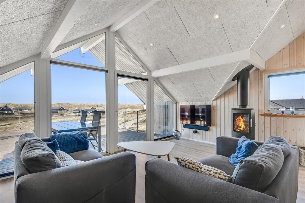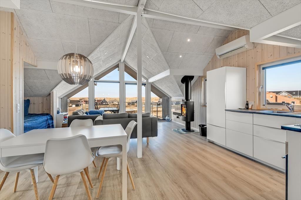 Innen erwartet dich eine helle und luftige Atmosphäre, in der die großen Fensterpartien die Natur ins Haus holen und ein besonderes Gefühl von Nähe zur Umgebung schaffen. Die moderne Einrichtung vereint Ästhetik und Funktionalität, sodass du dich sowohl entspannen als auch in geselliger Runde wohlfühlen kannst. Die offene Raumgestaltung und das offene Dach bis zum Giebel verleihen dem Wohnbereich ein großzügiges Raumgefühl, während das Tageslicht über die hellen Flächen tanzt. Abends sorgt der Holzofen für Wärme und Gemütlichkeit – perfekt nach einem langen Tag mit frischer Luft und Westwind im Haar. Dieses Ferienhaus lädt ein zur Ruhe und zum Beisammensein – und du wirst dich hier schnell zuhause fühlen.