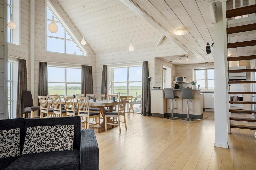 Drinnen erwartet dich ein gemütliches und großzügiges Ferienhaus, in dem das massive Holz eine warme und authentische Atmosphäre schafft. Der große Wohnbereich verbindet Wohnzimmer, Essbereich und Küche zu einem offenen Raum, und durch die großen Fensterfronten genießt du einen beeindruckenden Blick auf den Ferring See – ein Anblick, der selbst im Inneren für Ruhe sorgt und dich der Natur ganz nah fühlen lässt. Nach einem erlebnisreichen Tag ist es herrlich, im Whirlpool zu entspannen, während die Kinder noch spielen oder sich ausruhen. Und wenn du noch mehr Entspannung brauchst, wartet die Sauna darauf, deinen Körper nach einem langen Strandspaziergang wieder aufzuwärmen. Das Ferienhaus eignet sich perfekt für zwei Familien oder eine größere Freundesgruppe – und dein Hund ist selbstverständlich auch herzlich willkommen.
