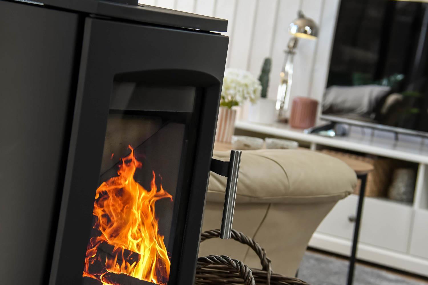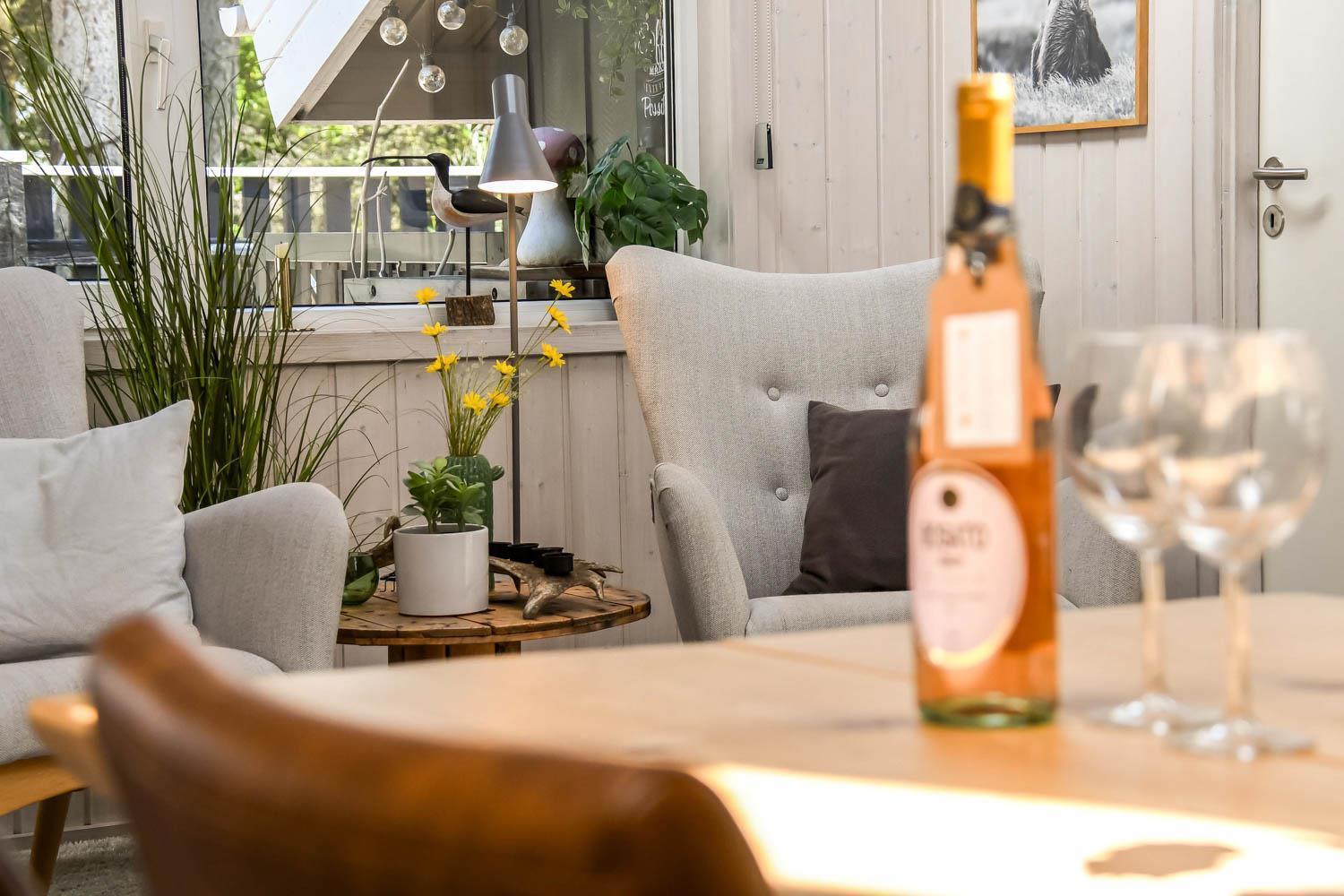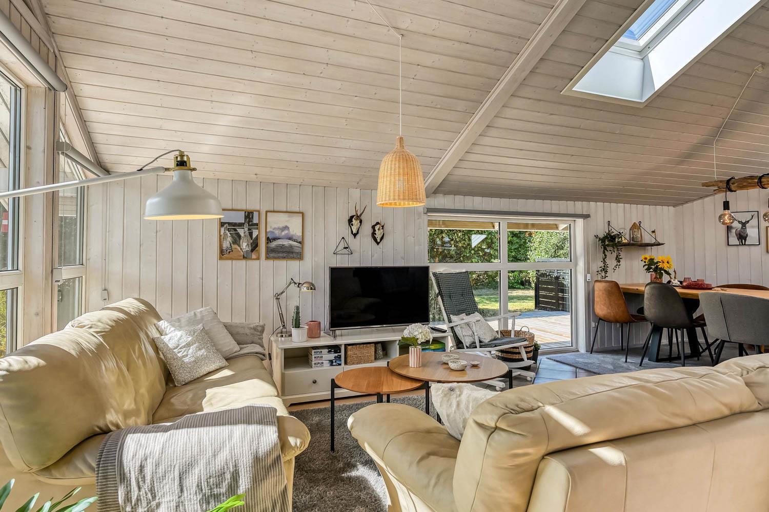 Das offene Wohnzimmer ist in hellen und freundlichen Farben eingerichtet und lädt mit einem gemütlichen Ecksofa vor dem knisternden Holzofen und einem modernen Fernseher, der dänische und deutsche Programme empfängt, zum Entspannen ein. Die installierte Wärmepumpe sorgt das ganze Jahr über für ein angenehmes Raumklima und trägt zu einer energiesparenden Beheizung bei.