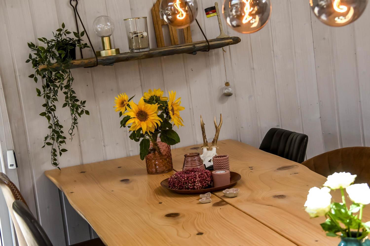 Die Küche ist eine wahre kulinarische Oase – ausgestattet mit allem, was ihr zum Zubereiten leckerer Mahlzeiten benötigt. Die Wohnküche ist komplett ausgestattet mit Geschirr, Kochutensilien, Geschirrspüler, Mikrowelle, Cerankochfeld, Einbaubackofen, Kühl-/Gefrierschrank und Dunstabzugshaube. Der Essbereich ist praktisch direkt neben der Küche platziert – ideal für gemeinsame unvergessliche Momente.