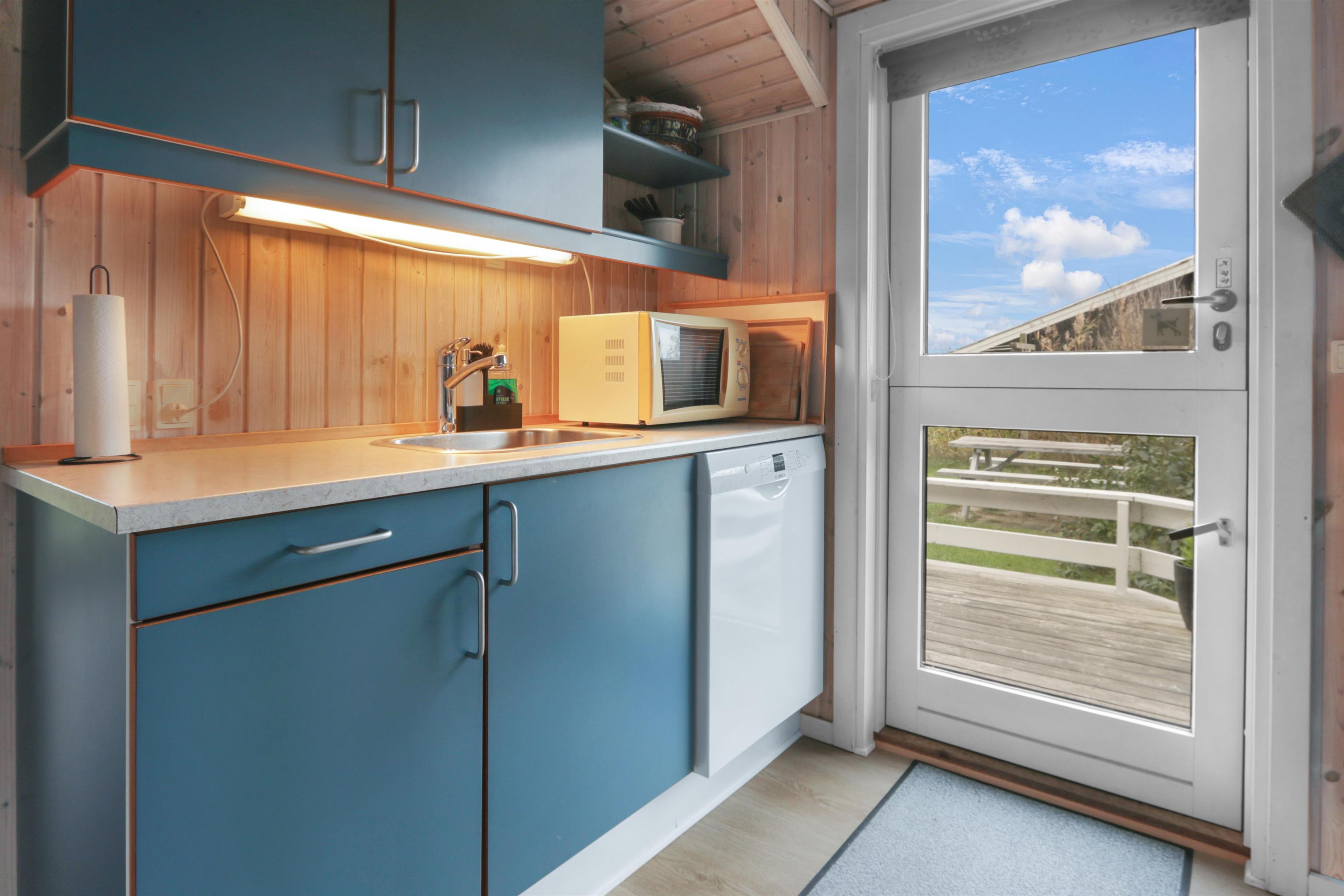 Das Ferienhaus ist 65 m² groß und bietet Platz für bis zu sechs Personen. Die Einrichtung ist hell und einladend mit einem gemütlichen, kombinierten Wohn- und Küchenbereich.