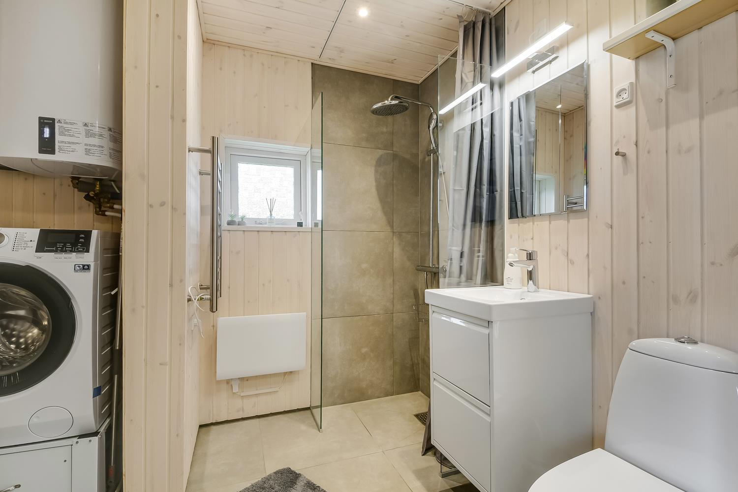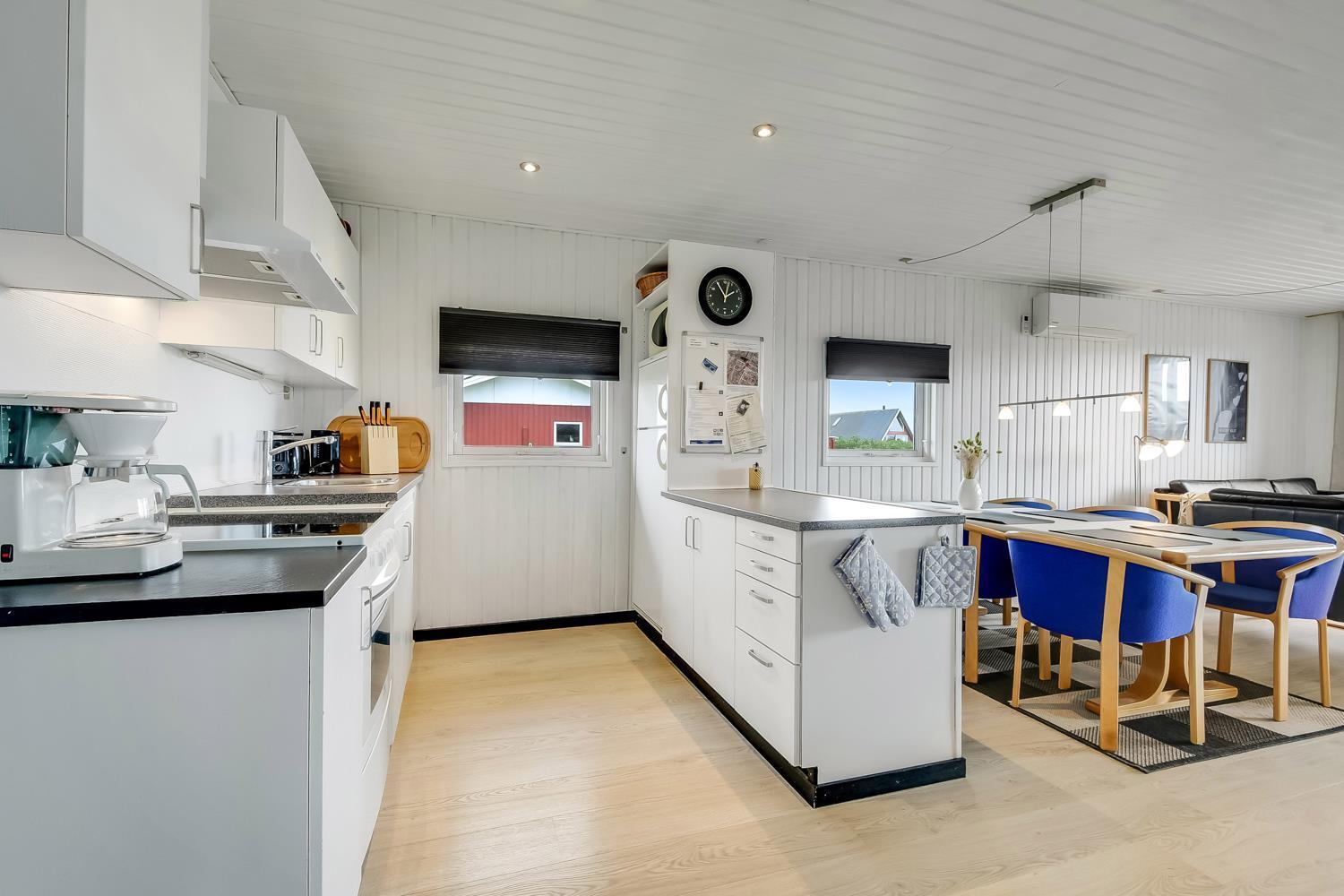 Ein hell und freundlich eingerichtetes Ferienhaus mit 3 Schlafzimmern (1 DB, 2 EB, 1 EB), schönen Möbeln, Holzofen und TV mit deutschem Programm.Wärmepumpe. Küche mit Geschirrspüler und Mikrowelle. Bad mit WC, Dusche und Fußbodenheizung. Waschmaschine und Wäschetrockner vorhanden.