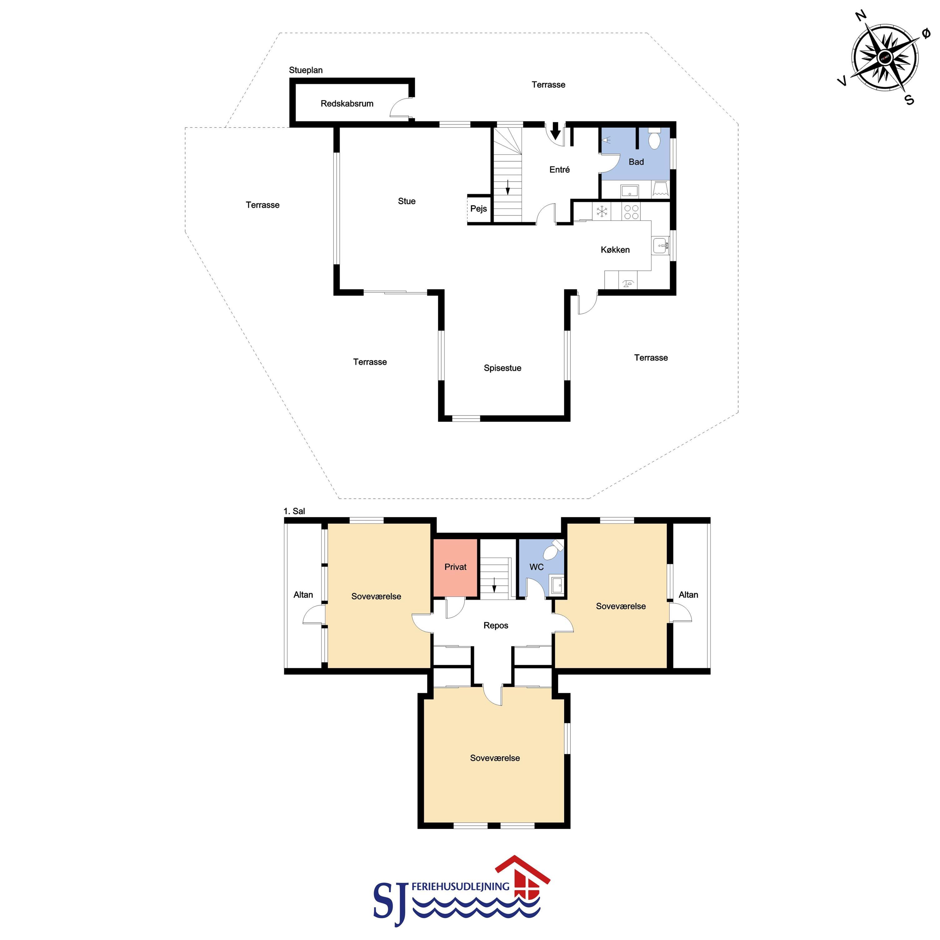 Schönes Steinhaus auf 2 Etagen mit 160 m², gebaut im Jahr 1977. Ein steiler, gepflasterter Weg führt zum Haus hinauf. Der erste Raum, den man betritt, ist der Eingangsbereich des Hauses. Hier gibt es Platz, um Jacken aufzuhängen und Schuhe abzustellen. Vom Eingangsbereich aus gelangt man ins Badezimmer des Hauses: Toilette, Waschbecken, Dusche und Waschmaschine. Weiter vom Eingang gelangt man in den Wohnbereich des Hauses, der aus der Küche, dem Esszimmer und dem Wohnzimmer besteht, alle Räume sind mit Holzböden ausgestattet. Die Küchenecke mit hellen Küchenelementen ist mit einem Glaskeramikherd, Dunstabzugshaube, Mikrowelle, Kühl-/Gefrierschrank und Geschirrspüler ausgestattet. Um die Ecke von der Küche befindet sich das Esszimmer, wo alle Bewohner des Hauses Platz finden. Im Wohnzimmer gibt es eine gemütliche Sofaecke mit Polstermöbeln und eine Sitzecke mit Kissen, wo man sich beispielsweise hinsetzen und ein Buch lesen oder fernsehen kann. Der Fernseher ist ein Smart-TV mit DR1, deutschen Kanälen und der Möglichkeit, eigene Streamingdienste zu nutzen, für die man selbst ein Abonnement hat. Außerdem gibt es einen CD- und DVD-Player. Im 1. Stock befinden sich die 3 Schlafzimmer des Hauses, von denen 2 Zimmer Zugang zu einem überdachten Balkon haben. In jedem Schlafzimmer gibt es 2 Einzelbetten, die zu einem Doppelbett zusammengeschoben sind, und in 2 der Zimmer befindet sich zusätzlich ein weiteres Einzelbett. (1DB + 1EB, 1DB + 1EB, 1DB). Im 1. Stock gibt es auch eine Gästetoilette mit Toilette und Waschbecken.