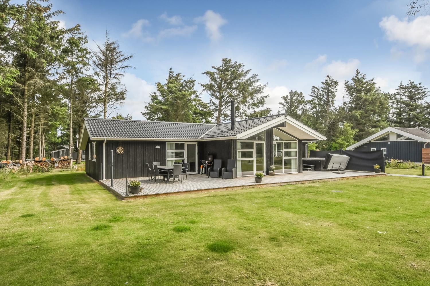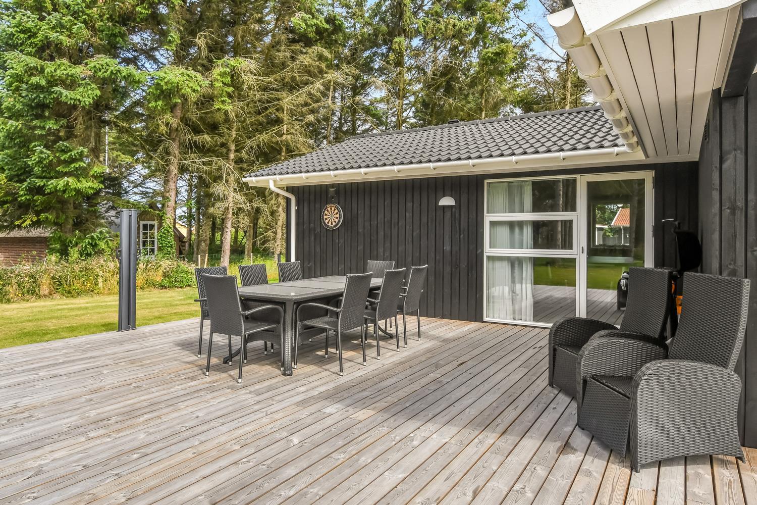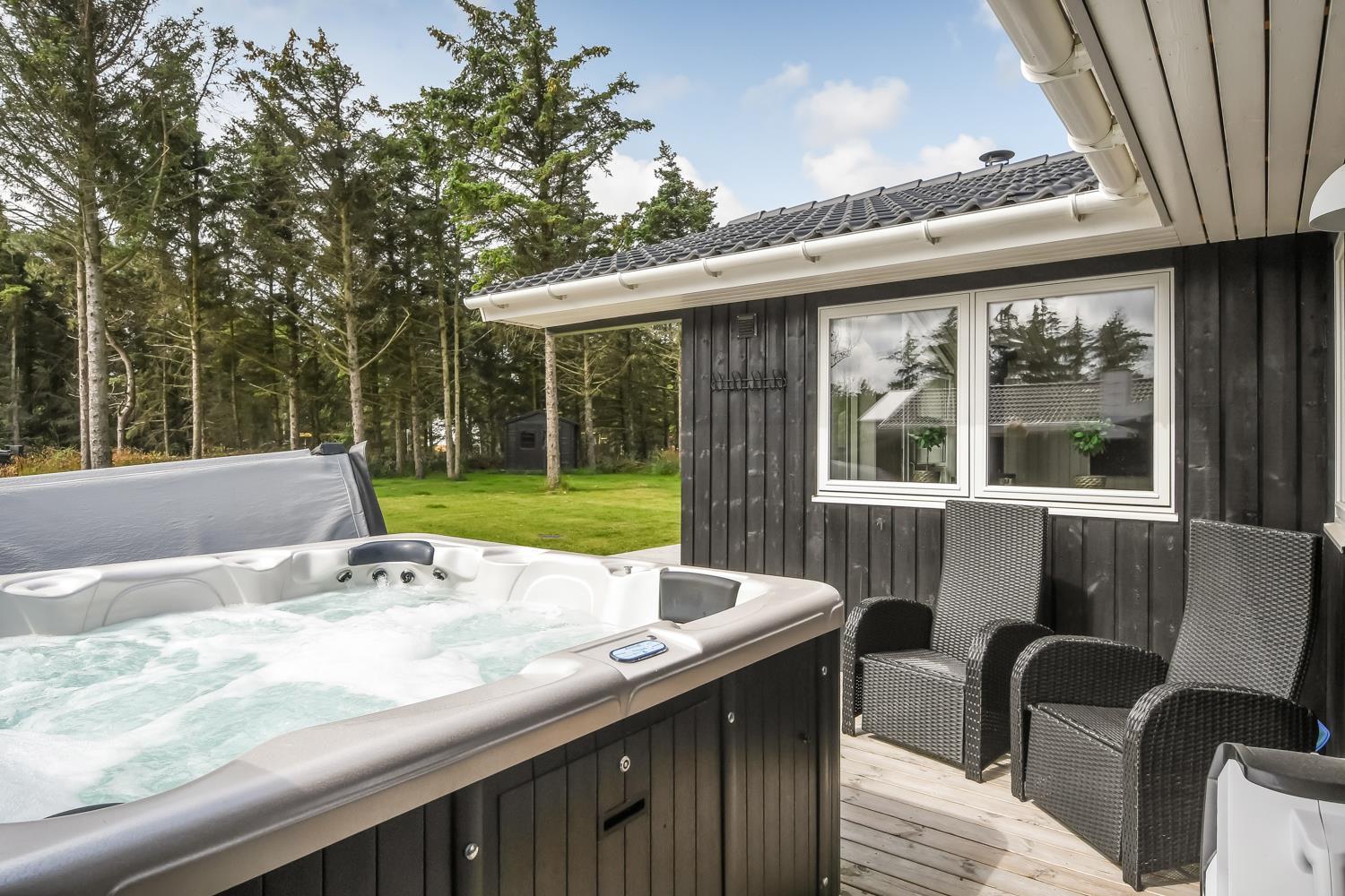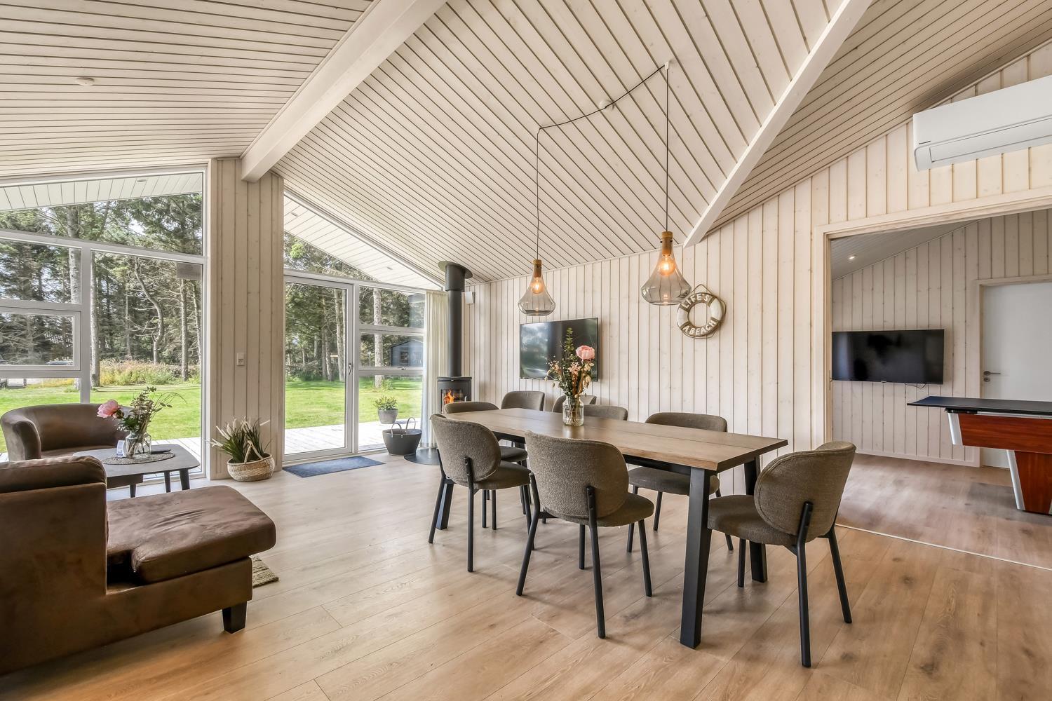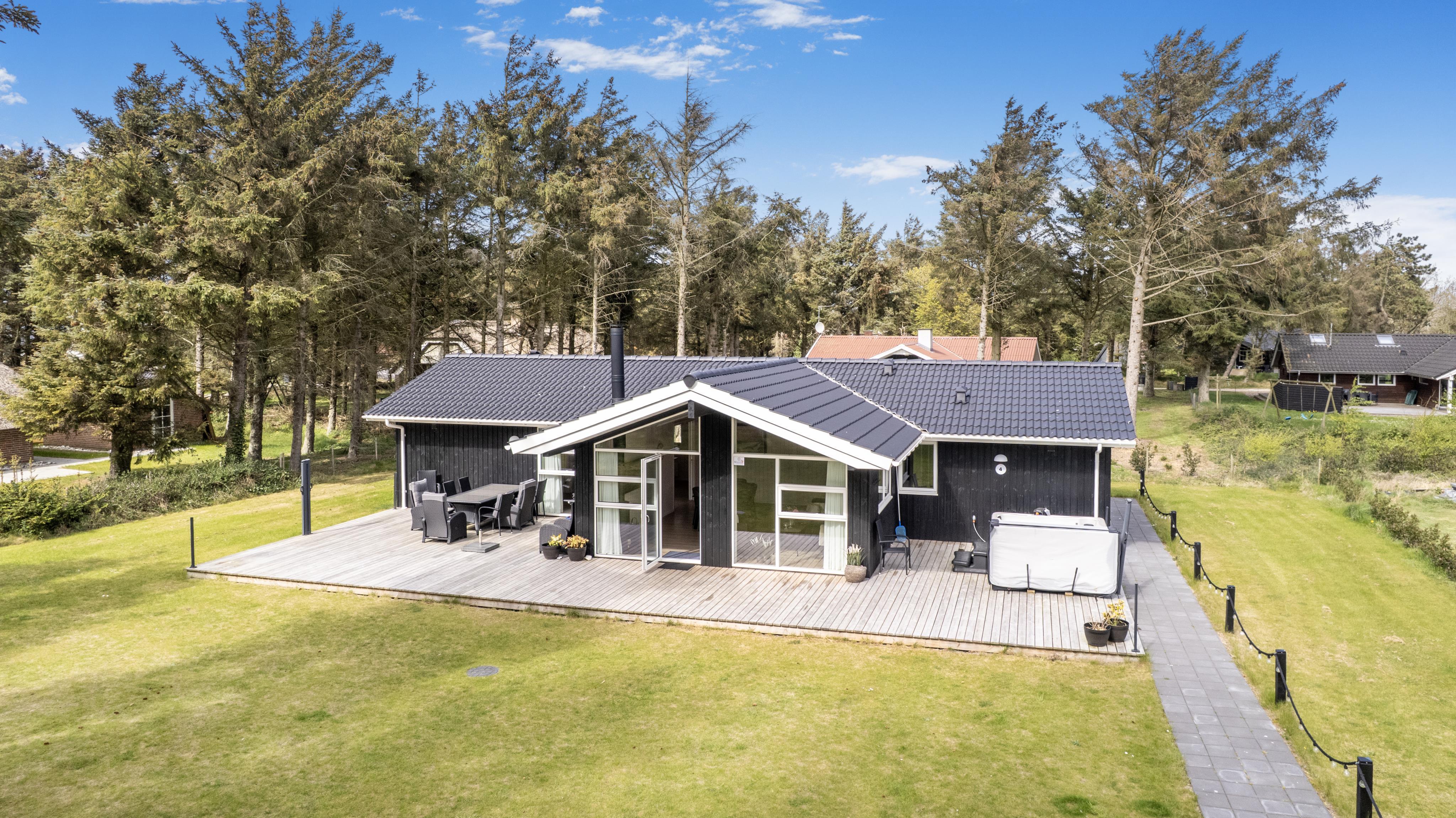 Schon wenn das Auto auf dem Kiesweg wenige Meter vom Haus entfernt ist, wird klar, daß Lage und Haus etwas Besonderes sind. Das Haus liegt auf einem schönen Grundstück in Vejlby Klit mit höheren Bewachsungen. Das Haus ist 120 qm groß und hat 4 schöne Schlafräume: 1DB + 1DB + 1DB + 2B. In der Mitte des Hauses befindet sich eine große, gut ausgestattete Küche/Wohnraum mit allem an Geschirr/Kochgeschirr . Die offene Küche ist mit Ceranfeld-Kochplatten, eingebautem Ofen, Abzugshaube, Geschirrspüler, Mikrowelle, Kühlschrank mit Gefrierfach und vielem mehr ausgestattet. Genießen Sie Ihr zubereitetes Essen am Esstisch dicht an der Küche. Genießen Sie den Blick aus den Fenstern auf die Gegend an der Nordsee. Entspannen Sie sich in den weichen Qualitätsmöbeln. Smart-TV mit Soundbar mit eingebauten dänischen Programmen, Radio und der Möglichkeit zum Streaming von Apps, wofür die Sie selber ein Abonnement haben. Es gibt praktische Holzböden im Haus, die sehr reinigungsfreundlich sind und praktische und schöne Akustikpaneelen sorgen für eine gedämpfte und angenehme Lautstärke im Haus für alle. Der Wellnessbereich in einem der Badezimmer ist mit Innen-Whirlpool und Sauna ausgestattet und es gibt von dort einen Ausgang zu einer großen und einzigartigen Terrassenanlage, wo es auch einen Aussen-Whirlpool gibt. Der separate Aktivitätsraum verfügt über Billard und Tischtennis. Hier kann man viele Stunden verbringen. 2 Badezimmer jeweils mit Toilette , Waschbecken und Fußbodenheizung. Waschmaschine ist auch vorhanden. Wärmepumpe und Kaminofen machen das Haus sehr energiefreundlich und verhelfen auch zu einer günstigen Nebenkostenrechnung. Das Haus wird nicht an Jugendgruppen vermietet. Haben Sie ein Elektro-Auto oder einen Plug-in Hybrid, so können Sie eine Ladebox Type 2 nutzen, die bis 11 kWh aufladen kann. Nichtraucher-Haus. Max. 2 Hunde sind erlaubt.