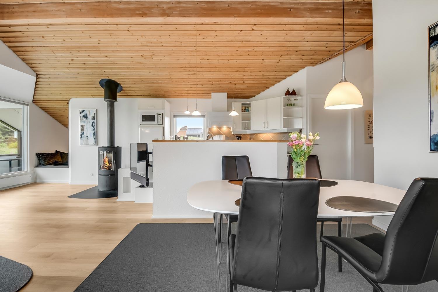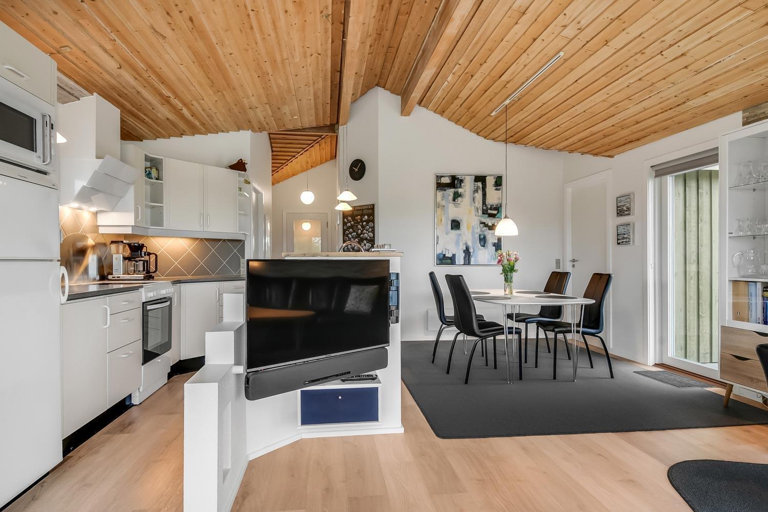Das Wohnzimmer ist mit Ledermöbeln und einem Esstisch eingerichtet, der sich in unmittelbarer Nähe zur Küche befindet. Es gibt einen Fernseher mit Satellitenempfang (nur deutsche Programme) sowie dänische Programme, und es besteht die Möglichkeit, eigene TV- oder Radioprogramme zu streamen.