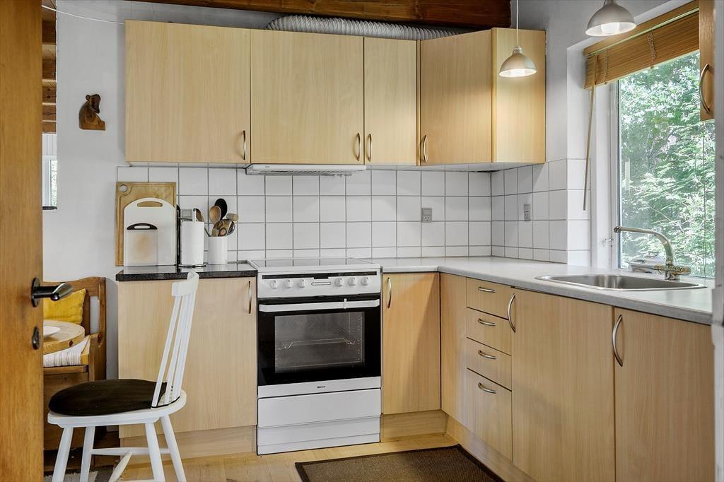 Schönes Ferienhaus mit einer nach Süden gerichteten Sonnenterrasse. Das hell und gemütlich eingerichtete Urlaubsdomizil besticht mit großen Fenstern, die einen wunderbaren Lichteinfall gewähren und Ihnen eine schöne Aussicht bieten. Vor der großen Fensterpartie im Wohnraum können Sie es sich auf dem Sofa gemütlich machen und die Aussicht und die heimelige Wärme des knisternden Kaminofens genießen. Der Fernseher empfängt dänische und deutsche Fernsehsender. In offener Verbindung zum Wohnraum befindet sich die gemütliche kleine Küche, in deren Verlängerung Sie ein Essbereich erwartet. Die vier Schlafplätze verteilen sich auf zwei Schlafräume, von denen einer zusätzlich mit einem Schreibtisch und einem Kleiderschrank ausgestattet ist. Eine kostenlose Internetverbindung steht auch zu Ihrer Verfügung.