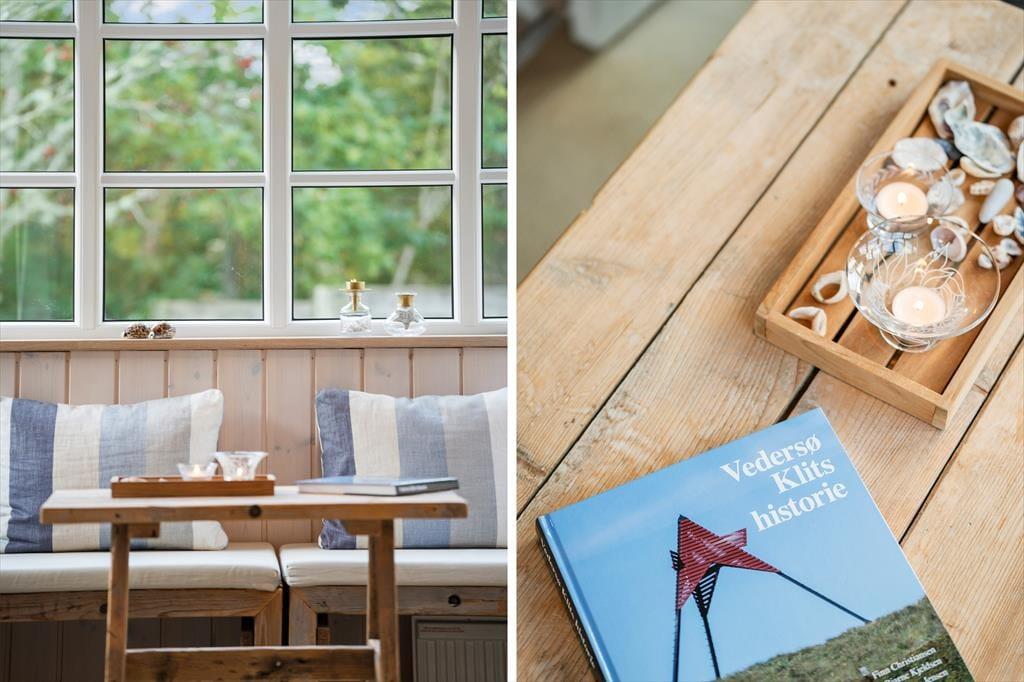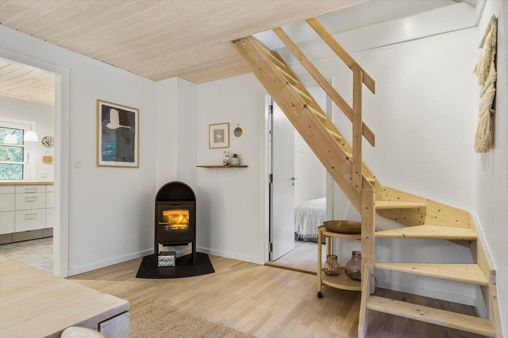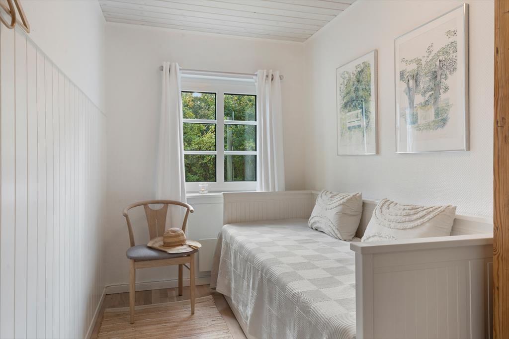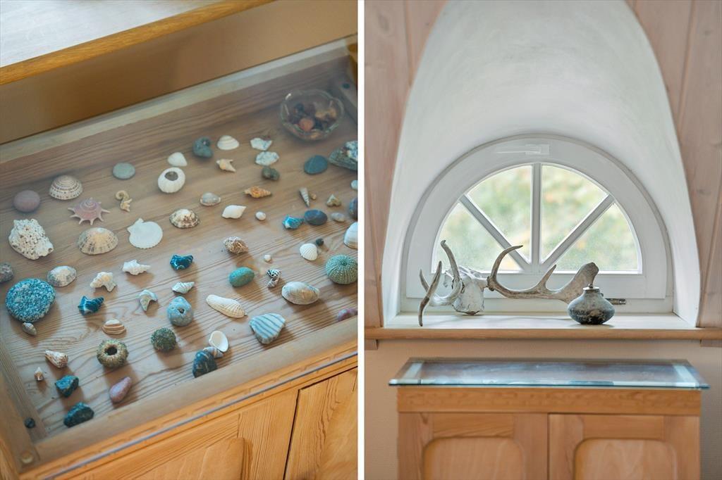 Im Obergeschoss gibt es reichlich Gelegenheit, nach einem schönen Tag voller Erlebnisse und Spaß zur Ruhe zu kommen. Im Wohnzimmer spürt man die Nähe zur wunderschönen Natur mit ihrer kleinen, feinen Strandfundsammlung und dem König des Waldes, der im Licht des halbmondförmigen Fensters erstrahlt.