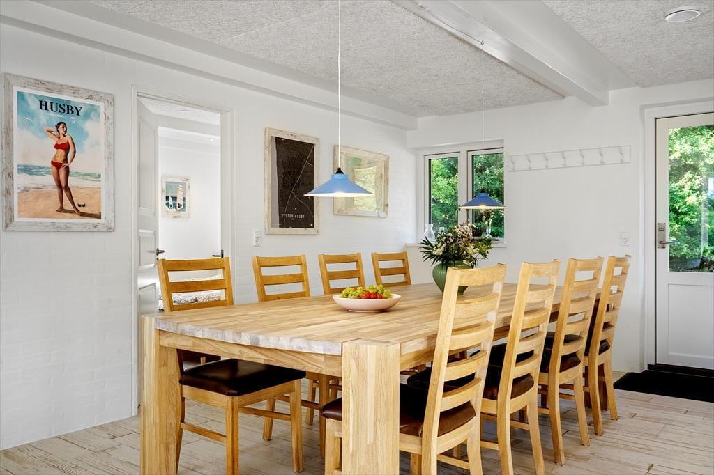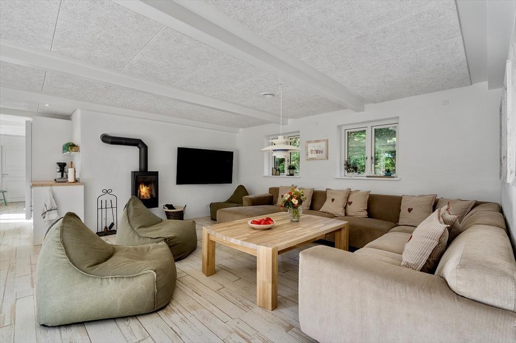 Dieses komplett renovierte Ferienhaus in der Raketvejen bietet modernen Komfort mit viel Platz und Gemütlichkeit. Die Küche ist das Herz des Hauses – zentral gelegen mit offenem Zugang sowohl zum hellen Speisesaal am einen Ende als auch zum gemütlichen Wohnzimmer mit TV am anderen. Hier könnt ihr gemeinsame Mahlzeiten genießen, plaudern oder euch in das große Sofa fallen lassen und einen ruhigen Moment verbringen. In der Küche findet ihr auch ein praktisches Detail: einen Wasserhahn mit kochendem Wasser – ideal für Tee, Kaffee oder schnelle Mahlzeiten. Im Obergeschoss erwartet euch ein großer Raum mit cleveren Trennwänden, die sowohl Offenheit als auch Privatsphäre schaffen – und als besonderes Highlight steht hier ein großes Billardtisch für viele Stunden Unterhaltung. Der Stil des Hauses ist durchgehend modern, aber dennoch mit warmen Details inspiriert von der Natur und Atmosphäre in Vester Husby.