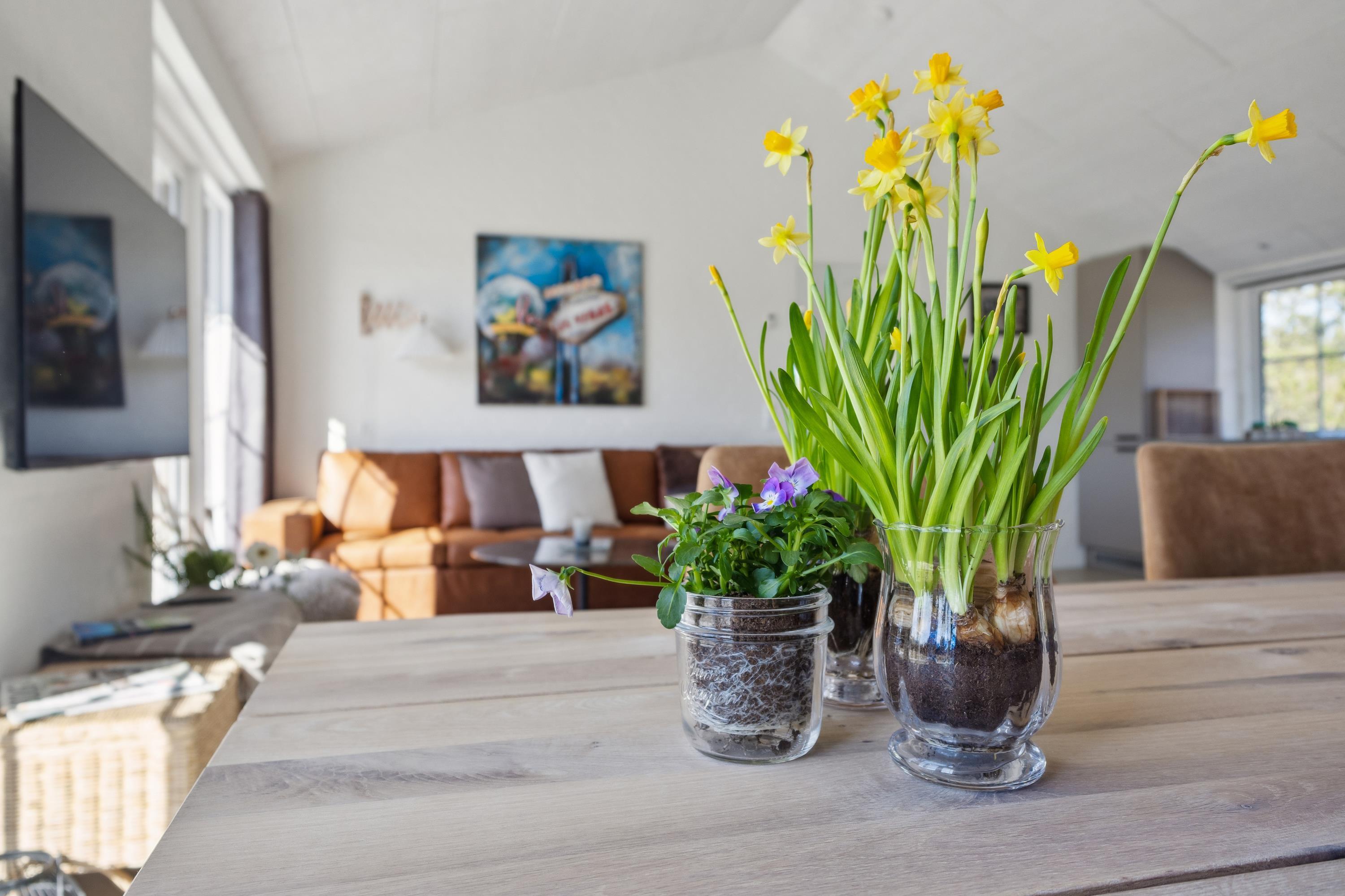 Auch innen bietet das gemütlich eingerichte Haus viele überraschende Details. Wohnzimmer und Küche hängen als großzügig geschnittener Gemeinschaftsraum zusammen und die Panoramafenster lassen viel Licht herein. Hier ist die ganze Familie zusammen ... beim Kochen, Spielen und beim Fernsehen. Ihr habt 2 schöne Badezimmer zur Verfügung, eines davon mit Badewanne und Dusche sowie direktem Zugang zur großen Südterrasse mit Außenwhirlpool. Auch sehr angenehm: Das zweite Badezimmer hat eine Doppeldusche und ihr habt direkten Zugang aus dem Hauptschlafzimmer. Dazu kommen noch 2 weitere Schlafzimmer, eines mit Doppelbett und eines mit 2 Einzelbetten, hier gibt es auch einen kleinen Schreibtisch, falls ihr einmal E-Mails checken möchtet oder die Kinder malen wollen.