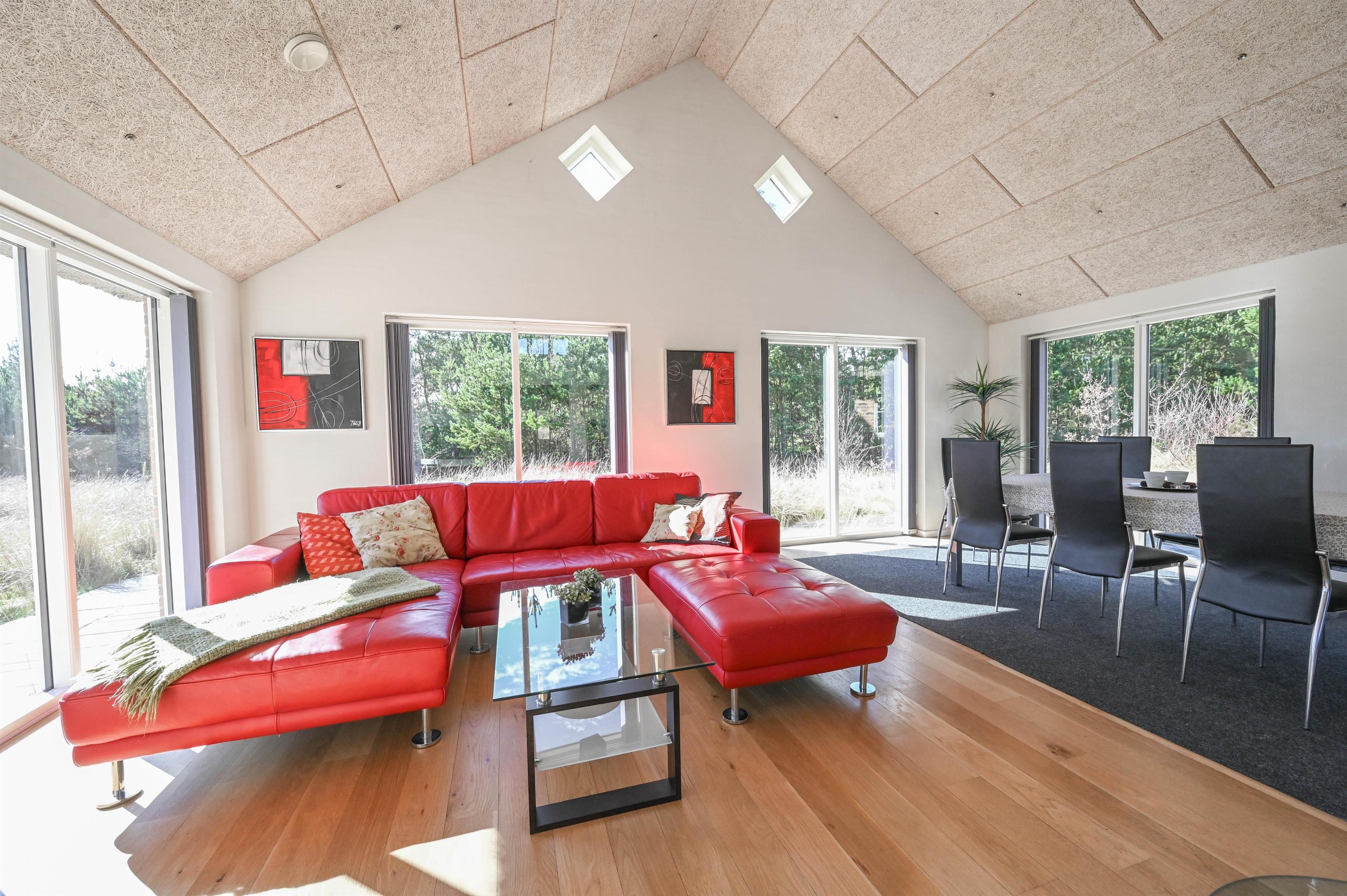 Im Inneren erwartet dich ein helles, luftiges Haus mit hohen Decken, großen Fensterpartien und einer gelungenen Kombination aus modernem Design und klassischer Ferienhausatmosphäre.