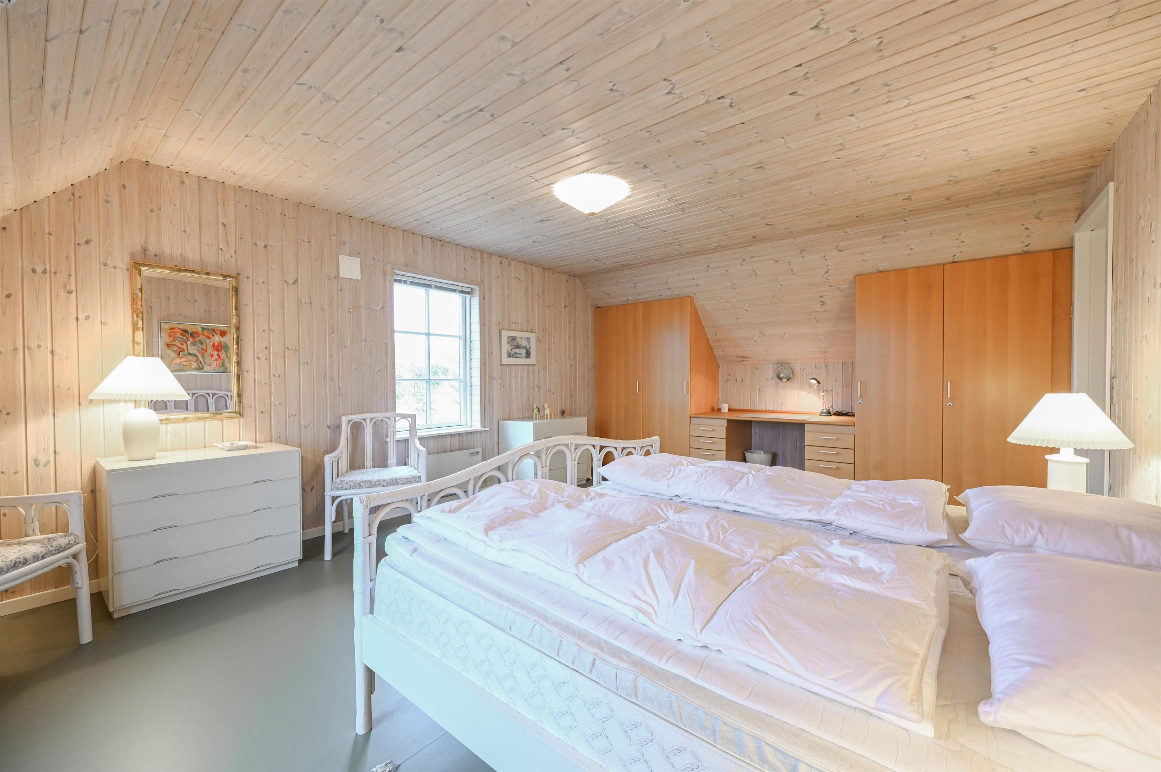 Großes Schlafzimmer mit Doppelbett und Blick auf die Dünen
