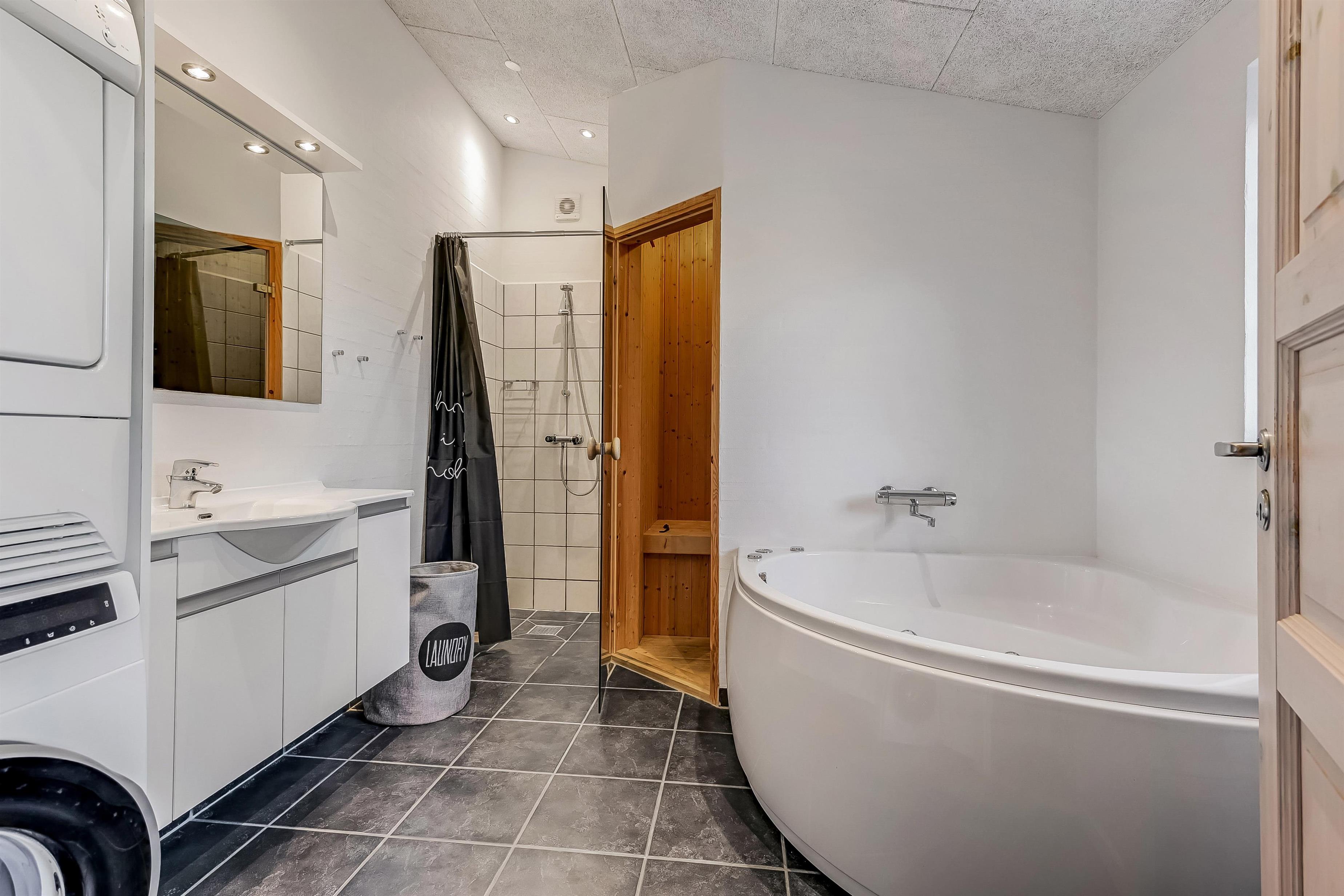Badezimmer mit Fußbodenheizung, Whirlpool und Zugang zur Sauna