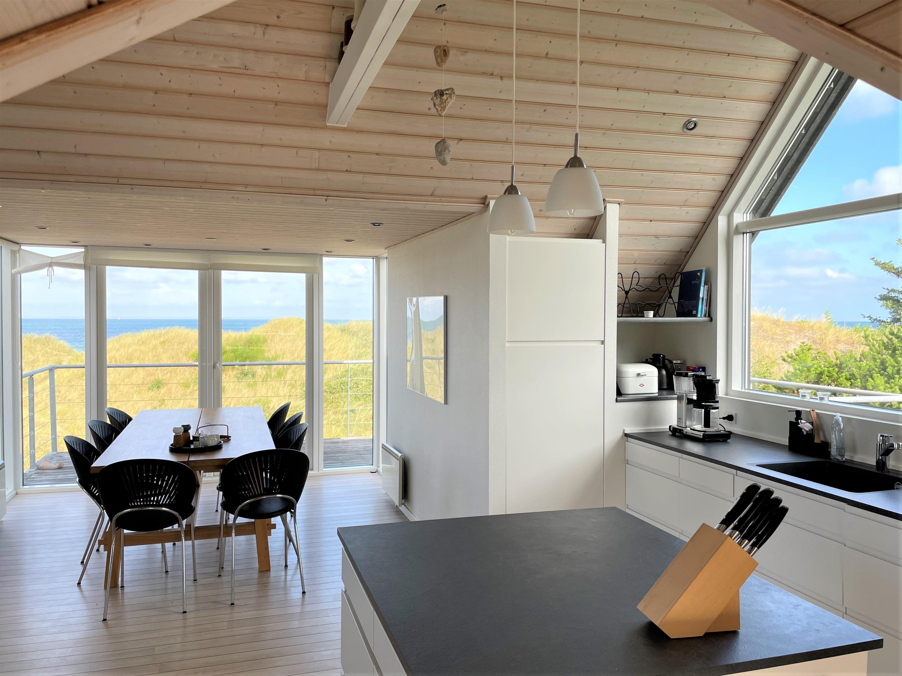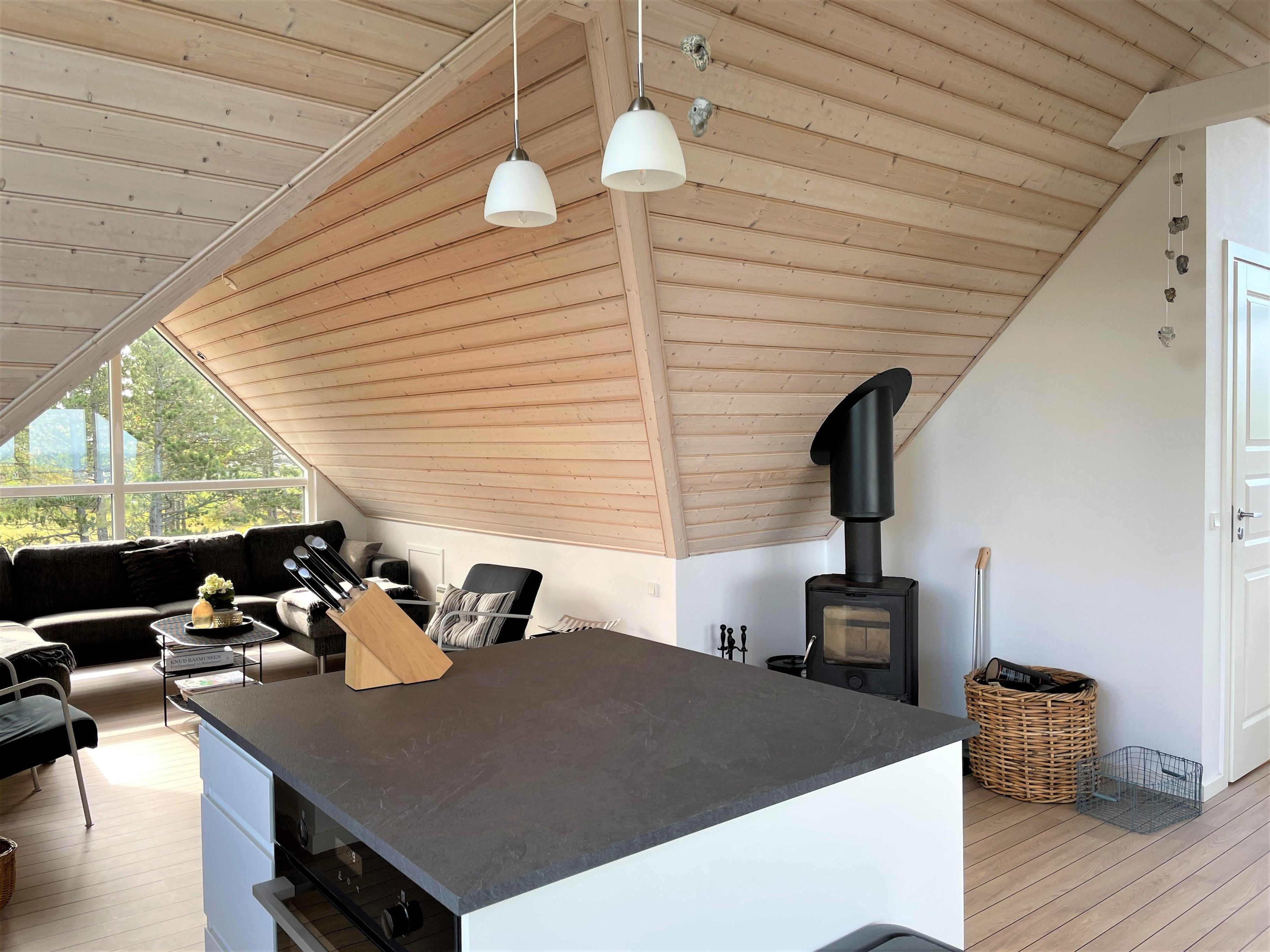 Auf der ersten Etage hat es eine gemütliche Sofaecke und Holzofen, mit einem grossem Küche-Essbereich mit direktem Ausgang zum Balkon, wo du einen wundervollen Blick auf das Meer hast, ausserdem hat es eine kleine Toilette auf dieser Etage.