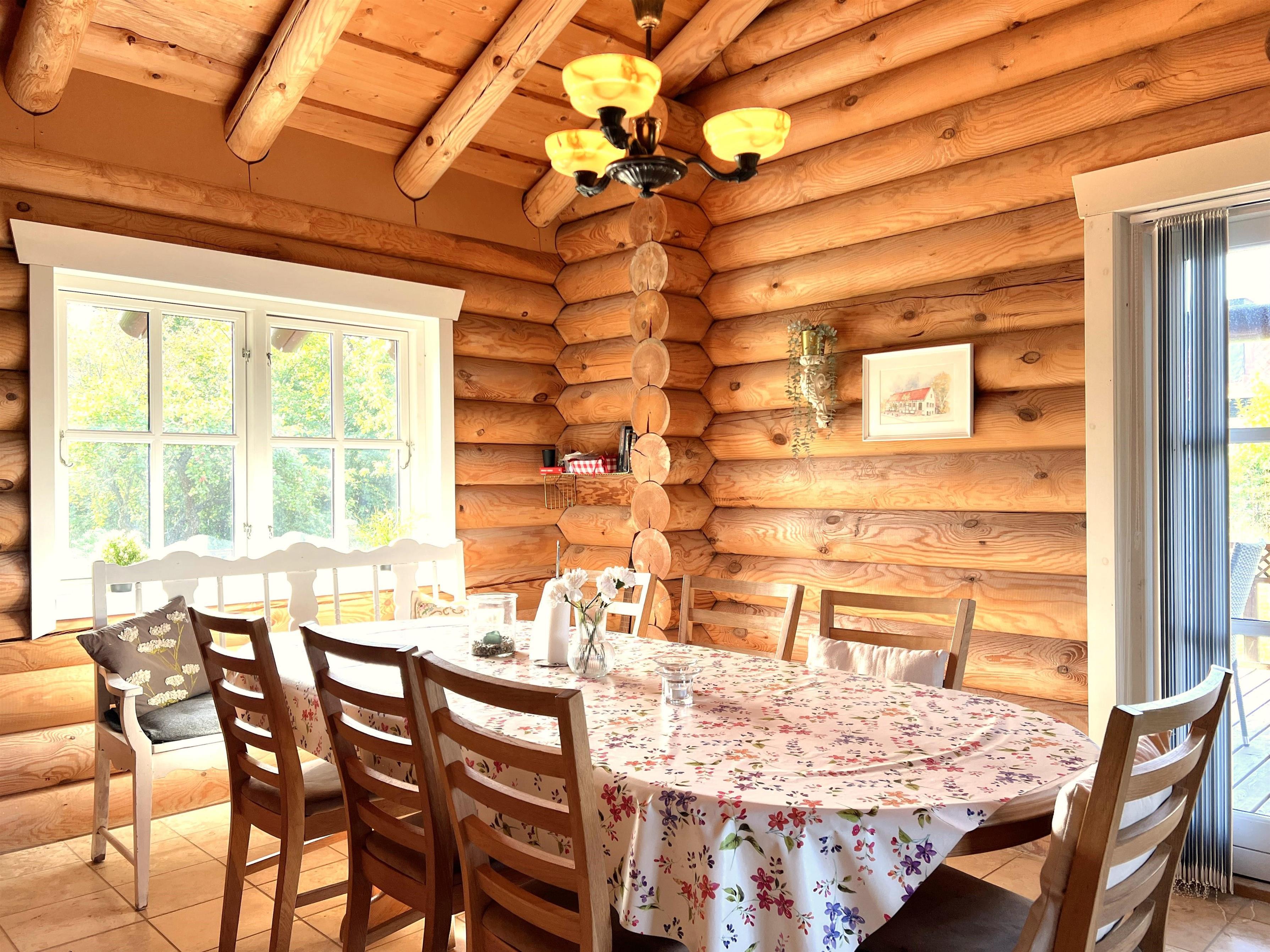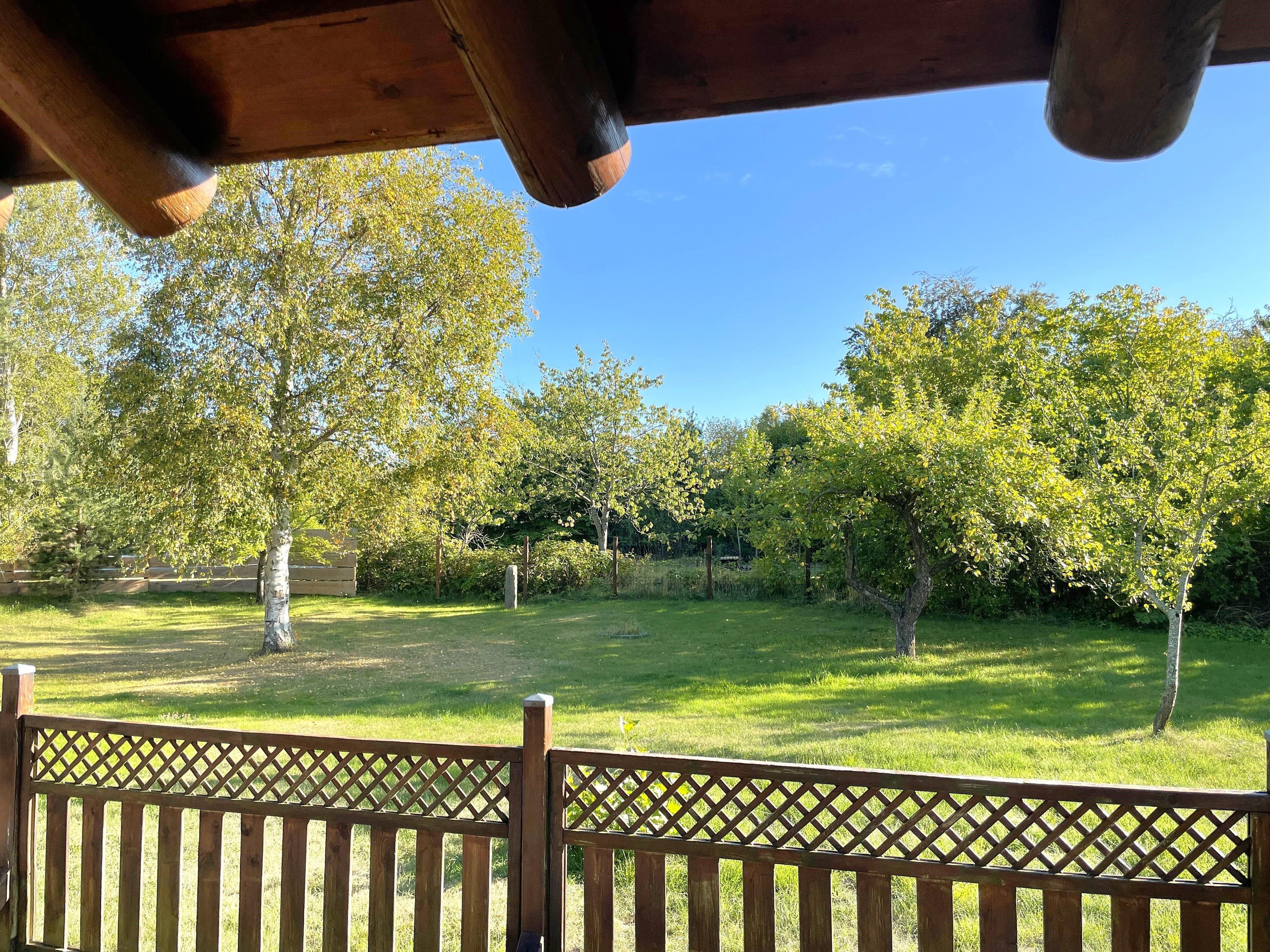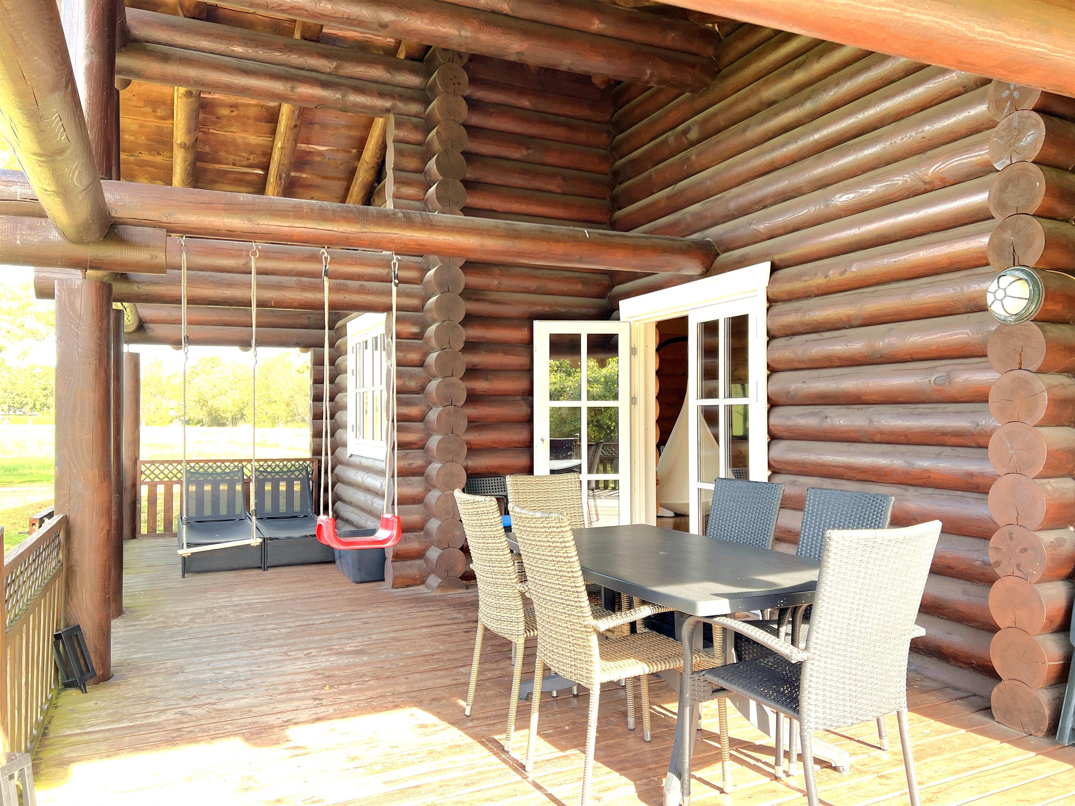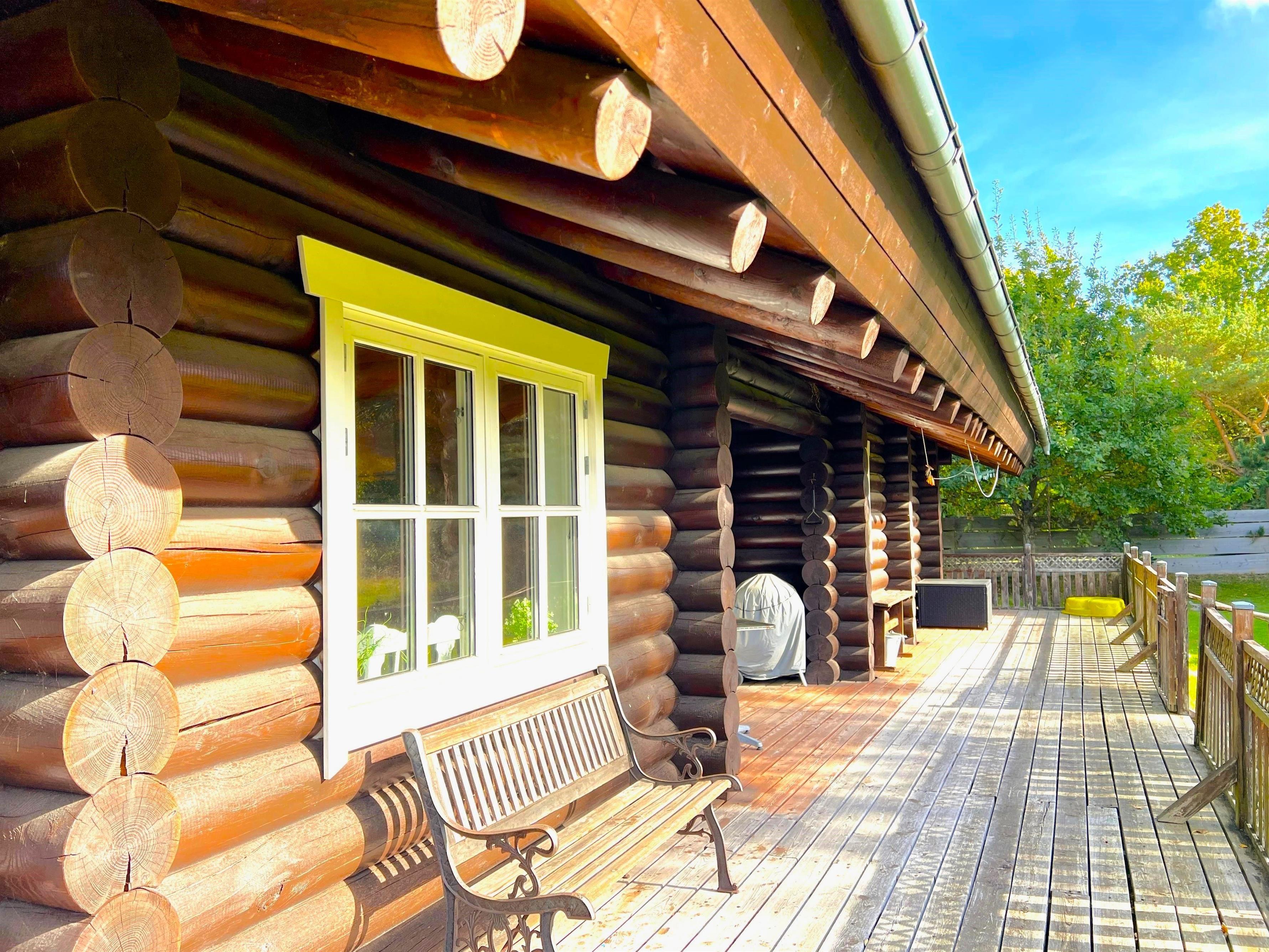 Ein wirklich schönes, geräumiges Blockhaus mit großer überdachter Terrasse und schönem umzäunten Garten.