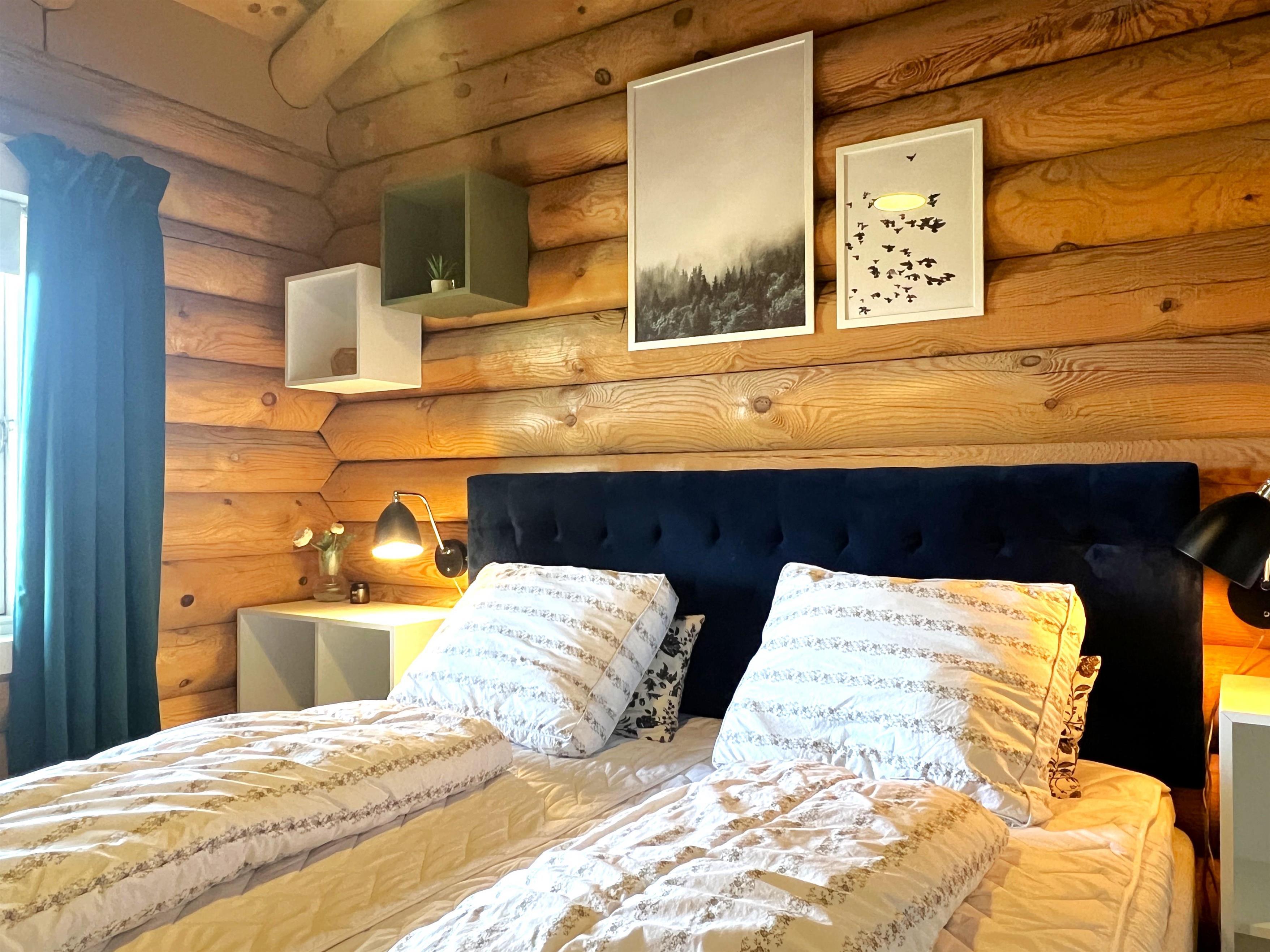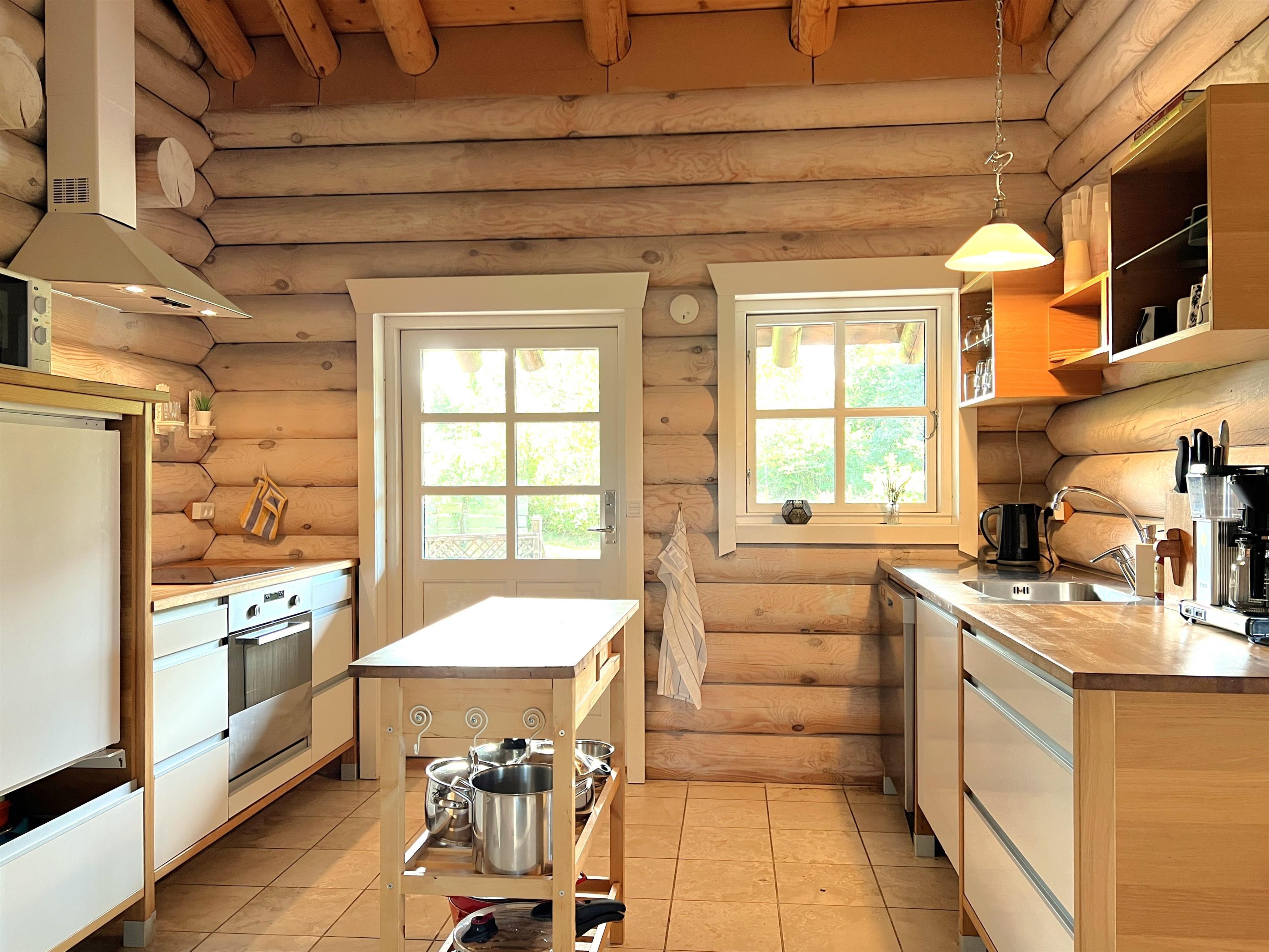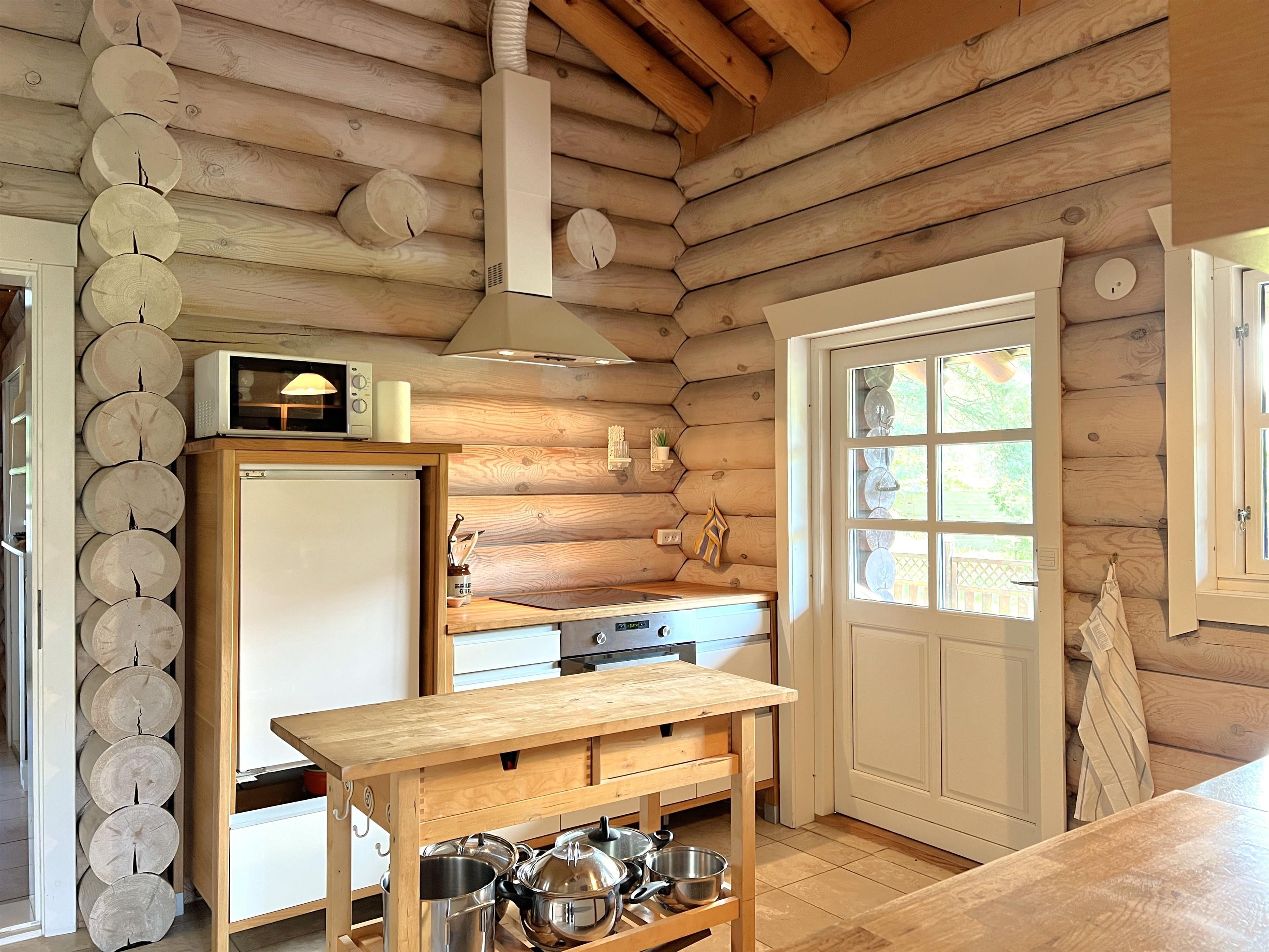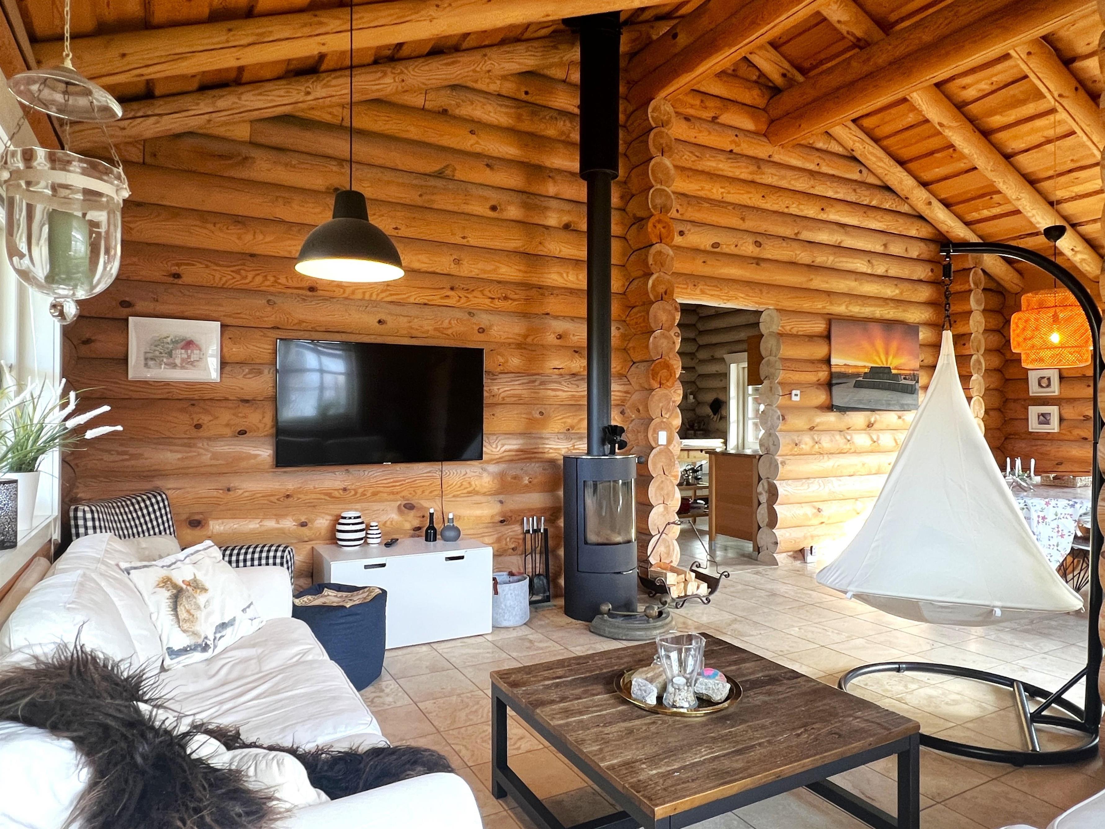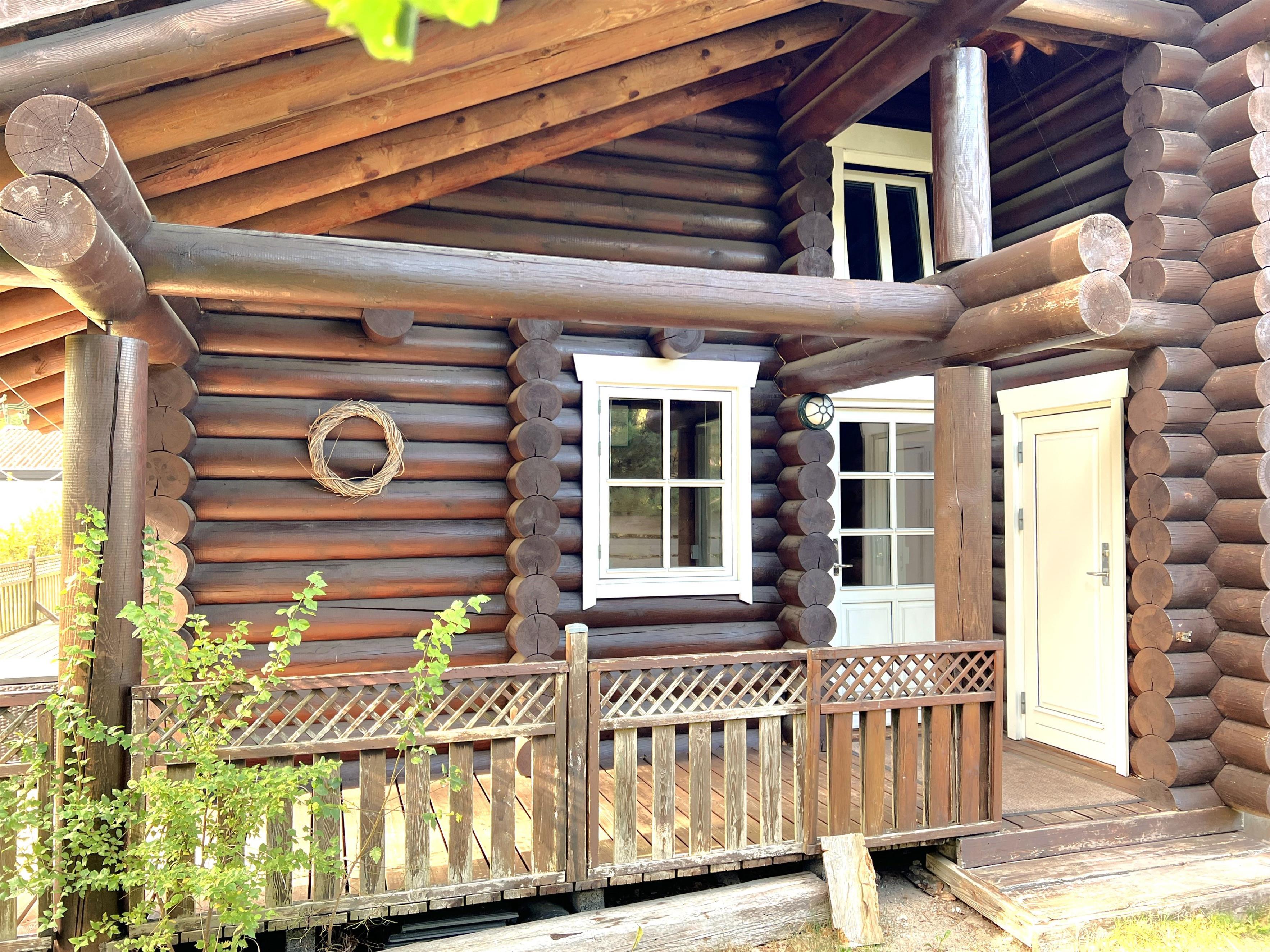 Ein wirklich schönes, geräumiges Blockhaus mit großer überdachter Terrasse und schönem umzäunten Garten.