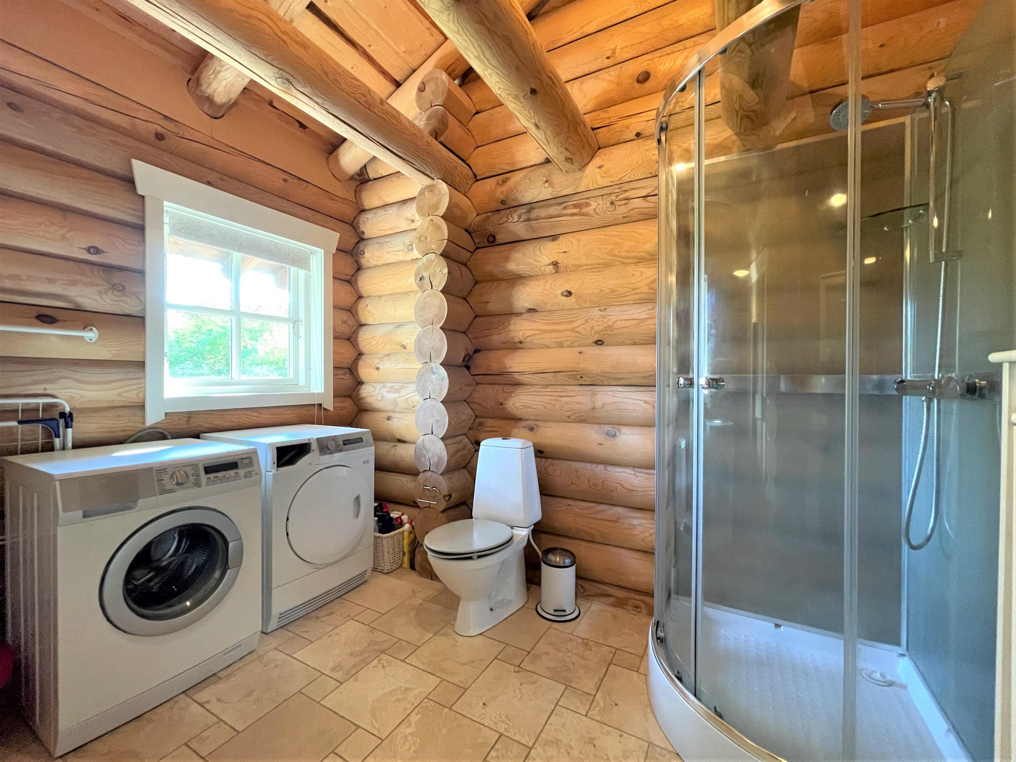 Schönes Badezimmer mit Dusche und einer zusätzlichen Toilette. Zugang zur großen überdachten Terrasse mit Grill und Gartenmöbeln sowohl von der Küche als auch vom Wohnzimmer. Gartenmöbel und gemütliche Ecken an mehreren Stellen rund um das Haus sowie eine Schaukel.