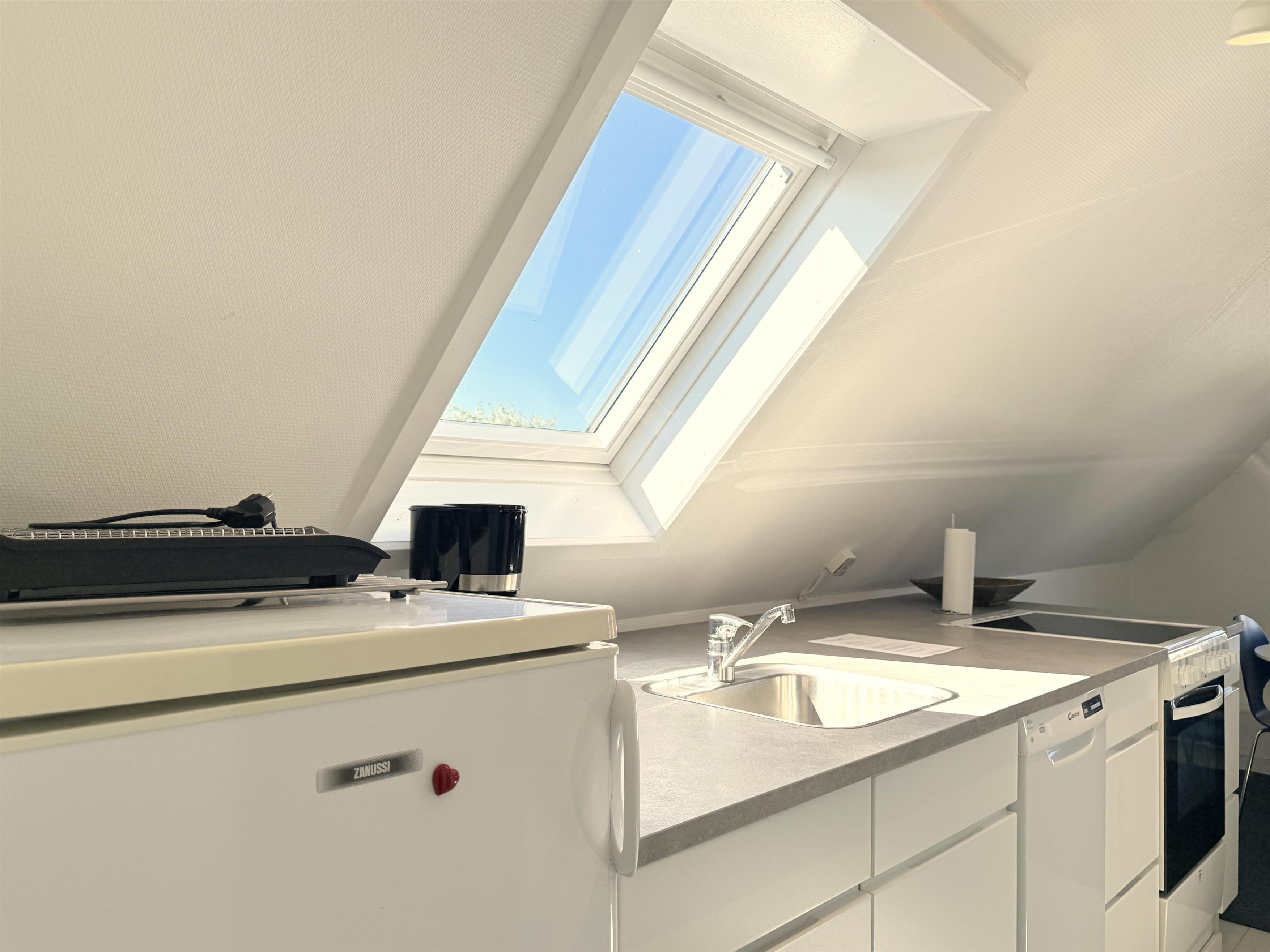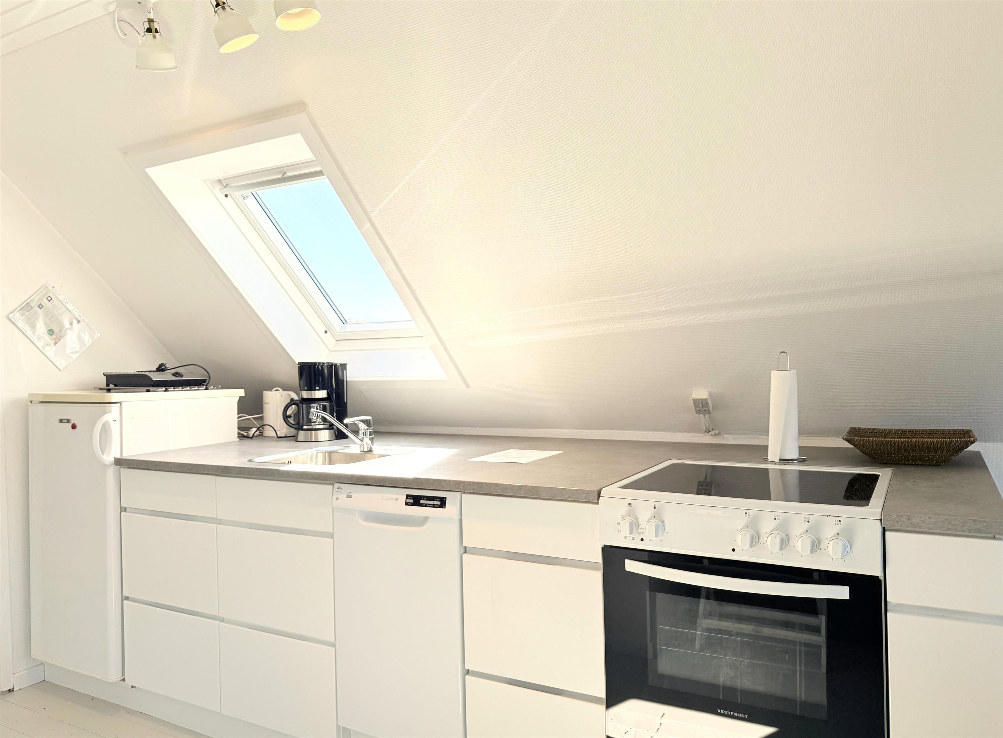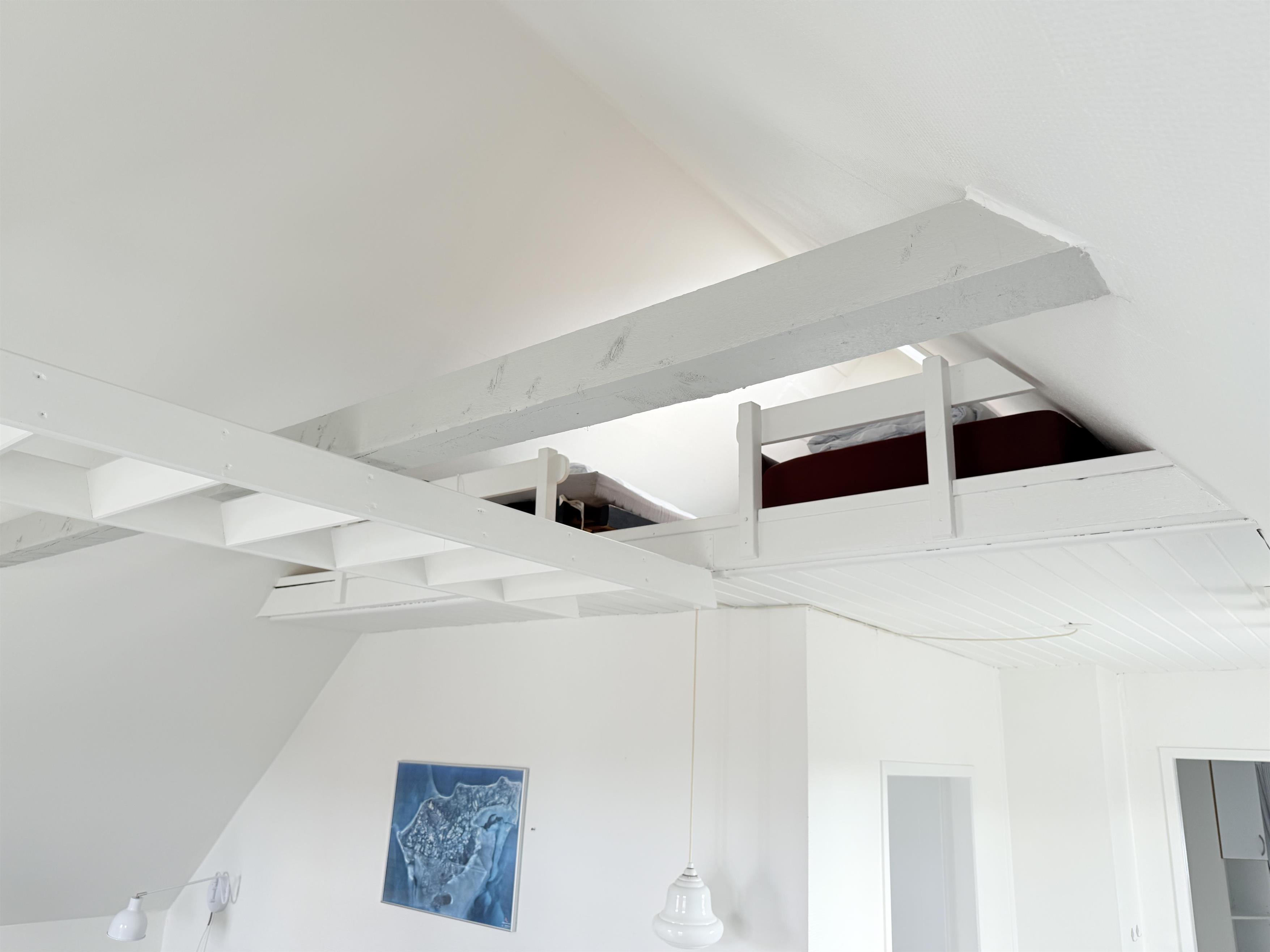 Die Wohnung bietet eine offene Küche mit Essbereich und eine gemütliche Sofaecke mit Fernseher und Chromecast. Sie verfügt über ein Schlafzimmer mit Doppelbett (140 cm) und einen Schlafboden mit zwei weiteren Betten. Es besteht die Möglichkeit, ein zusätzliches Bett auf dem Schlafsofa im Wohnzimmer aufzustellen. Schönes Badezimmer mit Dusche.