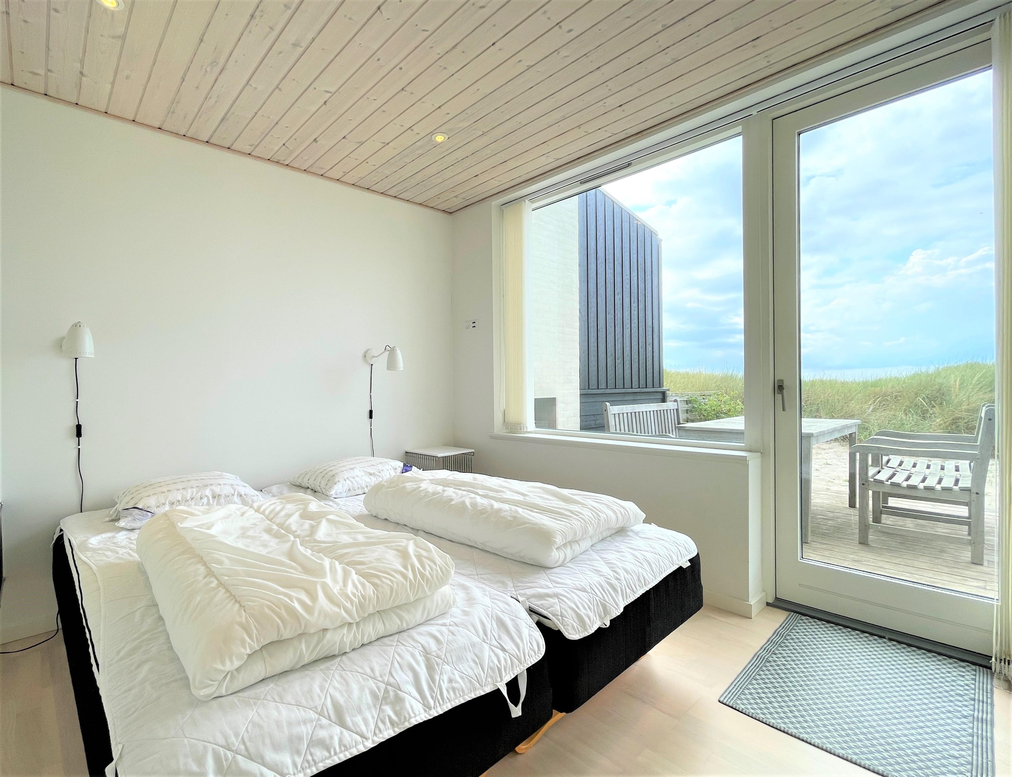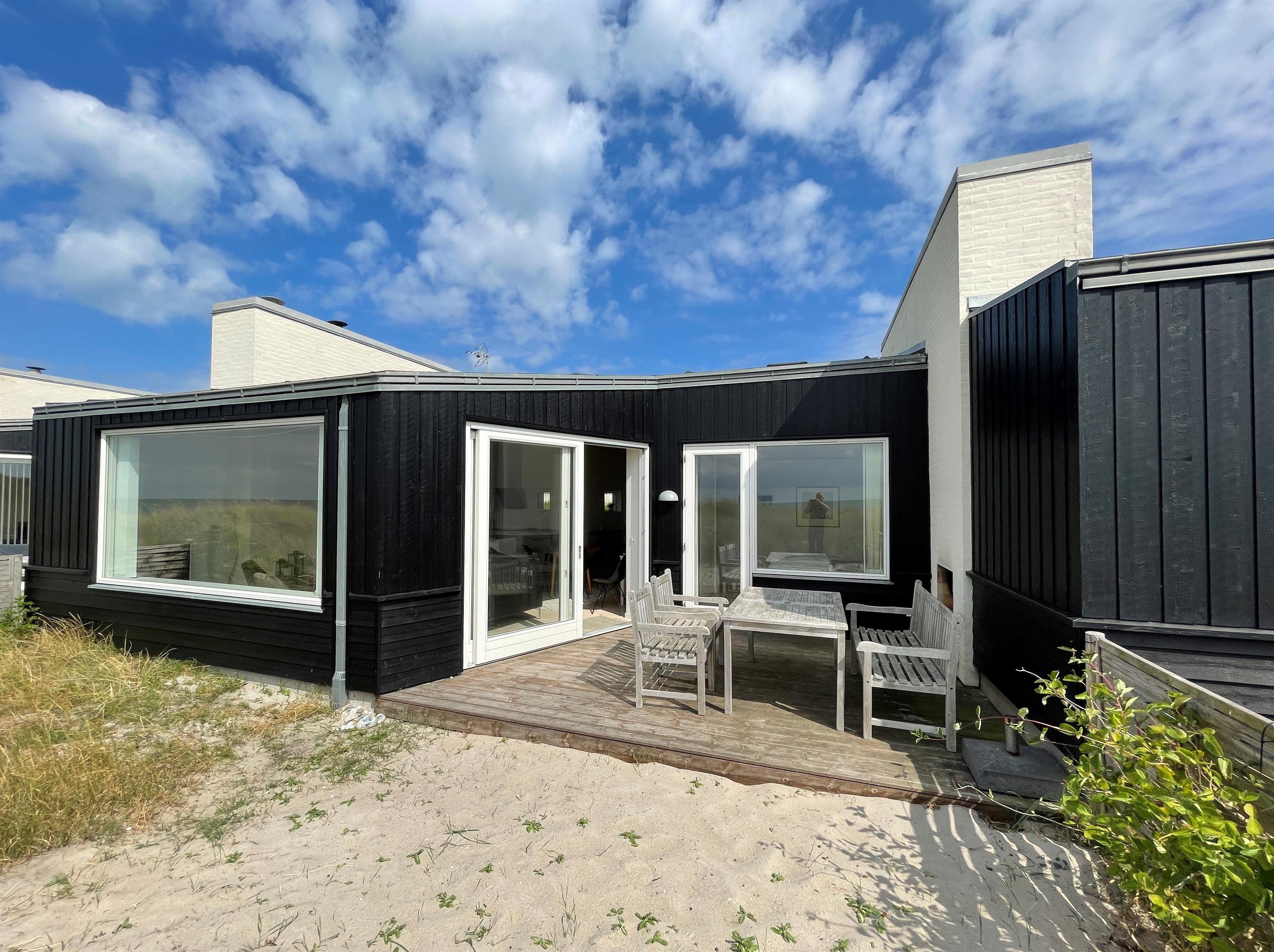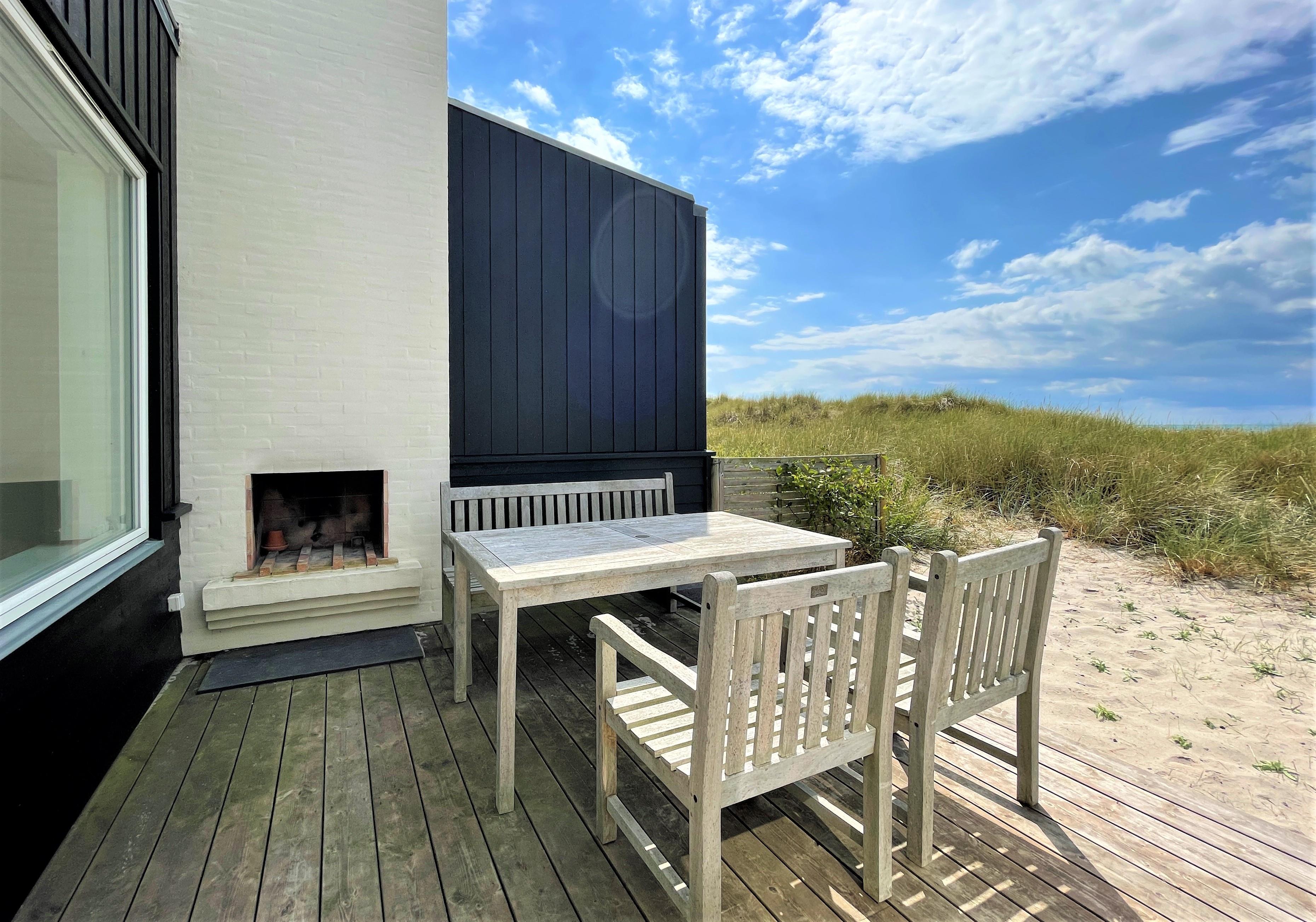 und Sofaecke mit einem eingebautem Kamin in der Wand. Das Haus hat 2 Schlafzimmer , eins mit Doppel und eines mit 2 Einzelbetten. Vom Schlafzimmer mit Doppelbett und vom Wohnzimmer, gibt es einen Ausgang zur Terasse mit Panoram-Meersicht. Via Ausgang steht man direkt inmitten von Strandgräser und Heckenrosen. Auf der Terrasse befindet sich einen Aussenkamin und bequemen Gartenmöbeln. Eine nach Osten gewandte Terrasse auf der einen Seite des Hauses. Grosses helles Badezimmer mit Dusche.