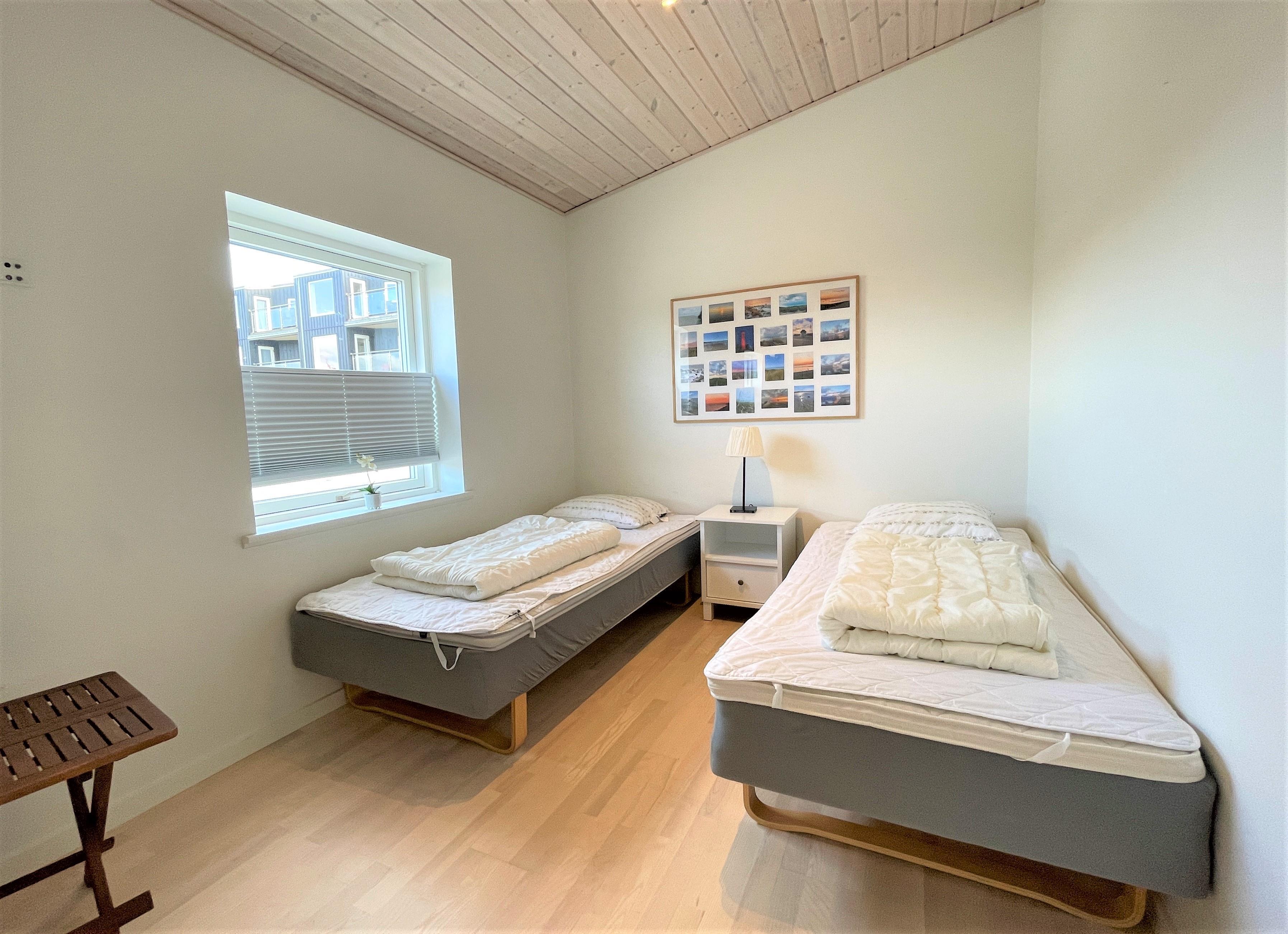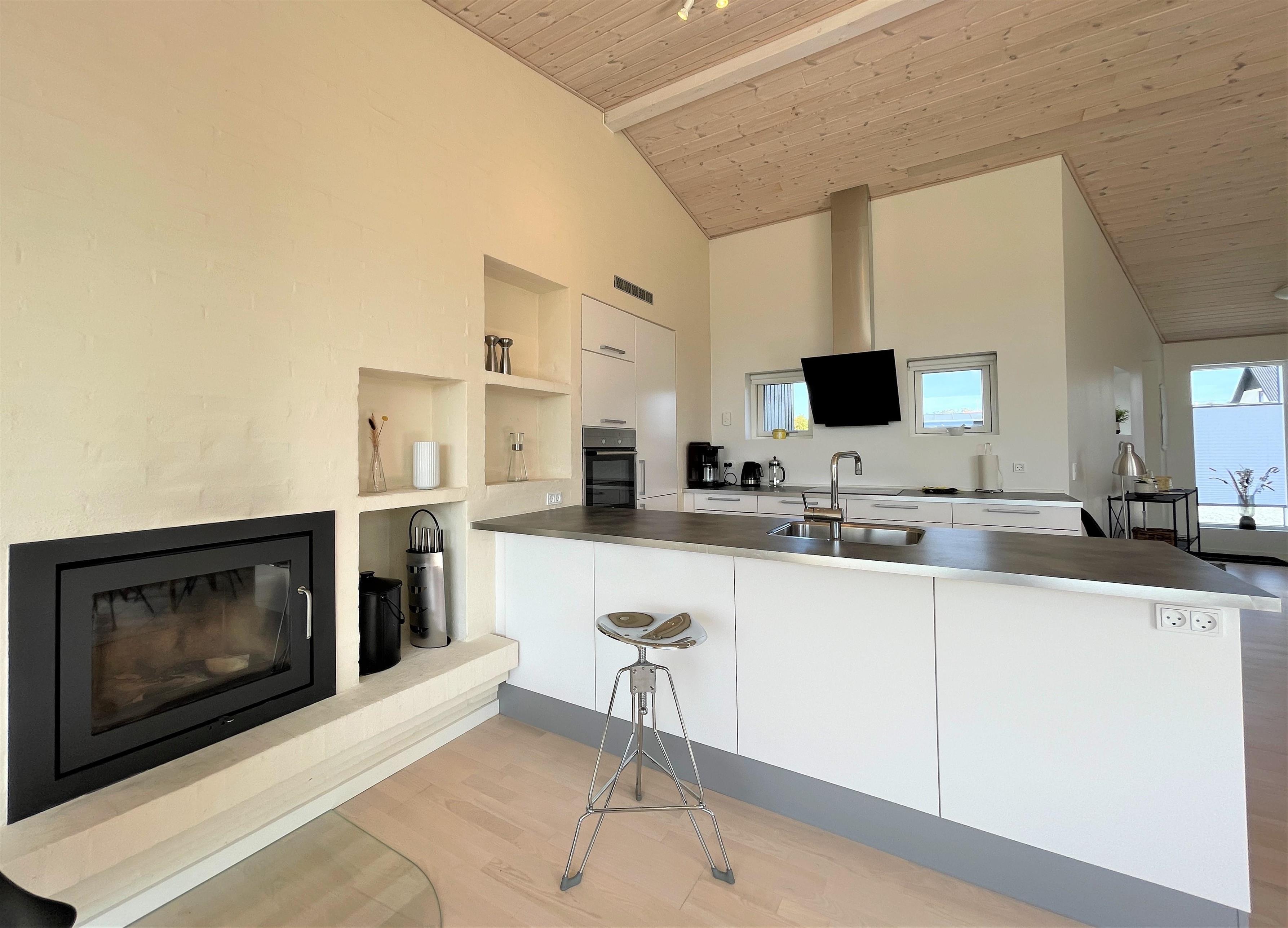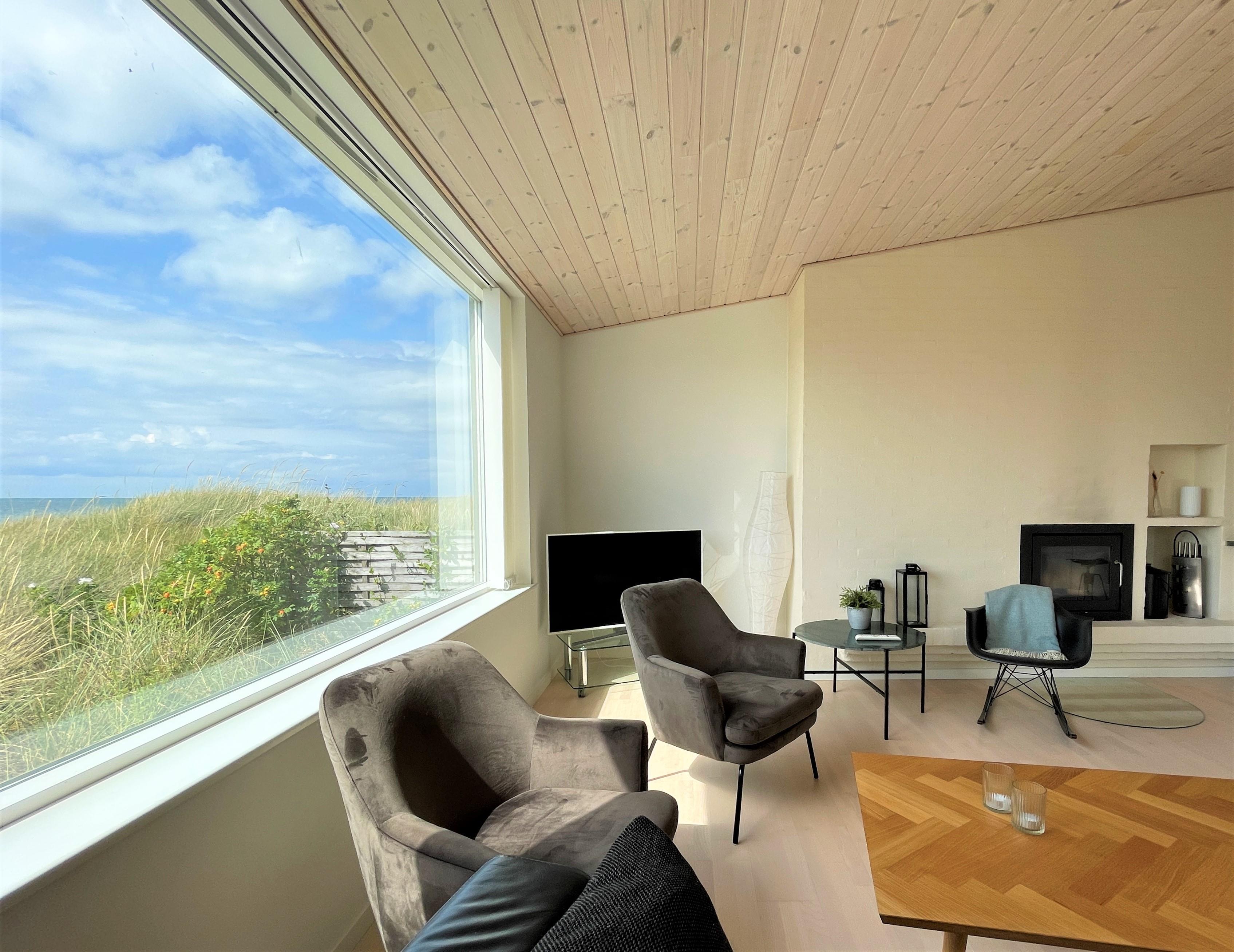 und Sofaecke mit einem eingebautem Kamin in der Wand. Das Haus hat 2 Schlafzimmer , eins mit Doppel und eines mit 2 Einzelbetten. Vom Schlafzimmer mit Doppelbett und vom Wohnzimmer, gibt es einen Ausgang zur Terasse mit Panoram-Meersicht. Via Ausgang steht man direkt inmitten von Strandgräser und Heckenrosen. Auf der Terrasse befindet sich einen Aussenkamin und bequemen Gartenmöbeln. Eine nach Osten gewandte Terrasse auf der einen Seite des Hauses. Grosses helles Badezimmer mit Dusche.