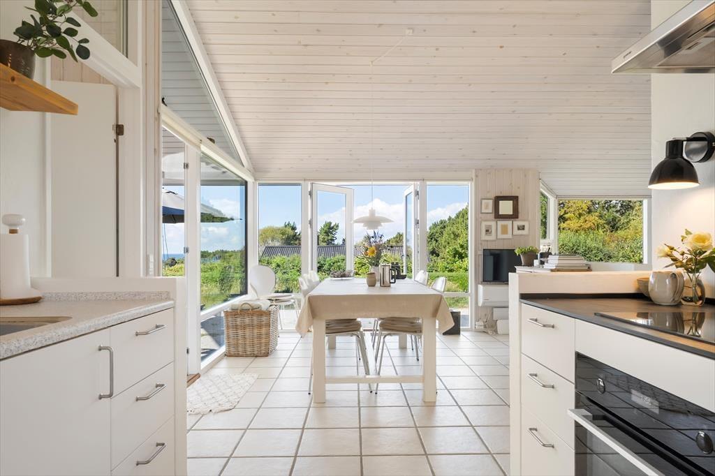 Træd ind i et lyst og indbydende feriehus, hvor store vinduespartier mod syd og vest lader solens stråler fylde rummene med varme og lys. Det åbne alrum kombinerer stue og køkken i en harmonisk enhed, hvor moderne faciliteter som opvaskemaskine og kaffemaskine gør det nemt at nyde feriens små glæder.