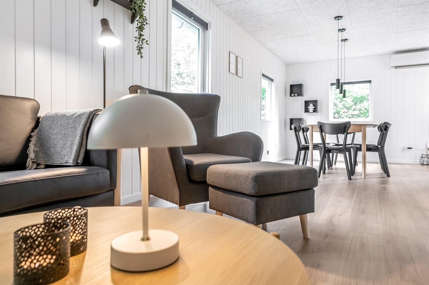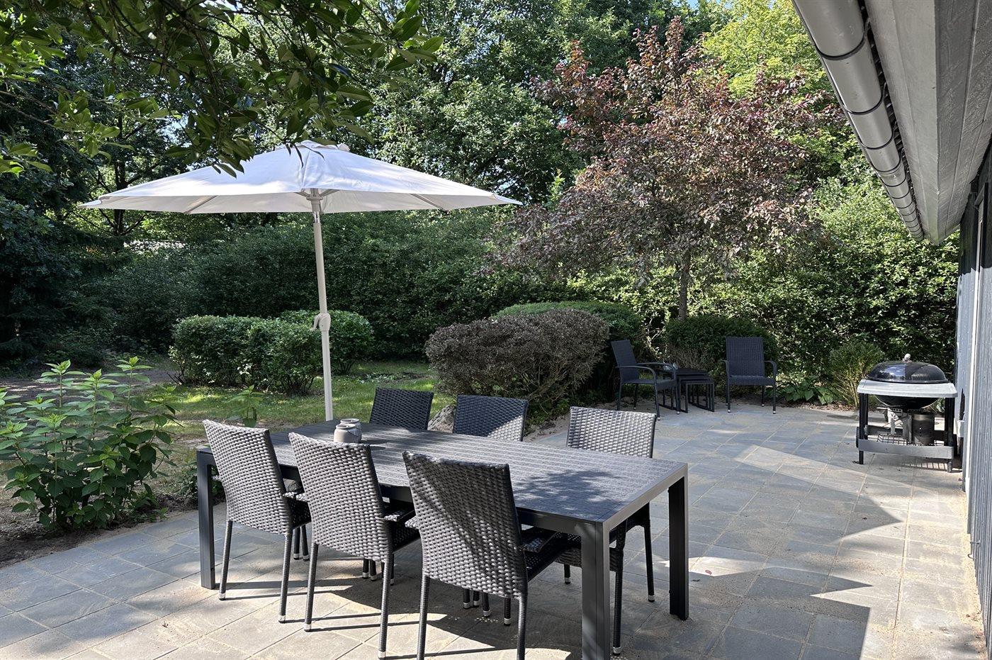 Modernes, helles Ferienhaus in ruhiger Natur mit Garten, Terrasse und Elektroauto-Ladestation in Give, Dänemark.