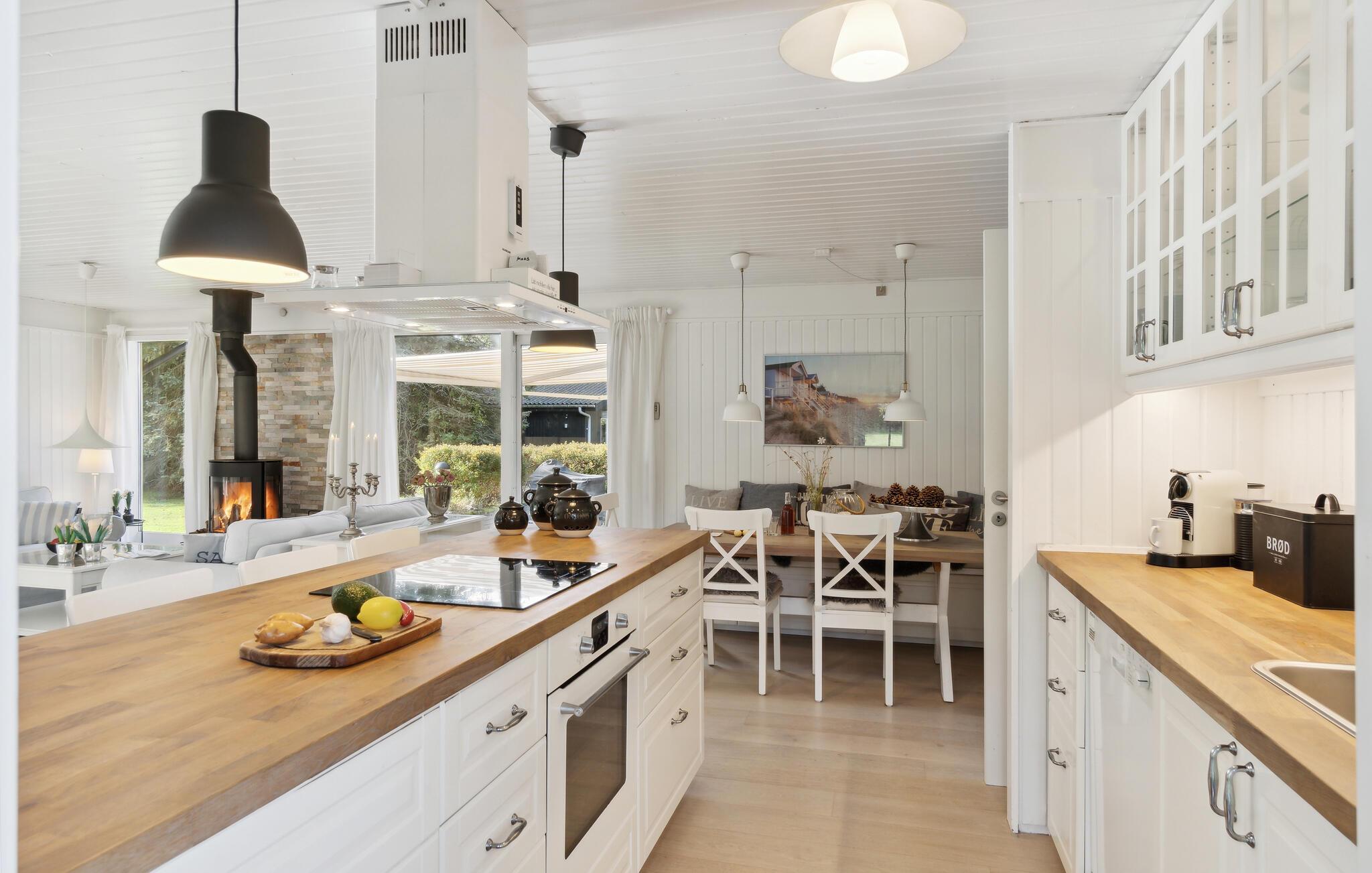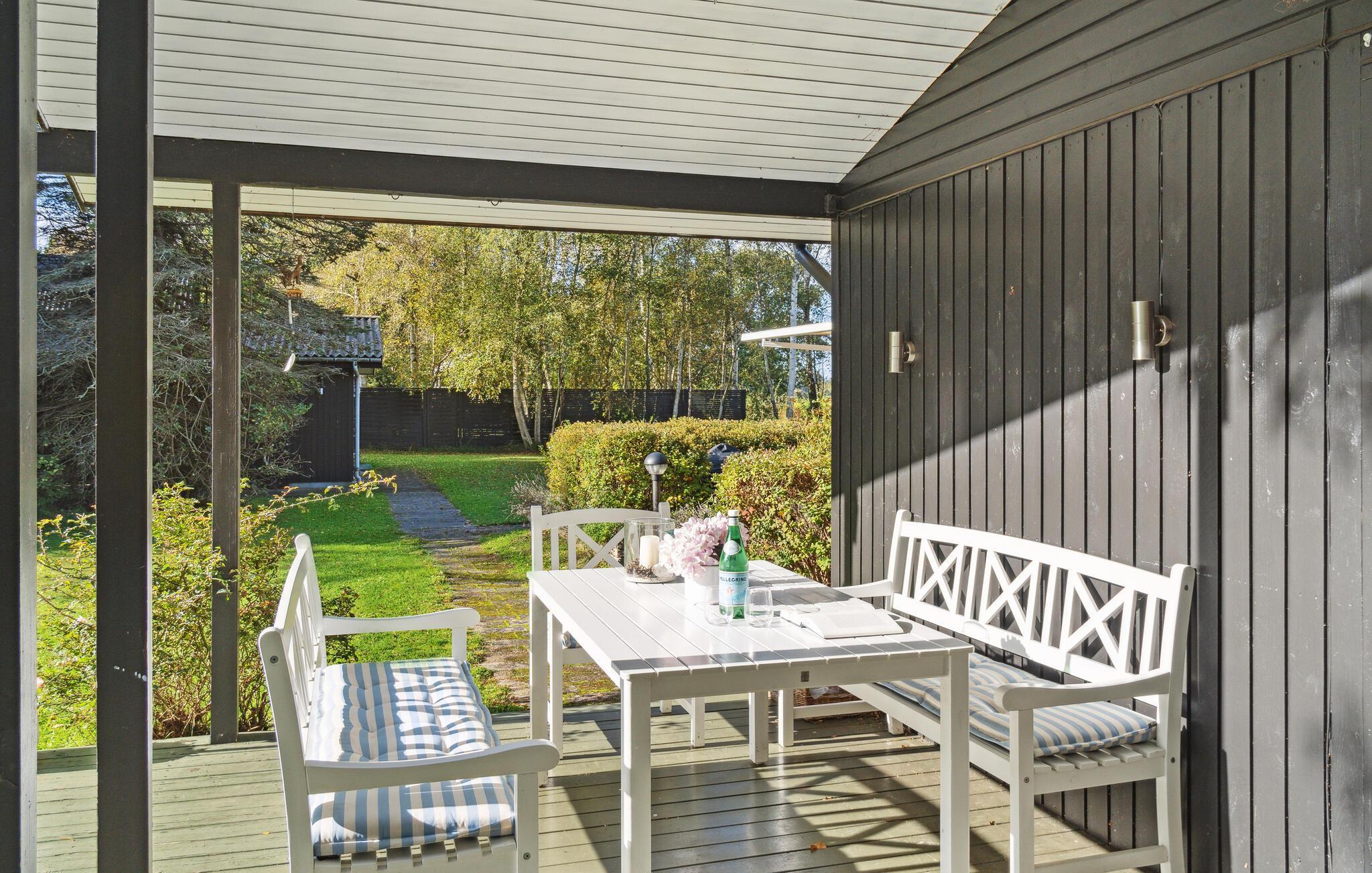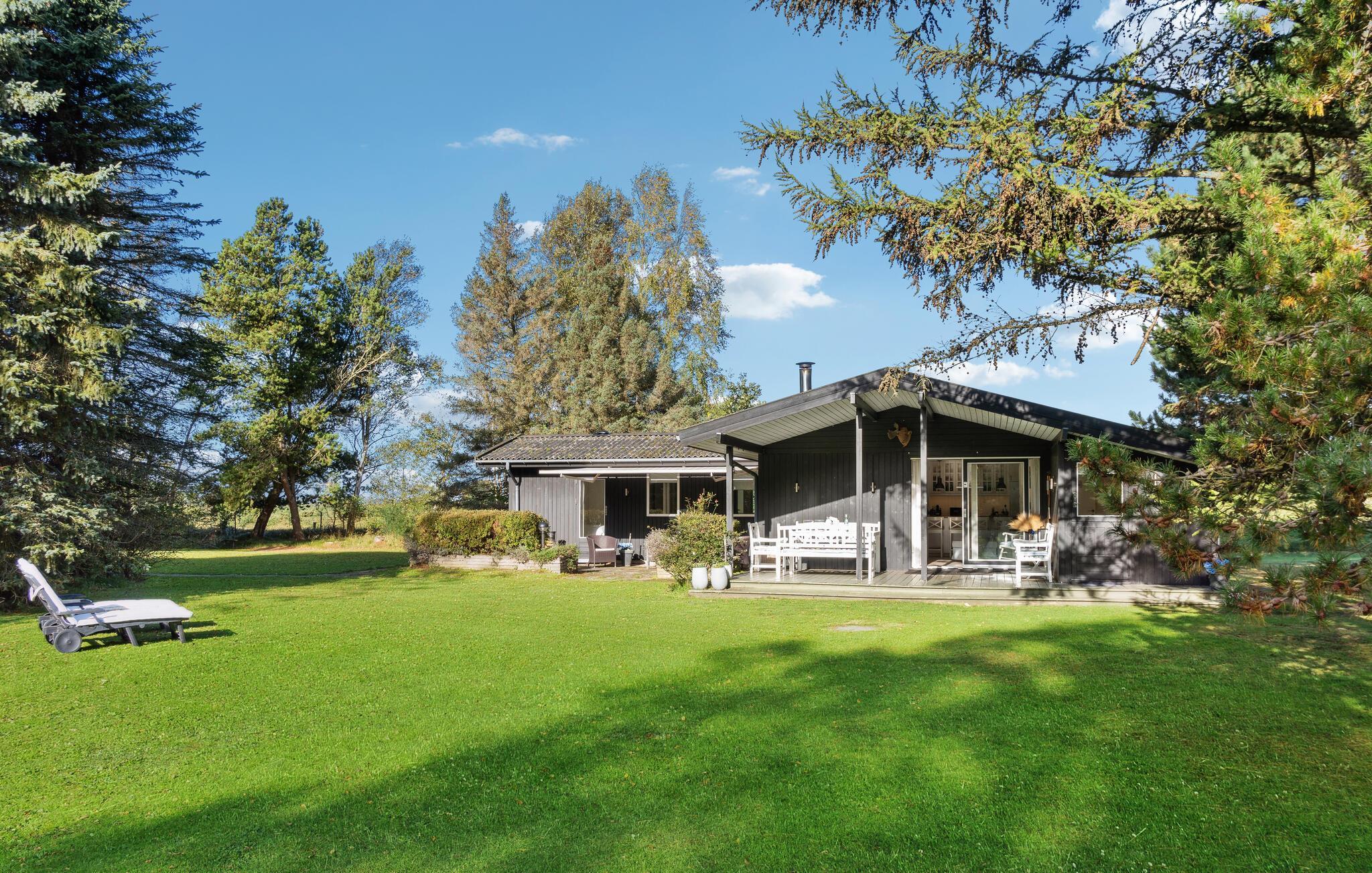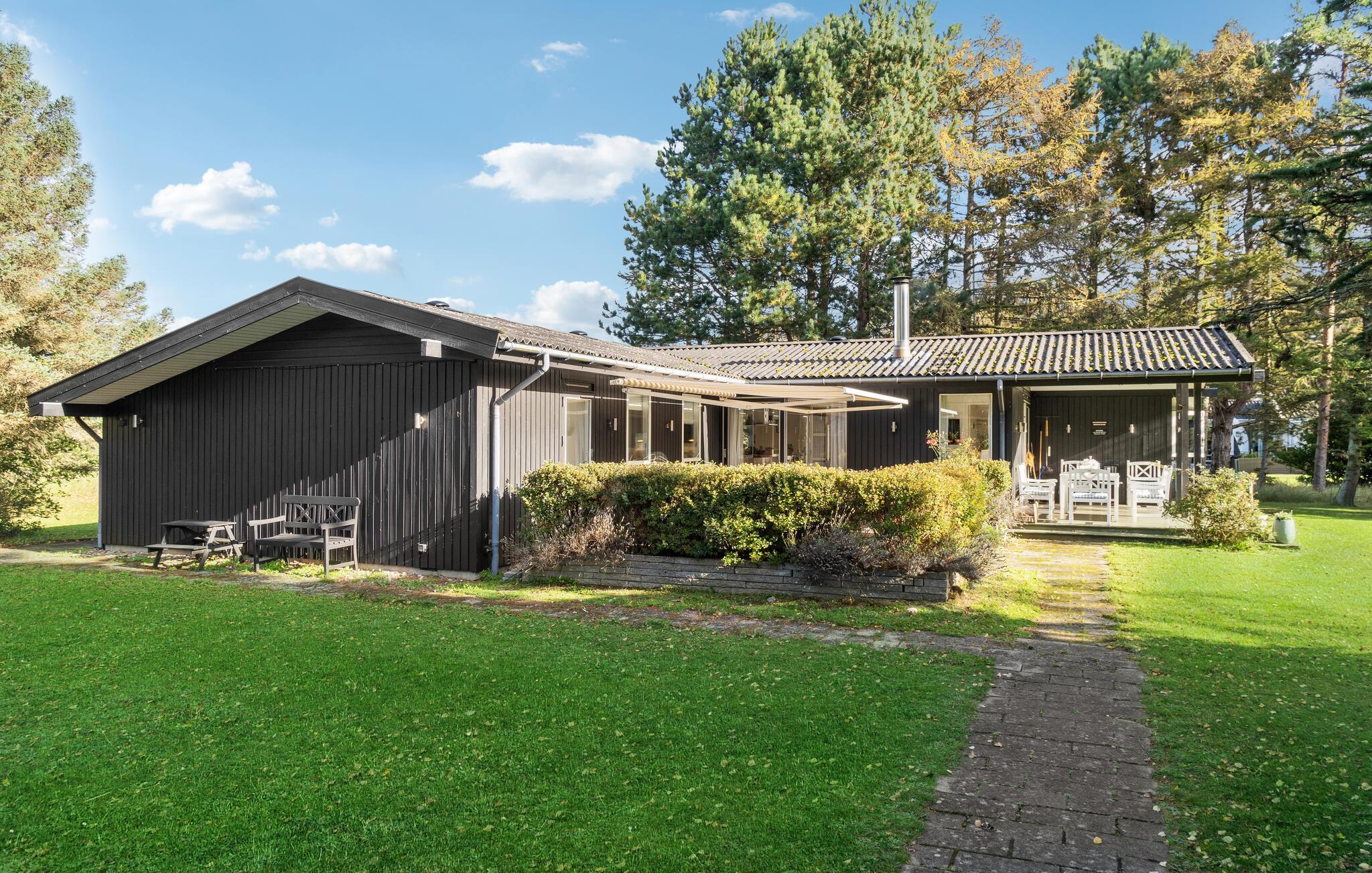 Gemütliches Holzferienhaus nahe Vester Lyng Strand mit Garten, Kamin und moderner Ausstattung für erholsame Familienzeit.